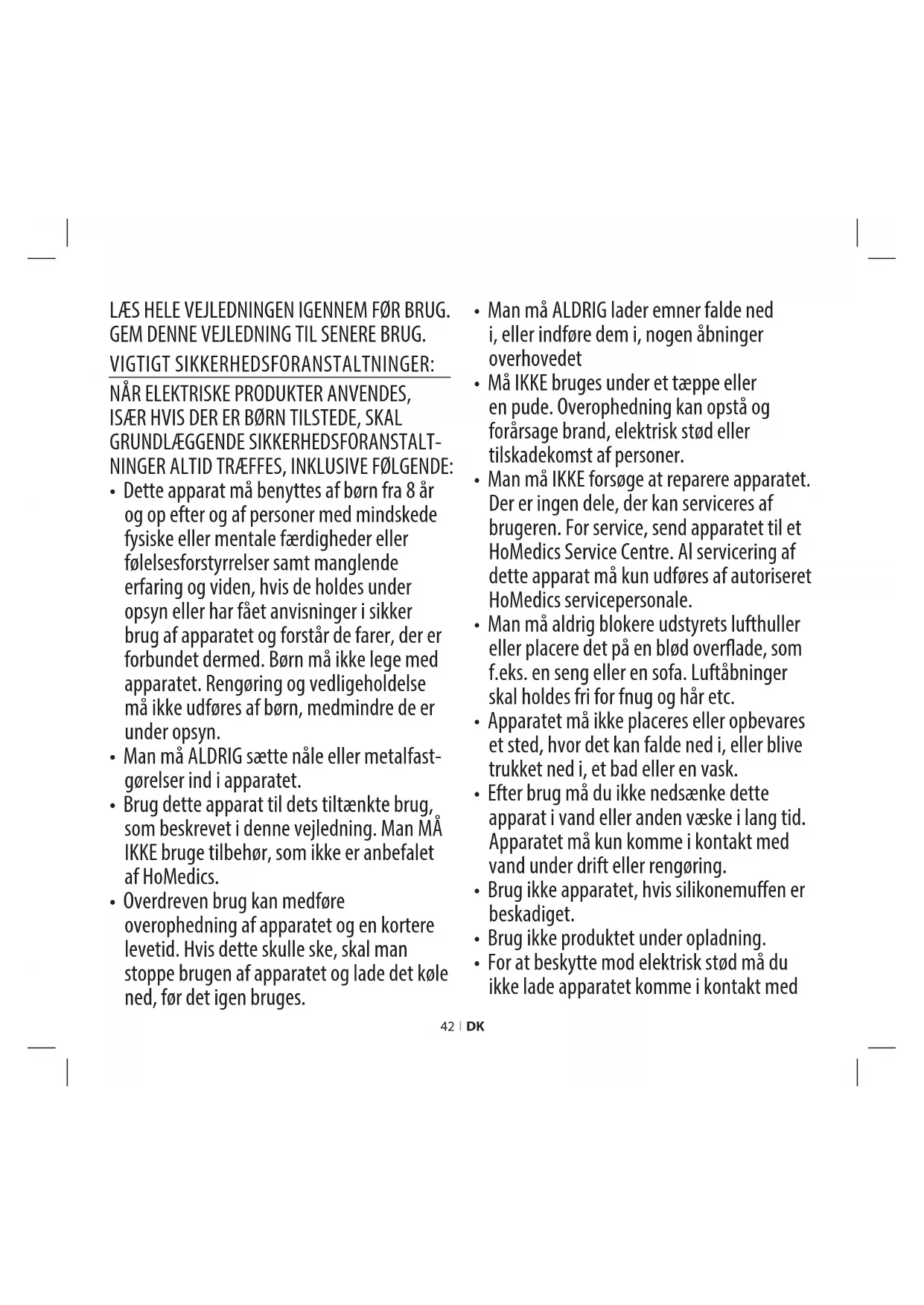 - Man må IKKE forsøge at reparere apparatet. Der er ingen dele, der kan serviceres af brugeren. For service, send apparatet til et HoMedics Service Centre. Al servicering af dette apparat må kun udføres af autoriseret HoMedics servicepersonale.