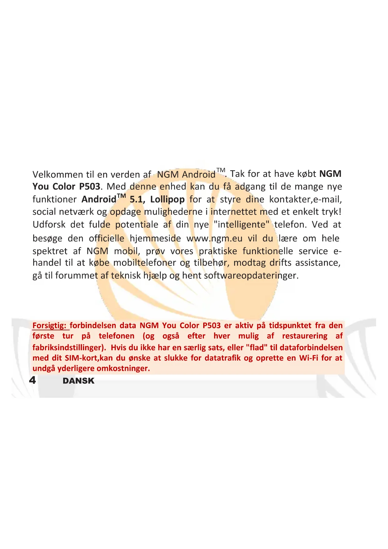 Velkommen til en verden af NGM Android™. Tak for at have købt NGM You Color P503. Med这部分Enhed kan du fã adgang til de mange nye Funktioner Android™ 5.1, Lollipop for at styre dine kontakter,e-mail, social netværk og opdage mulighederne i internettet med et,enkelt tryk! Udforsk det fulde potentiale af din nye "intelligente" Telefon. Ved at besøge den officielle hjemmeside www.ngm.eu vil du lære om helespektret af NGM mobil, prov vores praktiske funkctionelle service ehandel til at købe mobiltelefoner og tilbehør, modtag drifts assistance, gã til forummet af tekisk hjælp og hent softwareopdateringer.