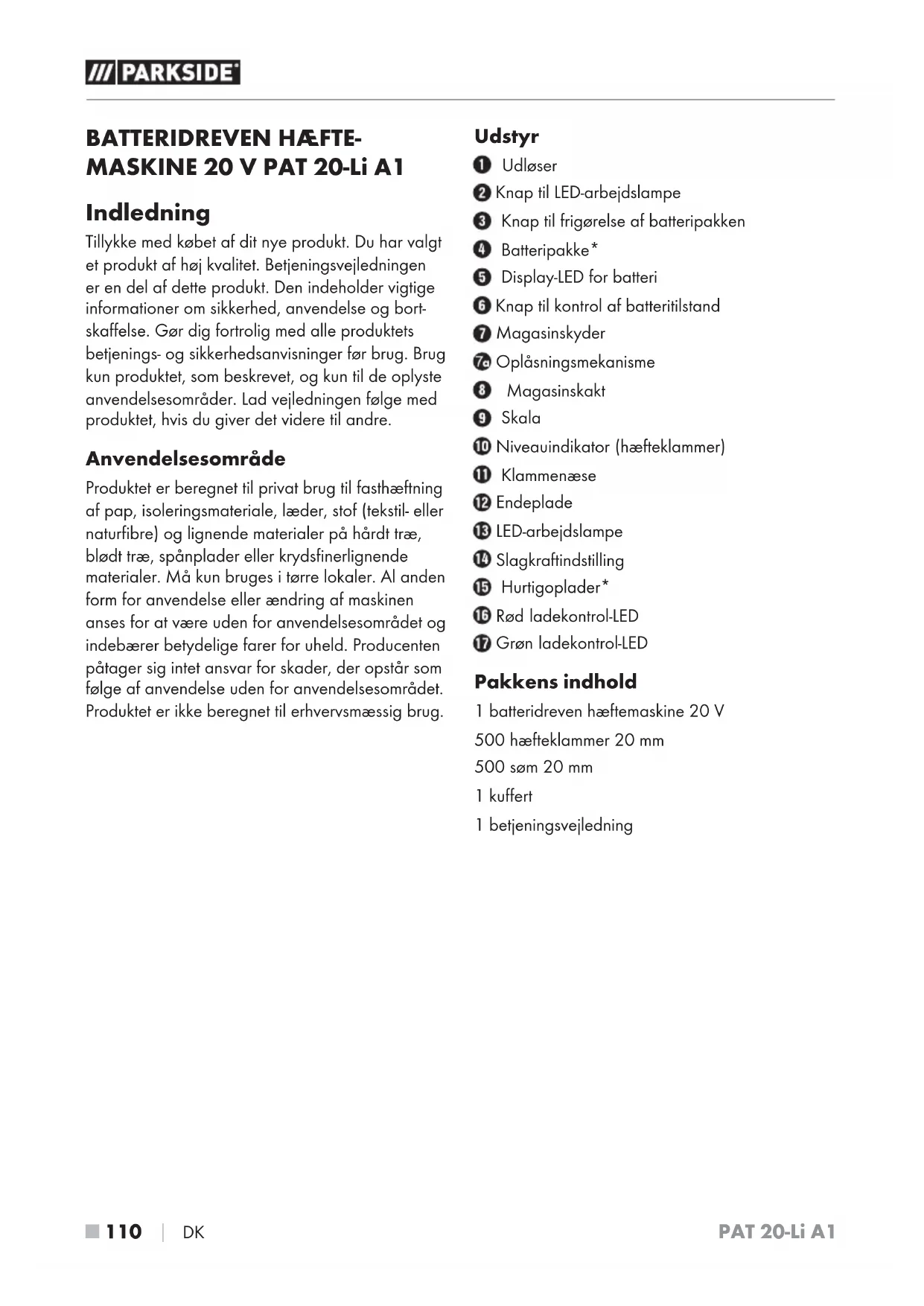 MASKINE 20 V PAT 20-Li A1 Indledning Tillykke med købet af dit nye produkt. Du har valgt et produkt af høj kvalitet. Betjeningsvejledningen er en del af dette produkt. Den indeholder vigtige informationer om sikkerhed, anvendelse og bort- skaffelse. Gør dig fortrolig med alle produktets betjenings- og sikkerhedsanvisninger før brug. Brug kun produktet, som beskrevet, og kun til de oplyste anvendelsesområder. Lad vejledningen følge med produktet, hvis du giver det videre til andre. Anvendelsesområde Produktet er beregnet til privat brug til fasthæftning af pap, isoleringsmateriale, læder, stof (tekstil- eller naturfibre) og lignende materialer på hårdt træ, blødt træ, spånplader eller krydsfinerlignende materialer. Må kun bruges i tørre lokaler. Al anden form for anvendelse eller ændring af maskinen anses for at være uden for anvendelsesområdet og indebærer betydelige farer for uheld. Producenten påtager sig intet ansvar for skader, der opstår som følge af anvendelse uden for anvendelsesområdet. Produktet er ikke beregnet til erhvervsmæssig brug. Udstyr Udløser Knap til LED-arbejdslampe Knap til frigørelse af batteripakken Batteripakke* Display-LED for batteri Knap til kontrol af batteritilstand Magasinskyder Oplåsningsmekanisme Magasinskakt Skala Niveauindikator (hæfteklammer) Klammenæse Endeplade LED-arbejdslampe Slagkraftindstilling Hurtigoplader* Rød ladekontrol-LED Grøn ladekontrol-LED Pakkens indhold 1 batteridreven hæftemaskine 20 V 500 hæfteklammer 20 mm 500 søm 20 mm 1 kuffert 1 betjeningsvejledning IB_373432_PAT20-LiA1_LB8.indb 110 13.10.2021 06:38:29PAT 20-Li A1 DK