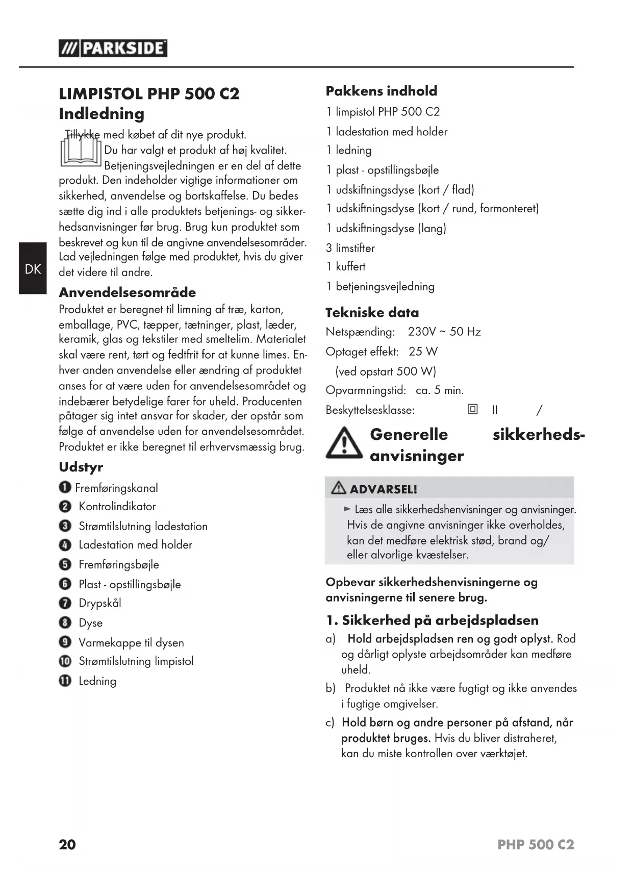 Indledning Tillykke med købet af dit nye produkt. Du har valgt et produkt af høj kvalitet. Betjeningsvejledningen er en del af dette produkt. Den indeholder vigtige informationer om sikkerhed, anvendelse og bortskaffelse. Du bedes sætte dig ind i alle produktets betjenings- og sikker- hedsanvisninger før brug. Brug kun produktet som beskrevet og kun til de angivne anvendelsesområder. Lad vejledningen følge med produktet, hvis du giver det videre til andre. Anvendelsesområde Produktet er beregnet til limning af træ, karton, emballage, PVC, tæpper, tætninger, plast, læder, keramik, glas og tekstiler med smeltelim. Materialet skal være rent, tørt og fedtfrit for at kunne limes. En- hver anden anvendelse eller ændring af produktet anses for at være uden for anvendelsesområdet og indebærer betydelige farer for uheld. Producenten påtager sig intet ansvar for skader, der opstår som følge af anvendelse uden for anvendelsesområdet. Produktet er ikke beregnet til erhvervsmæssig brug. Udstyr Fremføringskanal Kontrolindikator Strømtilslutning ladestation Ladestation med holder Fremføringsbøjle Plast - opstillingsbøjle Drypskål Dyse Varmekappe til dysen Strømtilslutning limpistol Ledning Pakkens indhold 1 limpistol PHP 500 C2 1 ladestation med holder 1 ledning 1 plast - opstillingsbøjle 1 udskiftningsdyse (kort / flad) 1 udskiftningsdyse (kort / rund, formonteret) 1 udskiftningsdyse (lang) 3 limstifter 1 kuffert 1 betjeningsvejledning Tekniske data Netspænding: 230V ∼ 50 Hz Optaget effekt: 25 W (ved opstart 500 W) Opvarmningstid: ca. 5 min. Beskyttelsesklasse: II / Generelle sikkerheds- anvisninger ADVARSEL! ► Læs alle sikkerhedshenvisninger og anvisninger. Hvis de angivne anvisninger ikke overholdes, kan det medføre elektrisk stød, brand og/ eller alvorlige kvæstelser. Opbevar sikkerhedshenvisningerne og anvisningerne til senere brug.