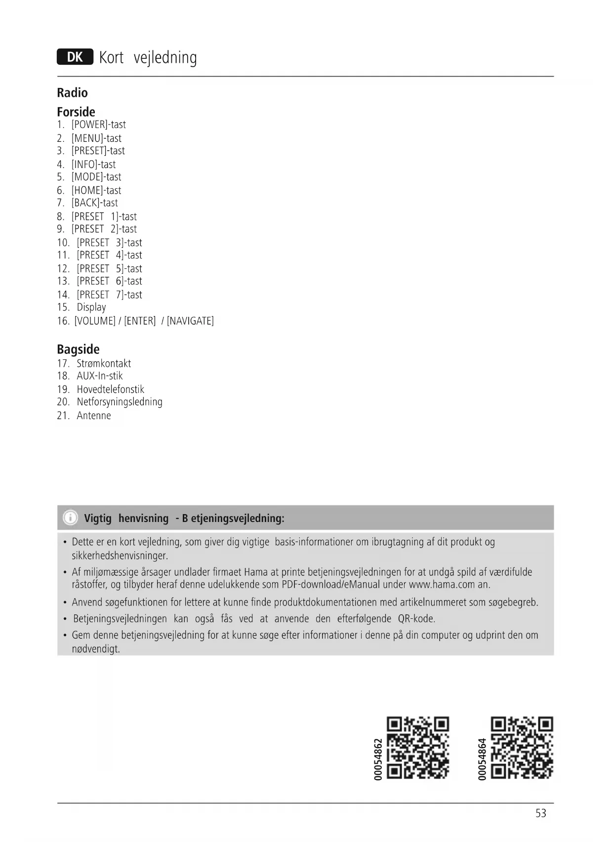 - Af miljømæssige årsager undlader rmaet Hama at printe betjeningsvejledningen for at undgå spild af værdifulde råstoffer,ogtilbyder heraf denne udelukkende som PDF-download/eManual under www.hama.com an.
