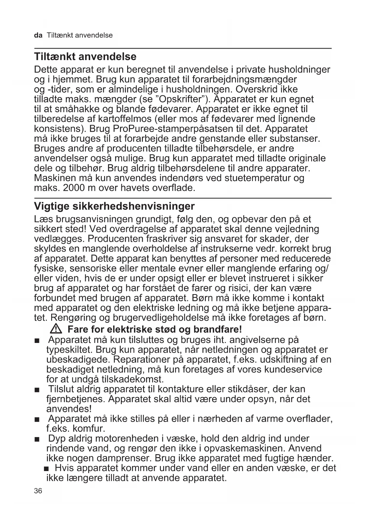 - altijd uw aankoopbewijs nodig. Wijzigingen voorbehouden.36 da Tiltænkt anvendelse Tiltænkt anvendelse Dette apparat er kun beregnet til anvendelse i private husholdninger og i hjemmet. Brug kun apparatet til forarbejdningsmængder og -tider, som er almindelige i husholdningen. Overskrid ikke tilladte maks. mængder (se ”Opskrifter”). Apparatet er kun egnet til at småhakke og blande fødevarer. Apparatet er ikke egnet til tilberedelse af kartoffelmos (eller mos af fødevarer med lignende konsistens). Brug ProPuree-stamperpåsatsen til det. Apparatet må ikke bruges til at forarbejde andre genstande eller substanser. Bruges andre af producenten tilladte tilbehørsdele, er andre anvendelser også mulige. Brug kun apparatet med tilladte originale dele og tilbehør. Brug aldrig tilbehørsdelene til andre apparater. Maskinen må kun anvendes indendørs ved stuetemperatur og maks. 2000 m over havets overflade. Vigtige sikkerhedshenvisninger Læs brugsanvisningen grundigt, følg den, og opbevar den på et sikkert sted! Ved overdragelse af apparatet skal denne vejledning vedlægges. Producenten fraskriver sig ansvaret for skader, der skyldes en manglende overholdelse af instrukserne vedr. korrekt brug af apparatet. Dette apparat kan benyttes af personer med reducerede fysiske, sensoriske eller mentale evner eller manglende erfaring og/ eller viden, hvis de er under opsigt eller er blevet instrueret i sikker brug af apparatet og har forstået de farer og risici, der kan være forbundet med brugen af apparatet. Børn må ikke komme i kontakt med apparatet og den elektriske ledning og må ikke betjene appara- tet. Rengøring og brugervedligeholdelse må ikke foretages af børn. W Fare for elektriske stød og brandfare! ■ Apparatet må kun tilsluttes og bruges iht. angivelserne på typeskiltet. Brug kun apparatet, når netledningen og apparatet er ubeskadigede. Reparationer på apparatet, f.eks. udskiftning af en beskadiget netledning, må kun foretages af vores kundeservice for at undgå tilskadekomst. ■ Tilslut aldrig apparatet til kontakture eller stikdåser, der kan fjernbetjenes. Apparatet skal altid være under opsyn, når det anvendes! ■ Apparatet må ikke stilles på eller i nærheden af varme overflader, f.eks. komfur. ■ Dyp aldrig motorenheden i væske, hold den aldrig ind under rindende vand, og rengør den ikke i opvaskemaskinen. Anvend ikke nogen damprenser. Brug ikke apparatet med fugtige hænder. ■ Hvis apparatet kommer under vand eller en anden væske, er det ikke længere tilladt at anvende apparatet.37 da Vigtige sikkerhedshenvisninger ■ Blenderfoden må maksimalt dyppes ned i fødevarerne indtil markeringen Í, da der ellers er fare for elektrisk stød! ■ Apparatet skal efter hver brug, når det ikke er under opsyn, altid afbrydes fra strømnettet, før det samles, adskilles eller rengøres og i tilfælde af fejl. W Fare for tilskadekomst! ■ Apparatet skal efter hver brug, når det ikke er under opsyn, altid afbrydes fra strømnettet, før det samles, adskilles eller rengøres og i tilfælde af fejl. ■ Drevet kører stadig lidt kort efter, at apparatet er slukket. Vent, til drevet står helt stille. ■ Grib aldrig ind i blenderfodkniven. Rengør aldrig blenderfodkniven med de bare fingre. W Fare for skoldning! Forsigtig ved forarbejdning af varme fødevarer. Varme fødevarer kan sprøjte ved forarbejdningen. W Kvælningsfare! Lad ikke børn lege med emballagen. W Bemærk! ■ Det anbefales, at apparatet kun er tændt, så længe fødevarerne forarbejdes. Brug ikke apparatet i tomgang. ■ Blenderbægeret er ikke egnet til brug i mikrobølgeovnen. ■ Stil aldrig blenderfoden på varme overflader eller ned i meget varme fødevarer. Lad kogende fødevarer afkøle til mindst 80 °C før forarbejdning. Skal blenderen bruges i en varm gryde, skal gryden fjernes fra kogepladen, før blenderen tages i brug. W Vigtigt! Rengør altid apparatet grundigt efter hver brug eller efter længere tid, hvor det ikke har været i brug. X ”Pleje og daglig rengøring” se side 4038 da Indhold Tillykke med købet af dit nye apparat fra firmaet Bosch. Flere informationer om vores produkter findes på vores internetside. Anvendelse af brugsanvisningen: Brugsanvisningens omslag kan klappes ud. Her findes illustrationer mærket med bogstaver og numre, der henviser til en nærmere beskrivelse i brugsanvisningen (f.eks. X Billedrække B). Indhold Tiltænkt anvendelse p. 36