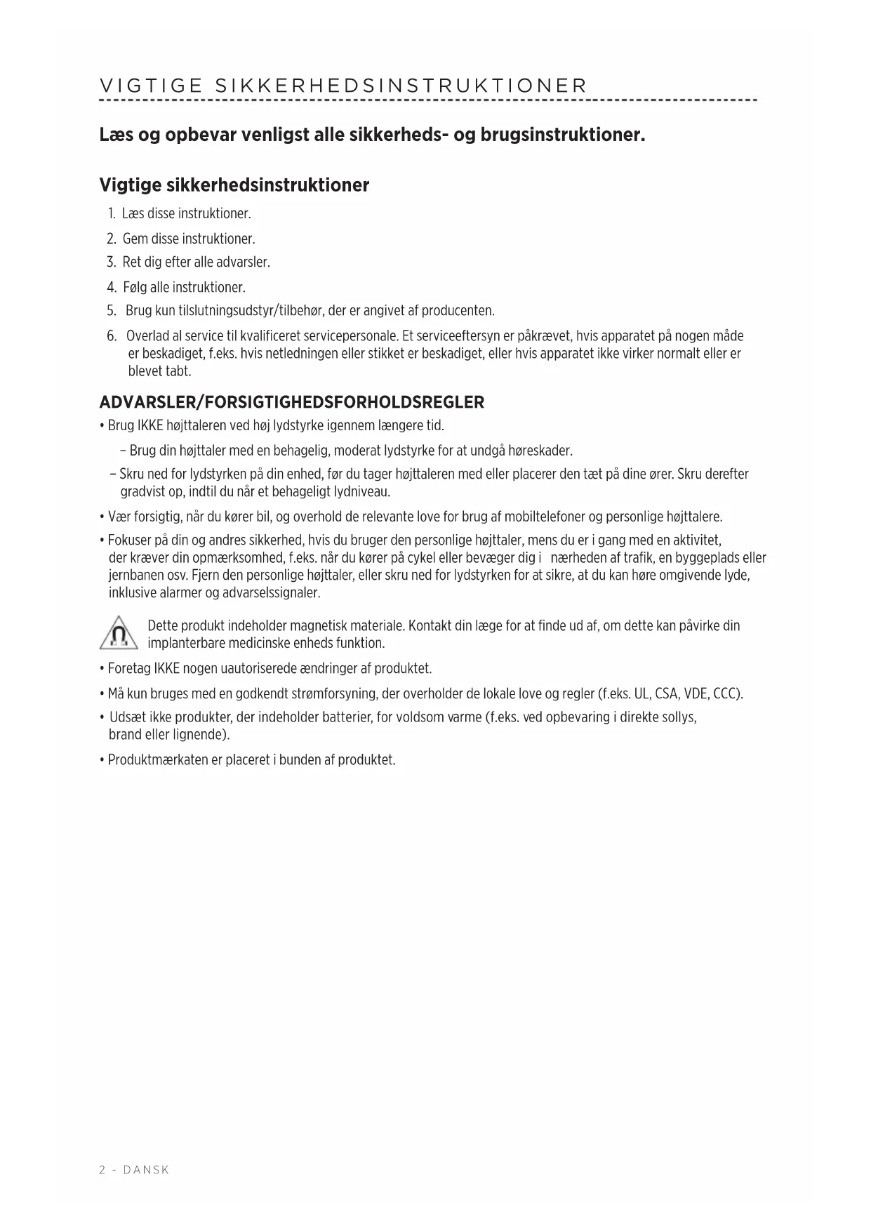 - Fokuser på din og andres sikkerhed, hvis du bruger den personlige højttaler, mens du er i gang med en aktivitet, derkræver din opmærksomhed, f.eks. når du kører på cykel eller bevæger dig i nærheden af trafik, en byggeplads eller jernbanen osv. Fjern den personlige højttaler, eller skru ned for lydstyrken for at sikre, at du kan høre omgivende lyde, inklusive alarmer og advarselssignaler. Dette produkt indeholder magnetisk materiale. Kontakt din læge for at finde ud af, om dette kan påvirke din implanterbare medicinske enheds funktion.