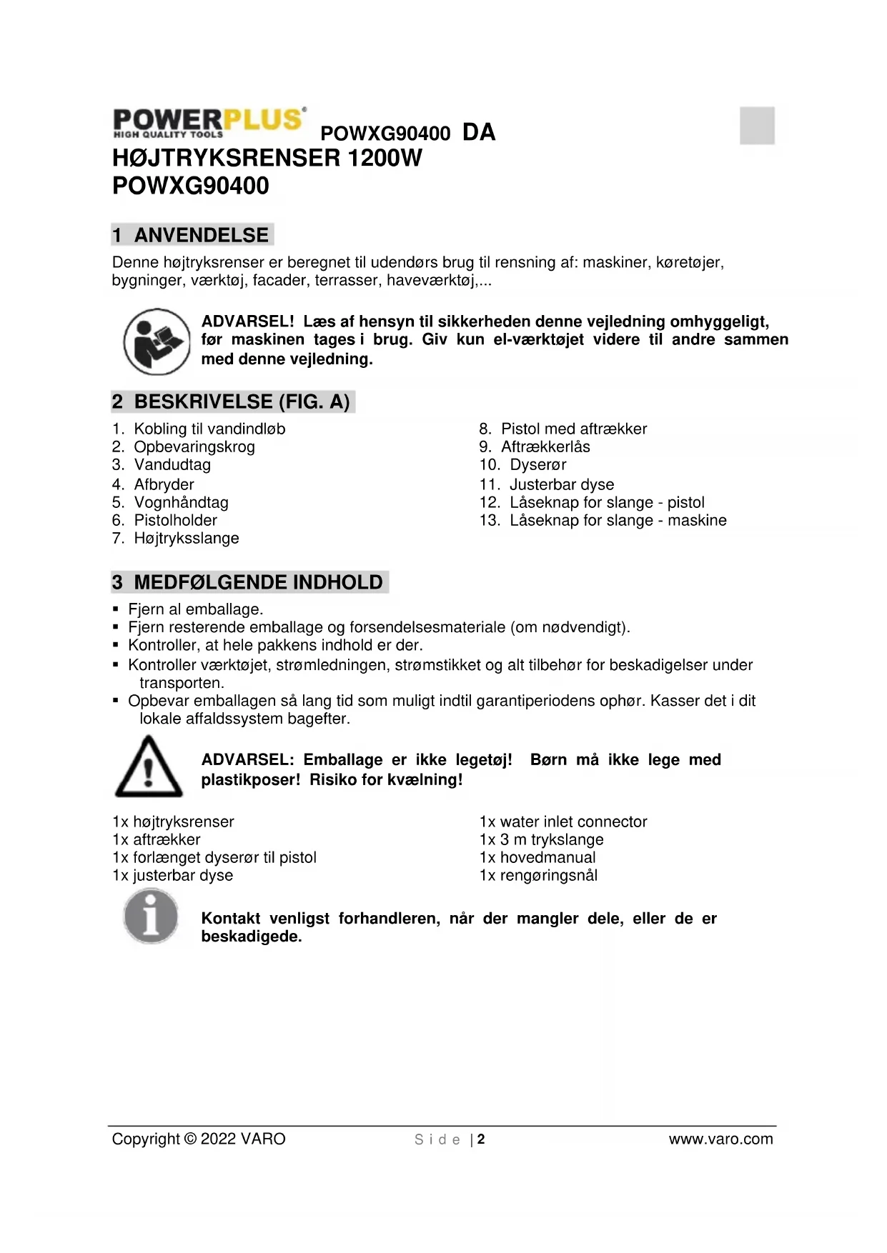 - Opbevar emballagen så lang tid som muligt indtil garantiperiodens ophør. Kasser det i dit lokale affaldssystem bagefter. ADVARSEL: Emballage er ikke legetøj! Børn må ikke lege med plastikposer! Risiko for kvælning! 1x højtryksrenser 1x aftrækker 1x forlænget dyserør til pistol 1x justerbar dyse 1x water inlet connector 1x 3 m trykslange 1x hovedmanual 1x rengøringsnål Kontakt venligst forhandleren, når der mangler dele, eller de er beskadigede.POWXG90400 DA Copyright © 2022 VARO S i d e | 3 www.varo.com