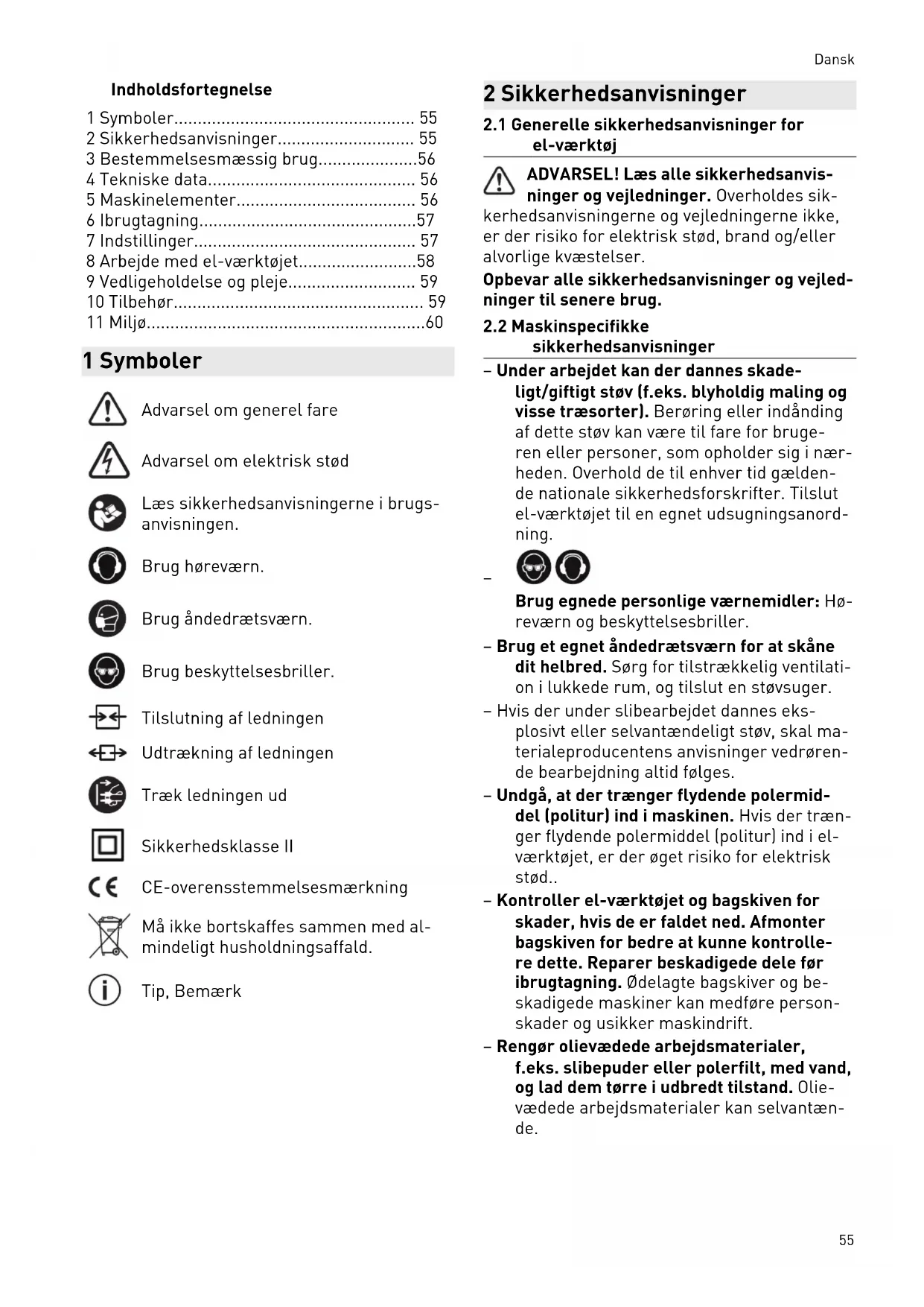 Brug egnede personlige værnemidler: Hø reværn og beskyttelsesbriller. – Brug et egnet åndedrætsværn for at skåne dit helbred. Sørg for tilstrækkelig ventilati on i lukkede rum, og tilslut en støvsuger. – Hvis der under slibearbejdet dannes eks plosivt eller selvantændeligt støv, skal ma terialeproducentens anvisninger vedrøren de bearbejdning altid følges. – Undgå, at der trænger flydende polermid del (politur) ind i maskinen. Hvis der træn ger flydende polermiddel (politur) ind i el værktøjet, er der øget risiko for elektrisk stød.. – Kontroller el-værktøjet og bagskiven for skader, hvis de er faldet ned. Afmonter bagskiven for bedre at kunne kontrolle re dette. Reparer beskadigede dele før ibrugtagning. Ødelagte bagskiver og be skadigede maskiner kan medføre person skader og usikker maskindrift. – Rengør olievædede arbejdsmaterialer, f.eks. slibepuder eller polerfilt, med vand, og lad dem tørre i udbredt tilstand. Olie vædede arbejdsmaterialer kan selvantæn de. Dansk