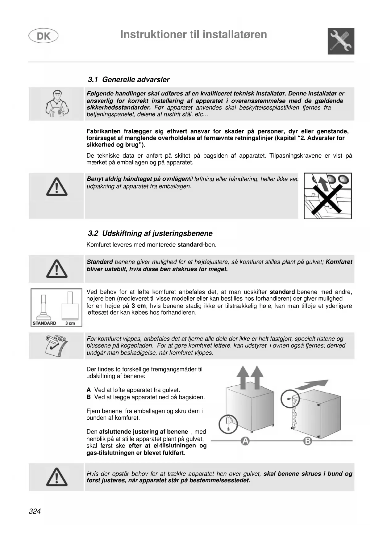 Standard-benene giver mulighed for at højdejustere, så komfuret stilles plant på gulvet; Komfuret bliver ustabilt, hvis disse ben afskrues for meget.