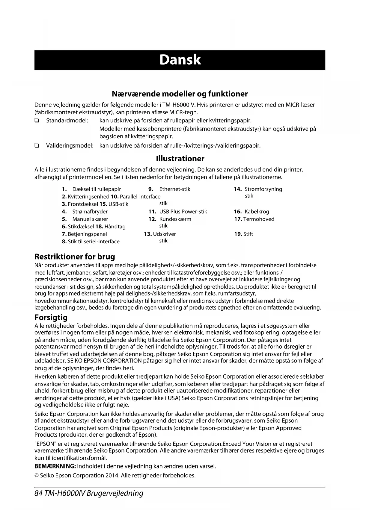 Hverken koberen af dette produit erller tredjepart kan holde Seiko Epson Corporation erler associerede selskaber ansvarlige for skader, tab, omkostninger erller udgifter, som koberen erller tredjepart har padraget sig som flege af uheld, forkert brug erller misbrug af dette produit erller u autorisere de modifikationer, reparatoner erller ændringer af dette produit, ell hvis (gælder ikke i USA) Seiko Epson Corporations retningslinjer for betjening og vedligeholdelse ikke er fulgt nõje.