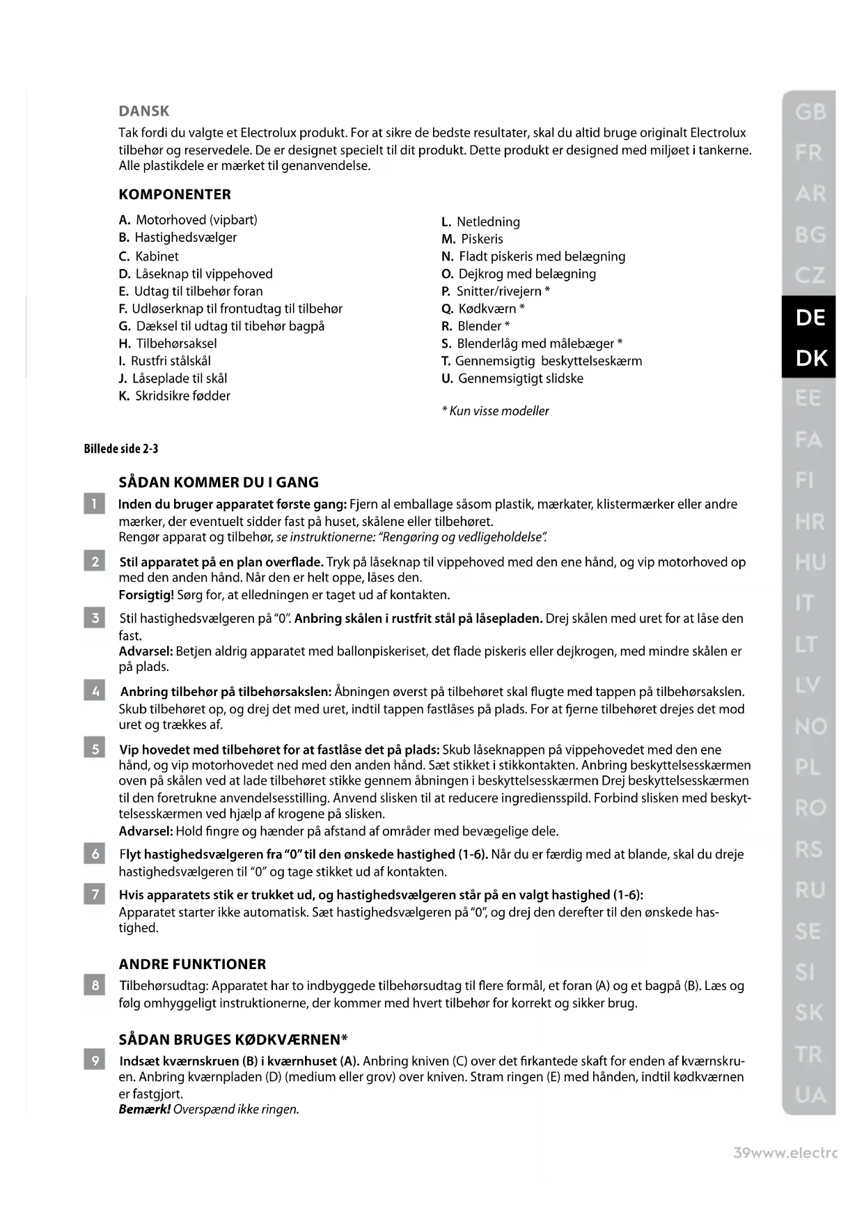17 Tag stikket ud af kontakten. Piskeris, kødhakker* og snitter/hakker* bør kun vaskes op i hånden med varmt sæbevand. Skål, adt piskeris og dejkrog kan vaskes i opvaskemaskinen. Placer kun dele på det øverste stativ, hvis du bruger en opvaskemaskine. Forsigtig! Klingerne og indsatserne er meget skarpe og kan forårsage personskade. Advarsel! Huset, stikket og ledningen må aldrig nedsænkes i vand eller anden væske. Tør hver del omhyggeligt inden brug. 18 Rengøring af blenderen*: Roter blenderen mod uret og ern den. Tag låget af. Hæld blandingen ud af blenderen. Tilsæt en dråbe opvaskemiddel og en liter varmt vand. Sæt blenderen på apparatet. Kør maskinen ved hastighed 6 i et halvt minut, og hæld derefter vandet ud. Skyl blenderen og lad den tørre. Forsigtig! Klingerne og indsatserne er meget skarpe og kan forårsage personskade. 19 Huset bør kun rengøres med en blød og fugtig klud og derefter tørres med en klud. Bemærk: Brug ikke skuremidler eller skuresvampe til at rengøre dit apparats overade. Nyd dit nye Electrolux produkt!41www.electrolux.com