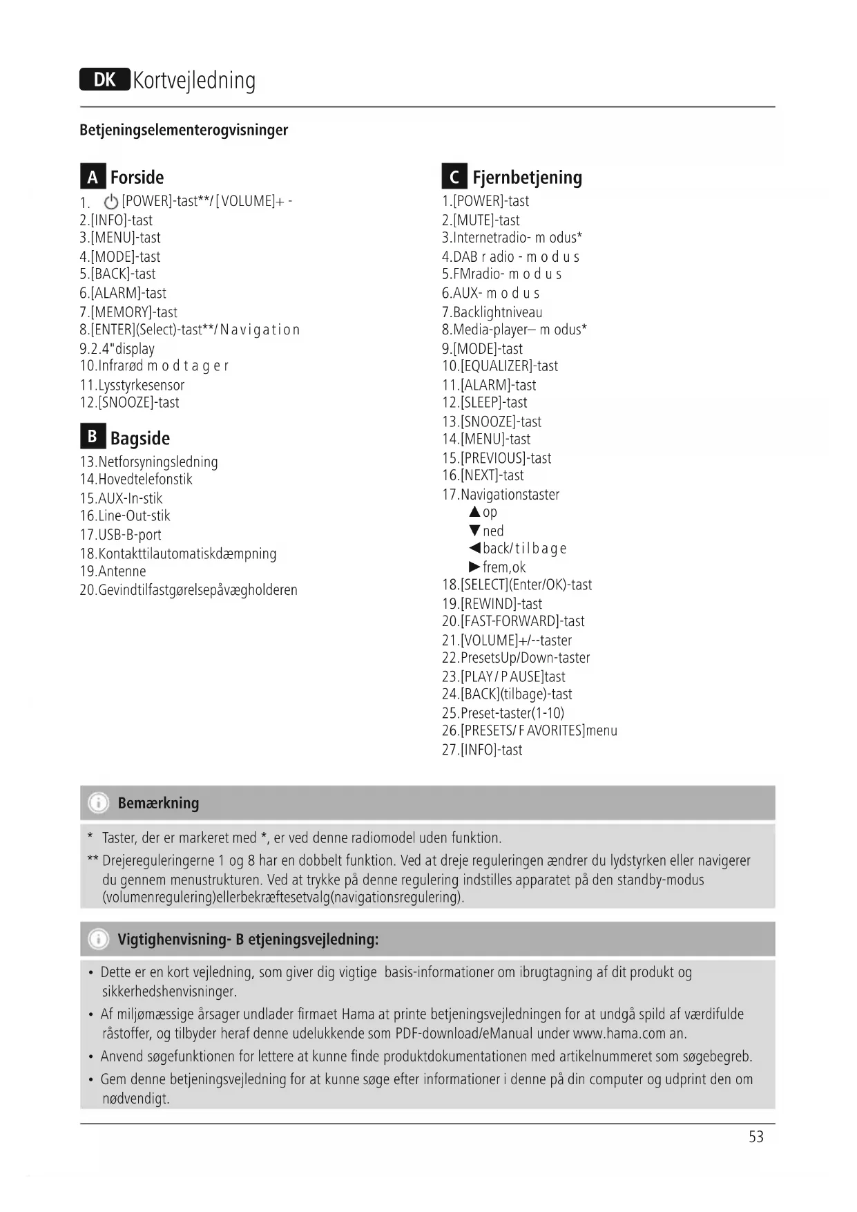 Taster,der er markeret med *, er ved denne radiomodel uden funktion. ** Drejereguleringerne 1og8har en dobbelt funktion. Vedatdreje reguleringen ændrer du lydstyrken eller navigerer du gennem menustrukturen. Vedattrykke på denne regulering indstilles apparatet på den standby-modus (volumenregulering) eller bekræftes et valg (navigationsregulering). Vigtig henvisning -Betjeningsvejledning: