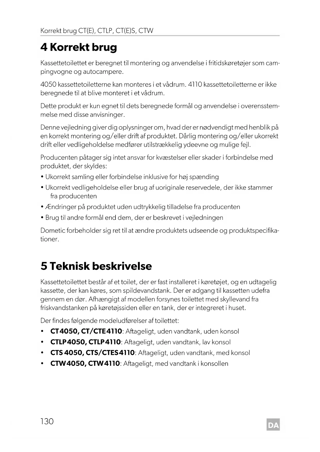 4 Korrekt brug Kassettetoilettet er beregnet til montering og anvendelse i fritidskøretøjer som cam- pingvogne og autocampere. 4050 kassettetoiletterne kan monteres i et vådrum. 4110 kassettetoiletterne er ikke beregnede til at blive monteret i et vådrum. Dette produkt er kun egnet til dets beregnede formål og anvendelse i overensstem- melse med disse anvisninger. Denne vejledning giver dig oplysninger om, hvad der er nødvendigt med henblik på en korrekt montering og/eller drift af produktet. Dårlig montering og/eller ukorrekt drift eller vedligeholdelse medfører utilstrækkelig ydeevne og mulige fejl. Producenten påtager sig intet ansvar for kvæstelser eller skader i forbindelse med produktet, der skyldes: