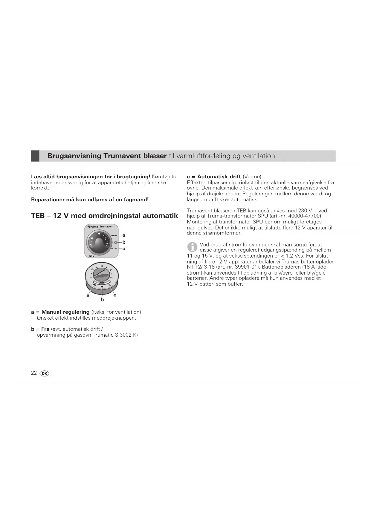 a = Manual regulering (f.eks. for ventilation) Ønsket effekt indstilles meddrejeknappen. b = Fra (evt. automatisk drift / opvarmning på gasovn Trumatic S 3002 K) c = Automatisk drift (Varme) Effekten tilpasser sig trinløst til den aktuelle varmeafgivelse fra ovne. Den maksimale effekt kan efter ønske begrænses ved hjælp af drejeknappen. Reguleringen mellem denne værdi og langsom drift sker automatisk. Trumavent blæseren TEB kan også drives med 230 V ~ ved hjælp af Truma-transformator SPU (art.-nr. 40000-47700). Montering af transformator SPU bør om muligt foretages nær gulvet. Det er ikke muligt at tilslutte flere 12 V-aparater til denne strømomformer. Ved brug af strømforsyninger skal man sørge for, at disse afgiver en reguleret udgangsspænding på mellem 11 og 15 V, og at vekselspændingen er < 1,2 Vss. For tilslut- ning af flere 12 V-apparater anbefaler vi Trumas batterioplader NT 12/ 3-18 (art.-nr. 39901-01). Batteriopladeren (18 A lade- strøm) kan anvendes til opladning af bly/syre- eller bly/gelé- batterier. Andre typer opladere må kun anvendes med et 12 V-batteri som buffer.23 TN – 230 V Standardudførelse