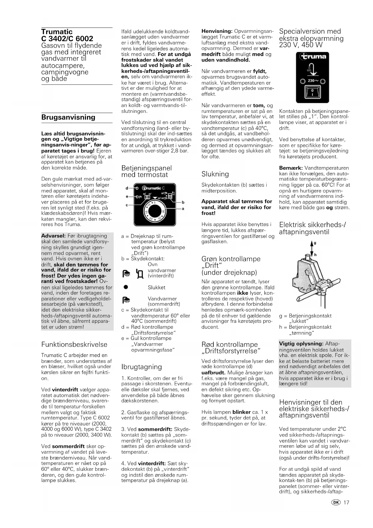 garantieclaim Het adres van de fabrikant luidt: Truma Gerätetechnik GmbH & Co. KG, Wernher- von-Braun-Straße 12, 85640 Putzbrunn. In principe moet in Duitsland altijd de service- afdeling van Truma worden ingelicht. In het buitenland staan hiervoor de verschillen- de servicepartners (zie adres- senlijst) ter beschikking van de klant. Klachten dienen na- der te worden toegelicht. Bo- vendien dient de garantie- oorkonde correct ingevuld te worden overhandigd of moe- ten zowel het serienummer van het apparaat als de koop- datum ervan worden opgege- ven. Om de fabrikant in staat te stellen, te controleren of er sprake is van een geval dat onder de garantie valt, moet de consument het toestel voor zijn risico naar de fabri- kant brengen of naar deze op- sturen. Bij schade aan ver- warmingselementen (warm- tewisselaars) moet ook de gasdrukregelaar worden mee- gestuurd. Bij opsturen naar de fabriek dient het toestel als vracht- goed verzonden te worden. Indien het geval onder de ga- rantie valt, draagt de fabriek de transportkosten resp. kos- ten van opsturen en terugstu- ren. Als niet op garantie aan- spraak kan worden gemaakt, informeert de fabrikant de klant hierover en geeft aan welke kosten niet voor reke- ning van de fabrikant zijn. Bo- vendien zijn in dit geval de verzendkosten voor rekening van de klant.Læs altid brugsanvisnin- gen og „Vigtige betje- ningsanvis-ninger”, før ap- paratet tages i brug! Ejeren af køretøjet er ansvarlig for, at apparatet kan betjenes på den korrekte måde. Den gule mærkat med ad-var- selshenvisninger, som følger med apparatet, skal af mon- tøren eller køretøjets indeha- ver placeres på et for bruge- ren let synligt sted (f.eks. på klædeskabsdøren)! Hvis mær- katen mangler, kan den rekvi- reres hos Truma. Advarsel: Før ibrugtagning skal den samlede vandforsy- ning skylles grundigt igen- nem med opvarmet, rent vand. Hvis ovnen ikke er i drift, skal den tømmes for vand, ifald der er risiko for frost! Der ydes ingen ga- ranti ved frostskader! Ov- nen skal ligeledes tømmes for vand, inden der foretages re- parationer eller vedligeholdel- sesarbejde (på værksted!), idet den elektriske sikker- heds-/aftapingsventil automa- tisk vil åbne, såfremt appara- tet er uden strøm! Funktionsbeskrivelse Trumatic C arbejder med en brænder, som understøttes af en blæser, hvilket også under kørslen sikrer en fejlfri funkti- on. Ved vinterdrift vælger appa- ratet automatisk det nødven- dige brænderniveau, svaren- de til temperatur-forskellen mellem valgt og faktisk rumtemperatur. Type C 6002 kører på tre niveauer (2000, 4000 og 6000 W), type C 3402 på to niveauer (2000, 3400 W). Ved sommerdrift sker op- varmning af vandet på lave- ste brænderniveau. Når vand- temperaturen er nået op på 60° eller 40°C, slukker bræn- deren, og den gule kontrol- lampe slukkes. Specialversion med ekstra elopvarmning 230 V, 450 W Kontakten på betjeningspane- let stilles på „1“. Den kontrol- lampe viser, at apparatet er i drift. Ved benyttelse af kontakter, som er specifikke for køre- tøjet: se betjeningsvejledning fra køretøjets producent. Bemærk: Vandtemperaturen kan ikke forvælges, den auto- matiske temperaturbegræns- ning ligger på ca. 60°C! For at opnå en hurtigere opvarm- ning af vandvarmerens ind- hold, kan apparatet samtidig køre med både gas og strøm. Elektrisk sikkerheds-/ aftapningsventil g = Betjeningskontakt „lukket“ h = Betjeningskontakt „tømning“ Vigtig oplysning: Aftap- ningsventilen holdes lukket vha. en elektrisk spole. For ik- ke at belaste batteriet mere end nødvendigt anbefales det at åbne aftapningsventilen, hvis apparatet ikke er i brug i længere tid! Henvisninger til den elektriske sikkerheds-/ aftapningsventil Ved temperaturer under 2°C ved sikkerheds-/aftapnings- ventilen kan vandet i vandvar- meren løbe ud af sig selv, hvis apparatet ikke er i drift (også under drifts-forstyrrelse)! For at undgå spild af vand tændes apparatet på skyde- kontak-ten (b) på betjenings- panelet (sommer- eller vinter- drift), og sikkerheds-/aftap- Henvisning: Opvarmningsan- lægget Trumatic C er et varm- luftsanlæg med ekstra vand- opvarmning. Dermed er var- medrift både muligt med og uden vandindhold. Når vandvarmeren er fyldt, opvarmes brugsvandet auto- matisk. Vandtemperaturen er afhængig af den ydede varme- effekt. Når vandvarmeren er tom, og rumtemperaturen er sat på en lav temperatur, anbefaler vi, at skydekontakten sættes på en vandtemperatur (c) på 40°C, så det undgås, at vandbehol- deren opvarmes unødvendigt, og dermed at opvarmningsan- lægget tændes og slukkes alt for ofte. Slukning Skydekontakten (b) sættes i midterposition. Apparatet skal tømmes for vand, ifald der er risiko for frost! Hvis apparatet ikke benyttes i længere tid, lukkes afspær- ringsventilen for gastilførsel og gasflasken. Grøn kontrollampe „Drift“ (under drejeknap) Når apparatet er tændt, lyser den grønne kontrollampe. Ifald kontrollampen ikke lyser, kon- trolleres de respektive (hoved) afbrydere. I denne forbindelse henledes opmærk-somheden på de til enhver tid gældende anvisninger fra køretøjets pro- ducent. Rød kontrollampe „Driftsforstyrrelse” Ved driftsforstyrrelse lyser den røde kontrollampe (d) uafbrudt. Mulige årsager kan f.eks. være mangel på gas, mangel på forbrændingsluft, en defekt sikring etc. Op- hævelse sker gennem slukning og fornyet opstart. Hvis lampen blinker ca. 1 x pr. sekund, tyder det på, at driftsspændingen er for lav. Ifald udelukkende koldtvand- sanlægget uden vandvarmer er i drift, fyldes vandvarme- rens kedel ligeledes automa- tisk med vand. For at undgå frostskader skal vandet lukkes ud ved hjælp af sik- kerheds-/aftapningsventil- en, selv om vandvarmeren ik- ke har været i brug. Alterna- tivt er der mulighed for at montere en (varmtvandsbe- standig) afspærringsventil for- an koldt- og varmtvands-til- slutningen. Ved tilslutning til en central vandforsynin