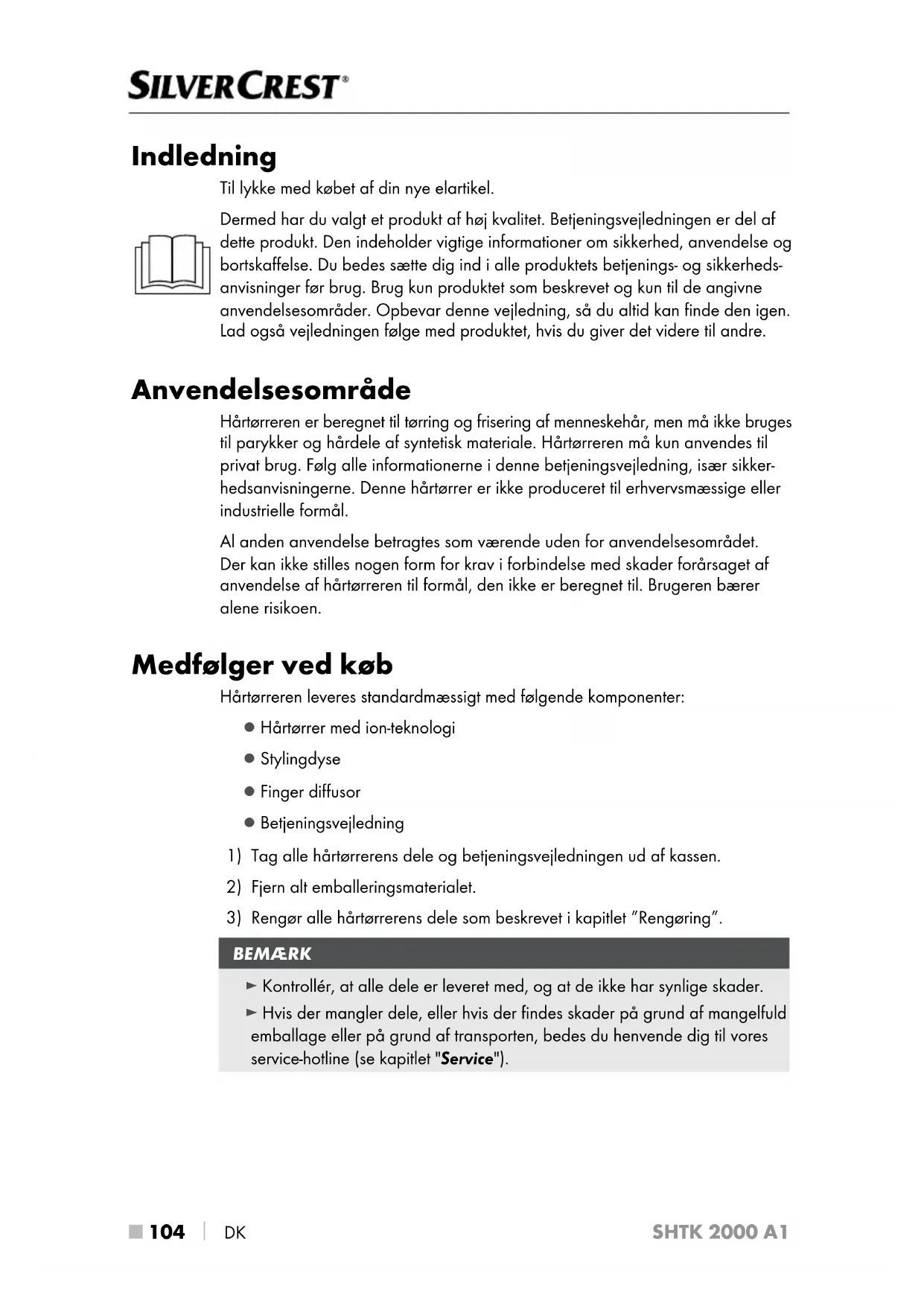 DK SHTK 2000 A1 Indledning Til lykke med købet af din nye elartikel. Dermed har du valgt et produkt af høj kvalitet. Betjeningsvejledningen er del af dette produkt. Den indeholder vigtige informationer om sikkerhed, anvendelse og bortskaffelse. Du bedes sætte dig ind i alle produktets betjenings- og sikkerheds- anvisninger før brug. Brug kun produktet som beskrevet og kun til de angivne anvendelsesområder. Opbevar denne vejledning, så du altid kan finde den igen. Lad også vejledningen følge med produktet, hvis du giver det videre til andre. Anvendelsesområde Hårtørreren er beregnet til tørring og frisering af menneskehår, men må ikke bruges til parykker og hårdele af syntetisk materiale. Hårtørreren må kun anvendes til privat brug. Følg alle informationerne i denne betjeningsvejledning, især sikker- hedsanvisningerne. Denne hårtørrer er ikke produceret til erhvervsmæssige eller industrielle formål. Al anden anvendelse betragtes som værende uden for anvendelsesområdet. Der kan ikke stilles nogen form for krav i forbindelse med skader forårsaget af anvendelse af hårtørreren til formål, den ikke er beregnet til. Brugeren bærer alene risikoen. Medfølger ved køb Hårtørreren leveres standardmæssigt med følgende komponenter: ▯ Hårtørrer med ion-teknologi ▯ Stylingdyse ▯ Finger diffusor ▯ Betjeningsvejledning