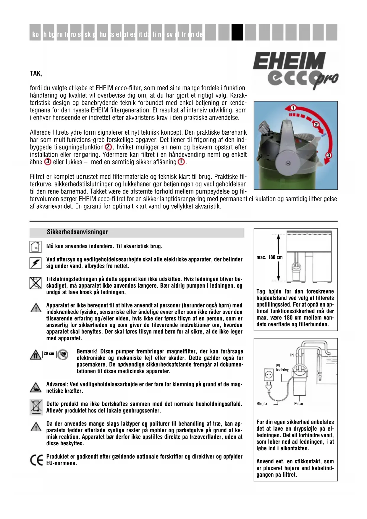 N - R Puhdistus ja hoito S - U Pumppupesä, palloventtiili ja tiivisterengasTAK, fordi du valgte at købe et EHEIM ecco-filter, som med sine mange fordele i funktion, håndtering og kvalitet vil overbevise dig om, at du har gjort et rigtigt valg. Karak- teristisk design og banebrydende teknik forbundet med enkel betjening er kende- tegnene for den nyeste EHEIM filtergeneration. Et resultat af intensiv udvikling, som i enhver henseende er indrettet efter akvaristens krav i den praktiske anvendelse. Allerede filtrets ydre form signalerer et nyt teknisk koncept. Den praktiske bærehank har som multifunktions-greb forskellige opgaver: Det tjener til frigøring af den ind- byggede tilsugningsfunktion , hvilket muliggør en nem og bekvem opstart efter installation eller rengøring. Ydermere kan filtret i en håndevending nemt og enkelt åbne eller lukkes – med en samtidig sikker aflåsning . Filtret er komplet udrustet med filtermateriale og teknisk klart til brug. Praktiske fil- terkurve, sikkerhedstilslutninger og lukkehaner gør betjeningen og vedligeholdelsen til den rene barnemad. Takket være de afstemte forhold mellem pumpeydelse og fil- tervolumen sørger EHEIM ecco-filtret for en sikker langtidsrengøring med permanent cirkulation og samtidig iltberigelse af akvarievandet. En garanti for optimalt klart vand og vellykket akvaristik.
