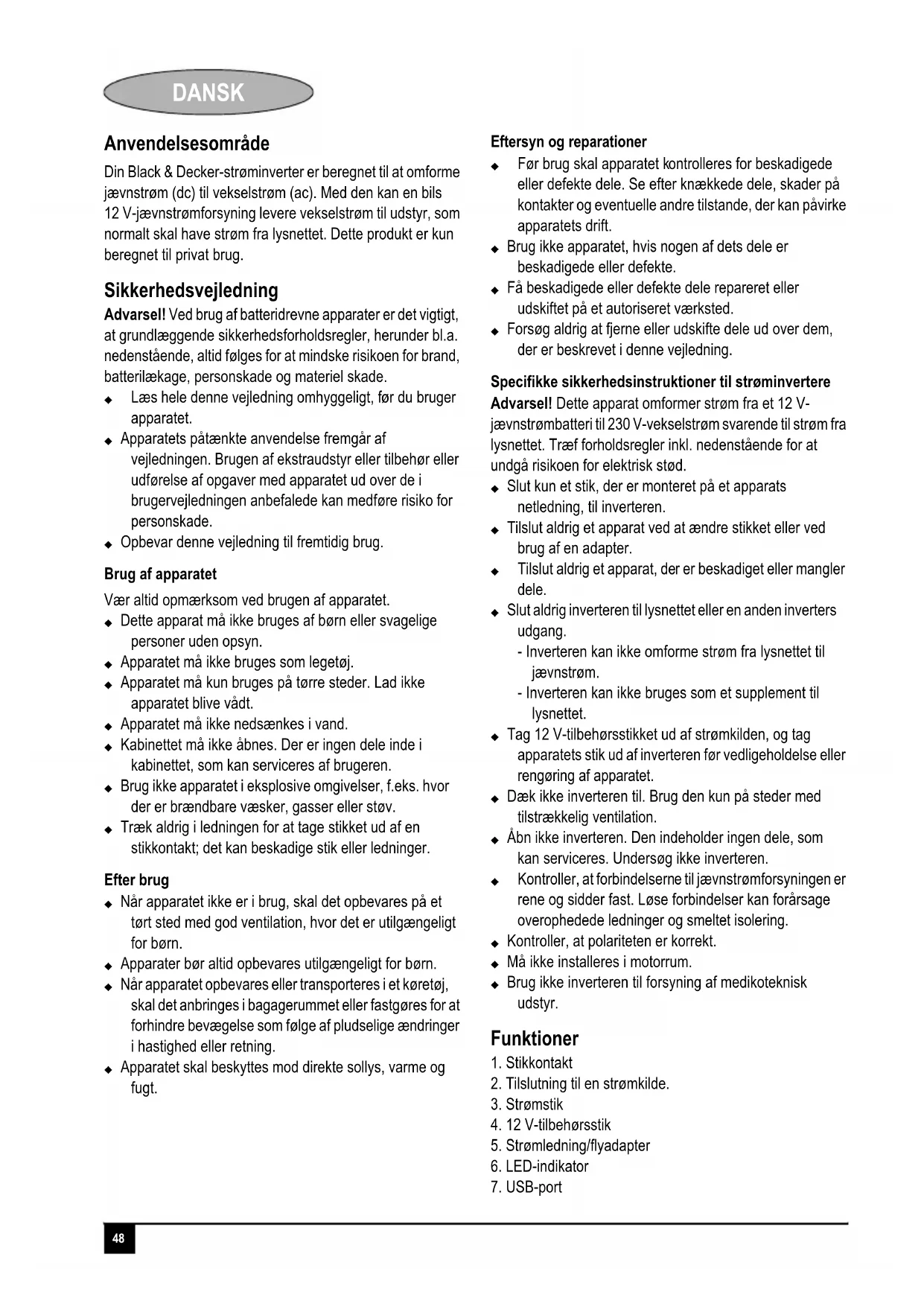 Din Black & Decker-strøminverter er beregnet til at omforme jegavnstrøm (dc) til vekselstrøm (ac). Med den kan en bils 12 V-jævnstrømforsyning levere vekselstrøm til udstyr, som normaliskal have strøm fra lysnettet. Dette produit er kun beregnet til privat brug.