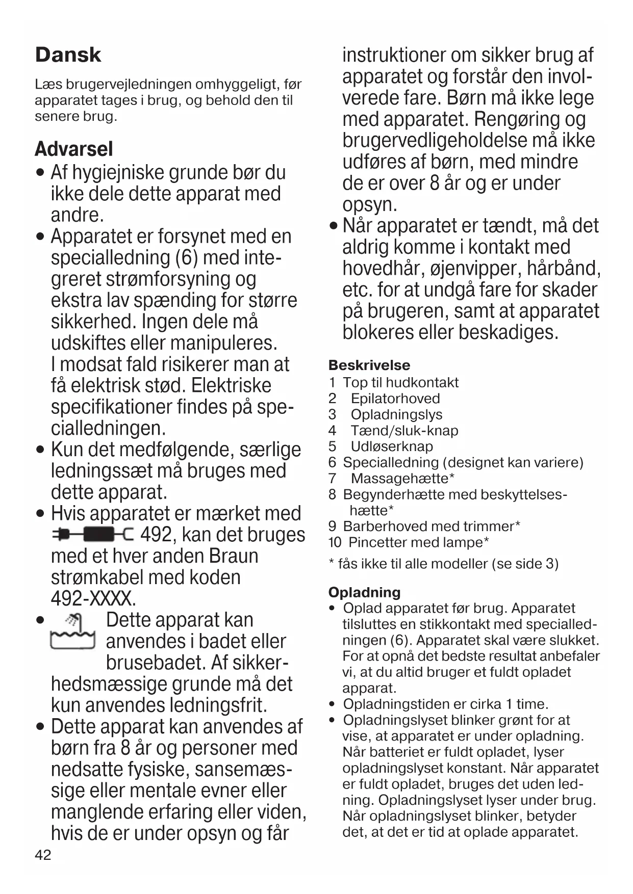 Hvis apparatet er mærket med 492, kan det bruges med et hver anden Braun strømkabel med koden 492-XXXX.
