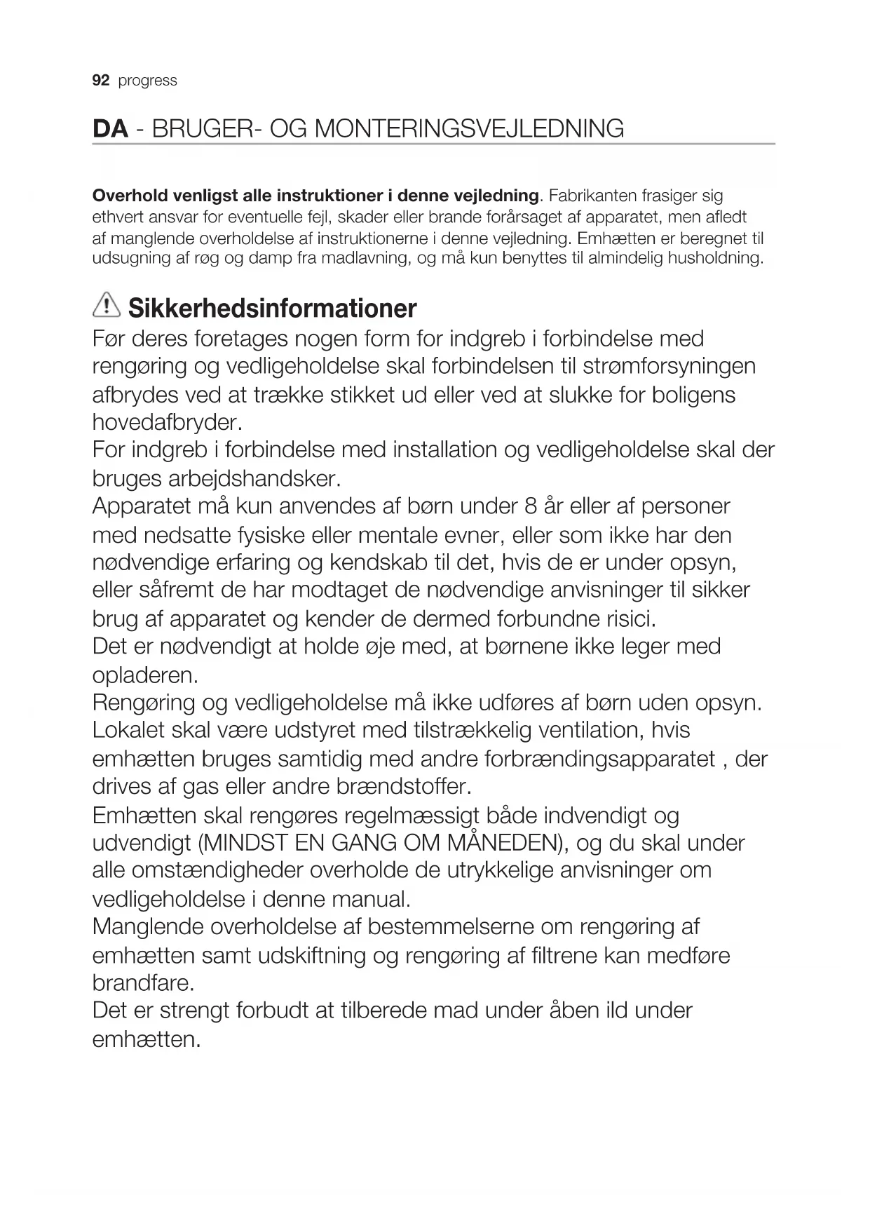 Overhold venligst alle instruktioner i denne vejledning. Fabrikanten frasiger sig ethvert ansvar for eventuelle fejl, skader eller brande forårsaget af apparatet, men aedt af manglende overholdelse af instruktionerne i denne vejledning. Emhætten er beregnet til udsugning af røg og damp fra madlavning, og må kun benyttes til almindelig husholdning. Sikkerhedsinformationer Før deres foretages nogen form for indgreb i forbindelse med rengøring og vedligeholdelse skal forbindelsen til strømforsyningen afbrydes ved at trække stikket ud eller ved at slukke for boligens hovedafbryder. For indgreb i forbindelse med installation og vedligeholdelse skal der bruges arbejdshandsker. Apparatet må kun anvendes af børn under 8 år eller af personer med nedsatte fysiske eller mentale evner, eller som ikke har den nødvendige erfaring og kendskab til det, hvis de er under opsyn, eller såfremt de har modtaget de nødvendige anvisninger til sikker brug af apparatet og kender de dermed forbundne risici. Det er nødvendigt at holde øje med, at børnene ikke leger med opladeren. Rengøring og vedligeholdelse må ikke udføres af børn uden opsyn. Lokalet skal være udstyret med tilstrækkelig ventilation, hvis emhætten bruges samtidig med andre forbrændingsapparatet , der drives af gas eller andre brændstoffer. Emhætten skal rengøres regelmæssigt både indvendigt og udvendigt (MINDST EN GANG OM MÅNEDEN), og du skal under alle omstændigheder overholde de utrykkelige anvisninger om vedligeholdelse i denne manual. Manglende overholdelse af bestemmelserne om rengøring af emhætten samt udskiftning og rengøring af filtrene kan medføre brandfare. Det er strengt forbudt at tilberede mad under åben ild under emhætten.progress 93 Sikkerhedsinstruktioner Brug af åben ild er skadeligt for filtrene og kan medføre en brand, og det skal derfor for enhver pris undgås. Friturestegning skal udføres under overvågning for at undgå, at olien overophedes og antændes. Pas på! Når kogepladen er i brug, kan emhættens tilgængelige dele blive meget varme. Ved udskiftning af pæren må du kun anvendes den type lyspære, der er angivet i afsnittet om vedligeholdelse/udskiftning af pære i denne manual. Pas på! Apparatet må ikke tilsluttes strømforsyningen, før installationen er helt fuldført. Hvad angår de anviste tekniske og sikkerhedsmæssige forholdsregler til udledning af røg, skal du omhyggeligt overholde de lokale myndigheders forskrifter. Den udsugede luft må ikke tilføres en skakt, der bruges til udledning af røg fra forbrændingsapparater, der fungerer med gas eller andre brændstoffer. Du må ikke bruge eller efterlade emhætten uden korrekt monterede pærer for at undgå en risiko for elektrisk stød. Brug aldrig emhætten uden en korrekt monteret rist! Emhættens overflade må ALDRIG anvendes som afsætningsplade, med mindre dette er udtrykkeligt angivet. Brug kun de medfølgende fastspændingsskruer til produktet i forbindelse med installationen eller – såfremt de ikke medfølger – skal du indkøbe den korrekte type skruer. Brug skruer af korrekt længde, som anført i installationsvejledningen. I tvivlstilfælde bør du kontakte dit autoriserede servicecenter eller en kvalificeret tekniker. Pas på! Hvis der ikke monteres de skruer og fastspændingsanordninger som angivet i disse anvisninger, kan der opstå risiko for elektriske problemer. Miljøhensyn Genbrug materialer med symbolet . Anbring emballagematerialet i passende beholdere til genbrug. Hjælp med at beskytte miljøet og menneskelig sundhed samt at genbruge affald af elektriske og elektroniske apparater. Kasser ikke apparater, der er mærket med symbolet , sammen med husholdningsaffaldet. Lever produktet tilbage til din lokale genbrugsplads eller kontakt din kommune. Anvendelse Emhætten er udviklet til brug i den sugende udgave med ekstern udledning eller i den filtrerende udgave med intern recirkulation . Installering Netspændingen skal svare til spændingen vist på typeskiltet internt i emhætten. Hvis emhætten er udstyret med et stik, skal emhætten tilsluttes en let tilgængelig stikkontakt, der er i overensstemmelse med de gældende standarder. Stikkontakten skal også være let tilgængelig efter installeringen. Hvis emhætten ikke er udstyret med et stik (direkte tilslutning til elnettet), eller hvis stikket ikke findes i et område, der også er let tilgængeligt efter installeringen, skal der monteres en topolet afbryderkontakt i overensstemmelse med standarderne, der sørger for fuld afbrydelse fra elnettet i tilfælde af forhold i overspændingskategori III, og i overensstemmelse med reglerne for elektriske installationer. Obs! Undersøg altid, at netkablet er blevet monteret rigtigt, før emhættens kredsløb tilsluttes forsyningsnettet og der udføres kontrol af korrekt funktion.94 progress Minimumsafstanden mellem kogegrejets støtteoverflade på komfuret og den nederste del af emhætten må ikke være under 50cm ved elektriske kogeplader, og ikke under 65cm ved gasblus eller komfurer med både gasblus og elektriske kogeplader. Hvis gaskomfurets vejledning angiver en større afstand, skal dette overholdes. Vedligeholdelse Obs! Inden der udføres nogen form for rengøring eller vedligeholdelse skal emhætten afbrydes fra elnettet ved at fjerne stikket fra stikkontakten, eller ved at afbryde hjemmets hovedafbryder. Emhætten skal rengøres jævnligt både på ydersiden og på indersiden (mindst med samme frekvens som for vedligeholdelse af fedtfiltrene). Ved rengøring skal man anvende en klud fugtet med neutrale, milde rengøringsmidler i flydende form. Undgå brug af produkter indeholdende slibemidler BENYT ALDRIG SPRIT! Pas på! Manglende overholdelse af vejledningen til rengøring af apparatet og udskiftning af filtrene medfører brandfare. Der henstilles således til, at instruktionerne følges. Fabrikanten frasiger sig ethvert ansvar for eventuel beskadigelse af motoren, brande forårsaget a