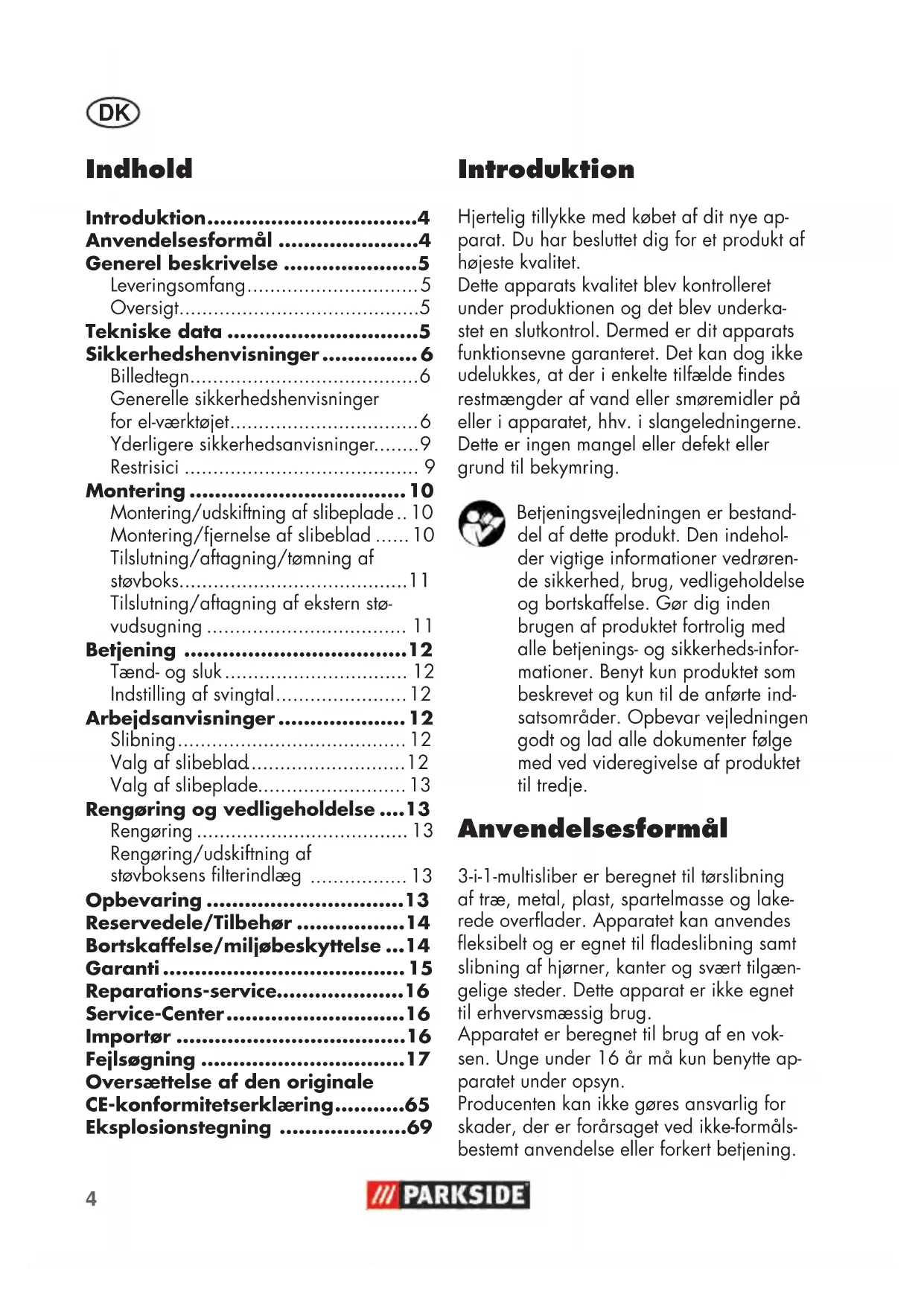 Introduktion Hjertelig tillykke med købet af dit nye ap- parat. Du har besluttet dig for et produkt af højeste kvalitet. Dette apparats kvalitet blev kontrolleret under produktionen og det blev underka- stet en slutkontrol. Dermed er dit apparats funktionsevne garanteret. Det kan dog ikke udelukkes, at der i enkelte tilfælde ndes restmængder af vand eller smøremidler på eller i apparatet, hhv. i slangeledningerne. Dette er ingen mangel eller defekt eller grund til bekymring. Betjeningsvejledningen er bestand- del af dette produkt. Den indehol- der vigtige informationer vedrøren- de sikkerhed, brug, vedligeholdelse og bortskaffelse. Gør dig inden brugen af produktet fortrolig med alle betjenings- og sikkerheds-infor- mationer. Benyt kun produktet som beskrevet og kun til de anførte ind- satsområder. Opbevar vejledningen godt og lad alle dokumenter følge med ved videregivelse af produktet til tredje. Anvendelsesformål 3-i-1-multisliber er beregnet til tørslibning af træ, metal, plast, spartelmasse og lake- rede overader. Apparatet kan anvendes eksibelt og er egnet til adeslibning samt slibning af hjørner, kanter og svært tilgæn- gelige steder. Dette apparat er ikke egnet til erhvervsmæssig brug. Apparatet er beregnet til brug af en vok- sen. Unge under 16 år må kun benytte ap- paratet under opsyn. Producenten kan ikke gøres ansvarlig for skader, der er forårsaget ved ikke-formåls- bestemt anvendelse eller forkert betjening. Indhold Introduktion .................................4 Anvendelsesformål