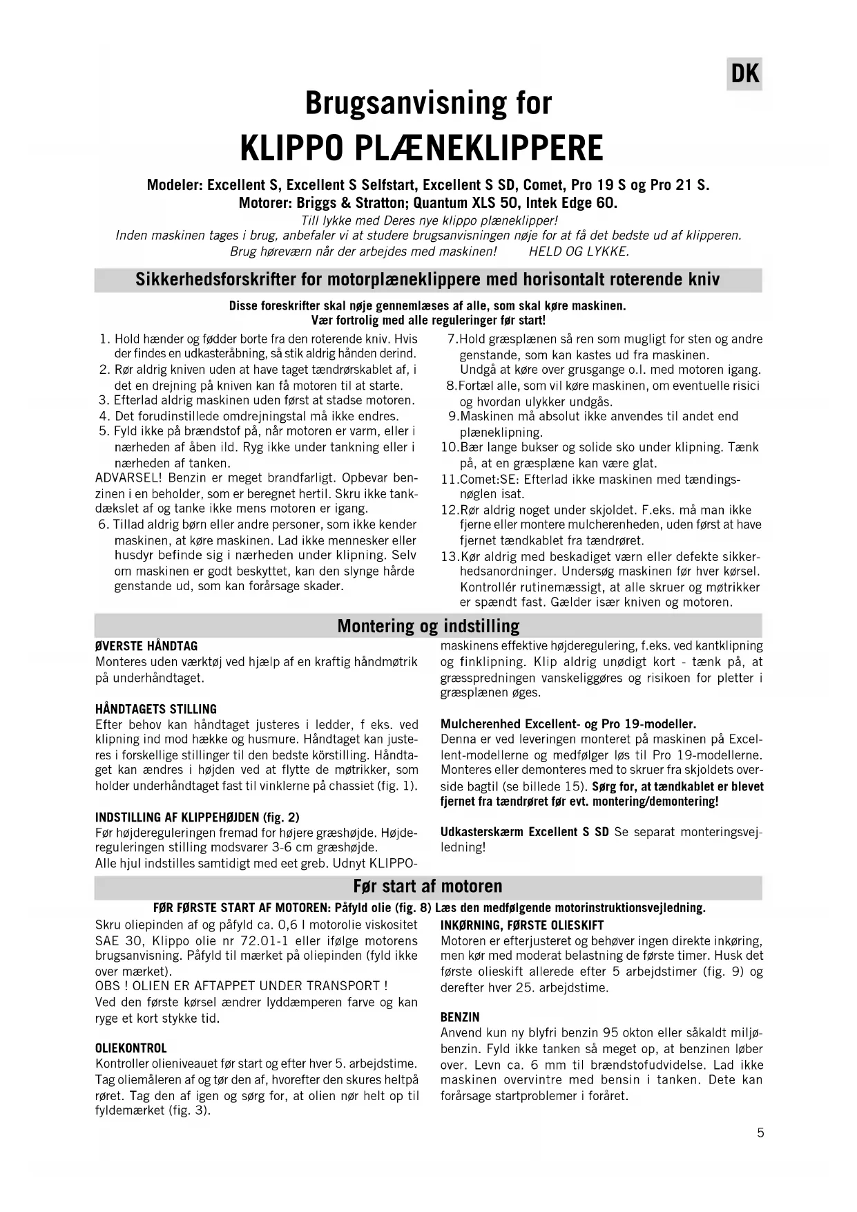 Modeler: Excellent S, Excellent S Selfstart, Excellent S SD, Comet, Pro 19 S og Pro 21 S. Motorer: Briggs & Stratton; Quantum XLS 50, Intek Edge 60. Till lykke med Deres nye klippo plæneklipper!Inden maskinen tages i brug, anbefaler vi at studere brugsanvisningen nøje for at få det bedste ud af klipperen.Brug høreværn når der arbejdes med maskinen! HELD OG LYKKE. Hold hænder og fødder borte fra den roterende kniv. Hvisder findes en udkasteråbning, så stik aldrig hånden derind. Rør aldrig kniven uden at have taget tændrørskablet af, idet en drejning på kniven kan få motoren til at starte. 3. Efterlad aldrig maskinen uden først at stadse motoren. 4. Det forudinstillede omdrejningstal må ikke endres. 5. Fyld ikke på brændstof på, når motoren er varm, eller inærheden af åben ild. Ryg ikke under tankning eller inærheden af tanken.ADVARSEL! Benzin er meget brandfarligt. Opbevar ben-zinen i en beholder, som er beregnet hertil. Skru ikke tank-dækslet af og tanke ikke mens motoren er igang. 6. Tillad aldrig børn eller andre personer, som ikke kendermaskinen, at køre maskinen. Lad ikke mennesker ellerhusdyr befinde sig i nærheden under klipning. Selvom maskinen er godt beskyttet, kan den slynge hårdegenstande ud, som kan forårsage skader.ØVERSTE HÅNDTAGMonteres uden værktøj ved hjælp af en kraftig håndmøtrikpå underhåndtaget.HÅNDTAGETS STILLINGEfter behov kan håndtaget justeres i ledder, f eks. vedklipning ind mod hække og husmure. Håndtaget kan juste-res i forskellige stillinger til den bedste körstilling. Håndta-get kan ændres i højden ved at flytte de møtrikker, somholder underhåndtaget fast til vinklerne på chassiet (fig. 1).INDSTILLING AF KLIPPEHØJDEN (fig. 2)Før højdereguleringen fremad for højere græshøjde. Højde-reguleringen stilling modsvarer 3-6 cm græshøjde.Alle hjul indstilles samtidigt med eet greb. Udnyt KLIPPO-maskinens effektive højderegulering, f.eks. ved kantklipningog finklipning. Klip aldrig unødigt kort - tænk på, atgræsspredningen vanskeliggøres og risikoen for pletter igræsplænen øges.Mulcherenhed Excellent- og Pro 19-modeller.Denna er ved leveringen monteret på maskinen på Excel-lent-modellerne og medfølger løs til Pro 19-modellerne.Monteres eller demonteres med to skruer fra skjoldets over-side bagtil (se billede 15). Sørg for, at tændkablet er blevetfjernet fra tændrøret før evt. montering/demontering!Udkasterskærm Excellent S SD Se separat monteringsvej-ledning!Skru oliepinden af og påfyld ca. 0,6 l motorolie viskositetSAE 30, Klippo olie nr 72.01-1 eller ifølge motorensbrugsanvisning. Påfyld til mærket på oliepinden (fyld ikkeover mærket).OBS ! OLIEN ER AFTAPPET UNDER TRANSPORT !Ved den første kørsel ændrer lyddæmperen farve og kanryge et kort stykke tid.OLIEKONTROLKontroller olieniveauet før start og efter hver 5. arbejdstime.Tag oliemåleren af og tør den af, hvorefter den skures heltpårøret. Tag den af igen og sørg for, at olien nør helt op tilfyldemærket (fig. 3).FØR FØRSTE START AF MOTOREN: Påfyld olie (fig. 8) Læs den medfølgende motorinstruktionsvejledning.Disse foreskrifter skal nøje gennemlæses af alle, som skal køre maskinen.Vær fortrolig med alle reguleringer før start! Montering og indstilling