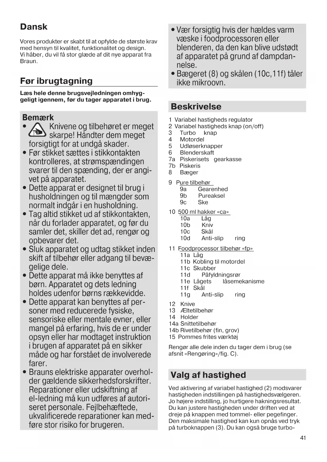 Brauns elektriske apparater overhol- der gældende sikkerhedsforskrifter. Reparationer eller udskiftning af el-ledning må kun udføres af autori- seret personale. Fejlbehæftede, ukvalificerede reparationer kan med- føre stor risiko for brugeren.