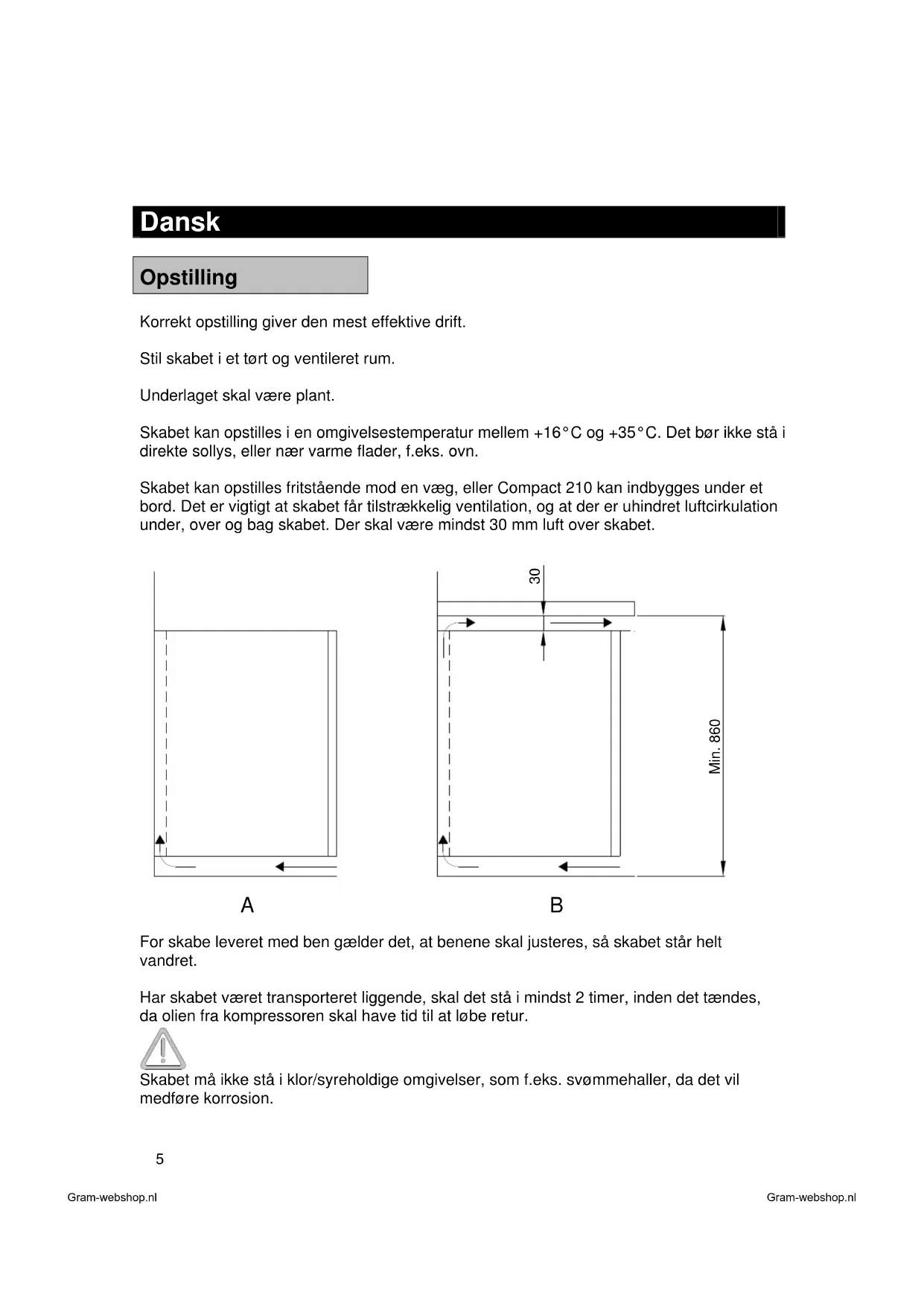For skabe leveret med ben gælder det, at benene skal justeres, så skabet står helt vandret. Har skabet været transporteret liggende, skal det stå i mindst 2 timer, inden det tændes, da olien fra kompressoren skal have tid til at løbe retur. Skabet må ikke stå i klor/syreholdige omgivelser, som f.eks. svømmehaller, da det vil medføre korrosion. Gram-webshop.nl Gram-webshop.nl6 Vigtigt!
