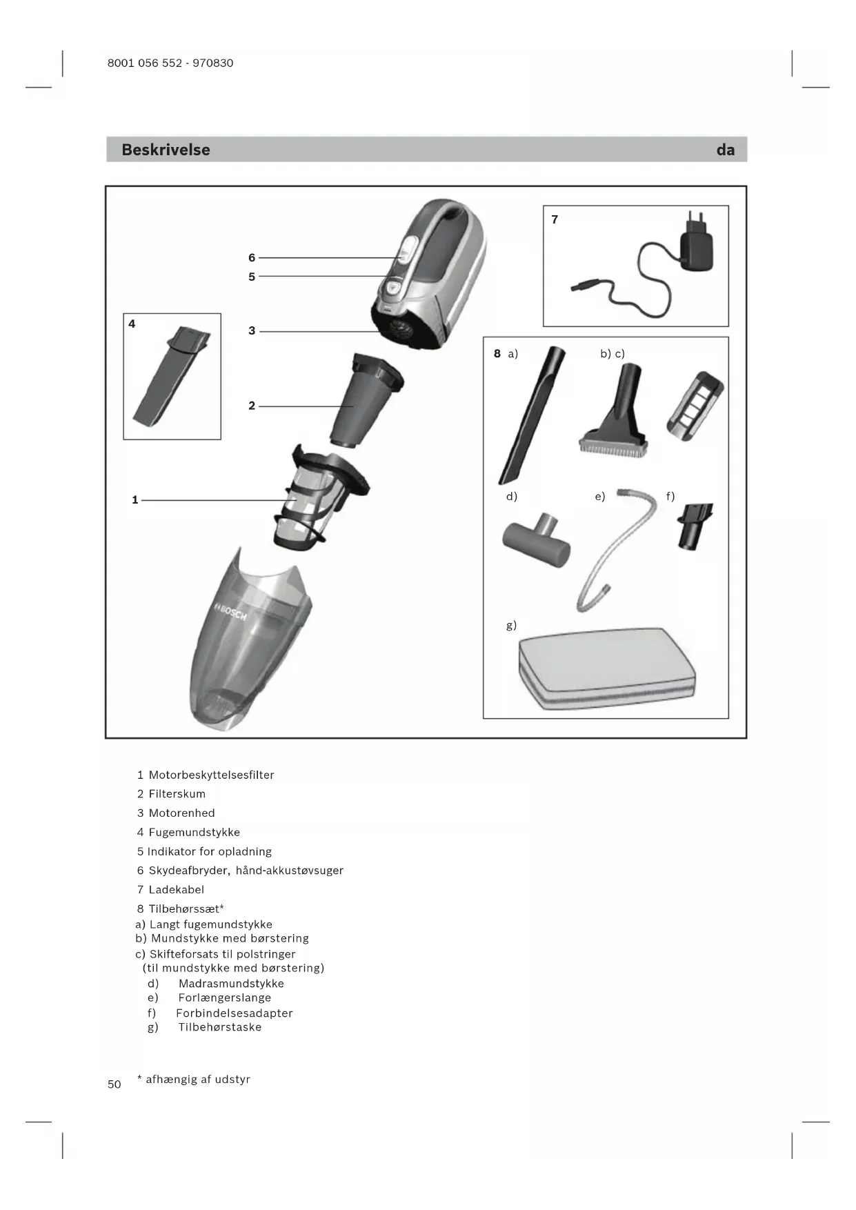 Tak, fordi du har valgt en Bosch BHN støvsuger. I denne brugsanvisning beskrives forskellige BHN – mo- deller. Det er derfor muligt, at nogle af de beskrevne funktioner og udstyr ikke findes på den aktuelle model. Vi anbefaler, at der altid anvendes originalt tilbehør fra Bosch, fordi det er blevet udviklet specielt til denne støvsug er for at opnå det optimalt bedste resultat af støvsugningen. Fold billedsiderne ud! Opladning