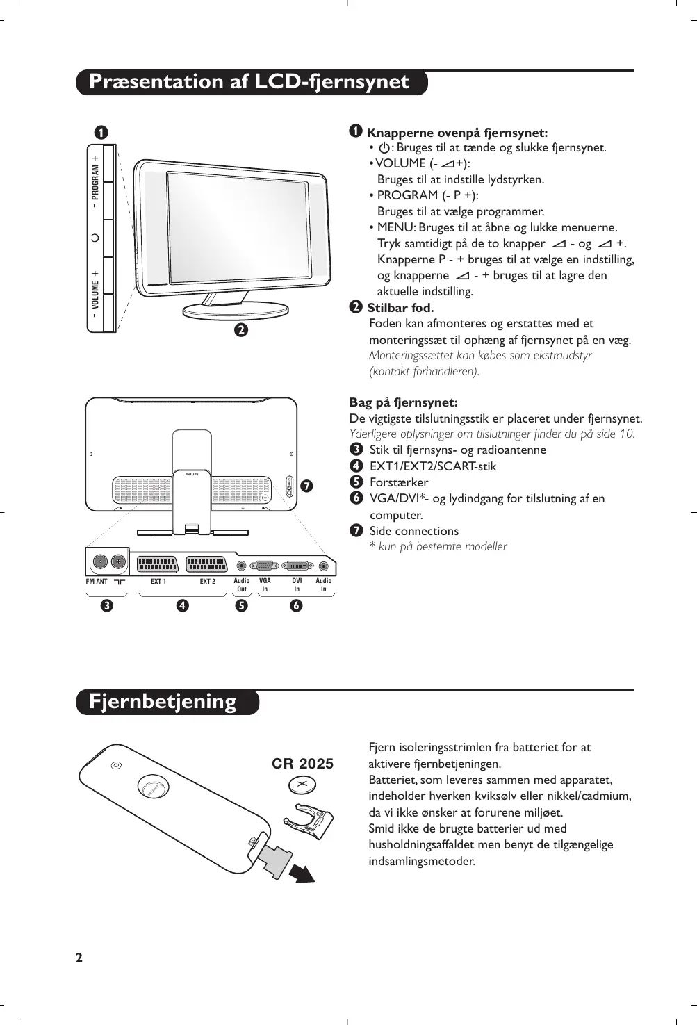 Fjern isoleringsstrimlen fra batteriet for at aktivere fjernbetjeningen. Batteriet, som leveres sammen med apparatet, indeholder hverken kviksølv eller nikkel/cadmium, da vi ikke ønsker at forurene miljøet. Smid ikke de brugte batterier ud med husholdningsaffaldet men benyt de tilgængelige indsamlingsmetoder. Fjernbetjeningens taster Lydindstilling Giver mulighed for at skifte programmer i Stereo og Nicam Stereo til Mono eller, ved tosprogede udsendelser, at vælge mellem Dual I og Dual II. Mono står med rødt, når lydindstillingen er brugervalgt. Standby For at sætte fjernsynet i standbystilling. For at tænde for fjernsynet igen trykkes på ., P - + eller ñ/ô. Vælgerknap * Pixel Plus (afhængig af type) For at aktivere / deaktivere demonstrationen af Pixel Plusfunktionen. Valg af EXT-stik (side 10) Tryk flere gange for at vælge et tilsluttet apparat. Surround sound Aktivering/deaktivering af surroundlyd. I stereo får man indtryk af en større afstand mellem højttalerne. På de modeller, der er udstyret med Virtual Dolby Surround* får man glæde af Dolby Surround Pro Logic-systemets gode lyd. 16:9-format (side 7) PIP til/fra (side 9) Pc / tv / radio (side 9) Tryk på en af knapperne for at indstille fjernsynet til pc, tv eller radio . Aktiv kontrol Optimér billedkvaliteten under hensyn til modtagelseskvaliteten og omgivelsernes lysforhold. Visning af tekst-tv (side 8) Programliste Til at vise status på programlisten. Brug derefter knapperne < > for at vælge et program.Tryk på knappen ≥ for at vise programmet. Markør (<>≤≥) Disse fire knapper bruges til at bevæge sig rundt i menuerne. Menu Anvendes til at åbne eller lukke menuerne. Mute Afbrydelse eller aktivering af lyden. Lydstyrke Til at slukke eller tænde for lyden. Billed- og lydindstillinger Til at få adgang til en række forudindstallerede billed- og lydindstillinger: Indstillingen personal modsvarer de indstillinger, der er foretaget i menuerne. Information på skærm For at vise / fjerne programmets nummer, klokkeslæt, lydgengivelse og den tid, der er tilbage, indtil apparatet slukker.Tryk i 5 sekunder for at vise programnummeret permanent på skærmen.