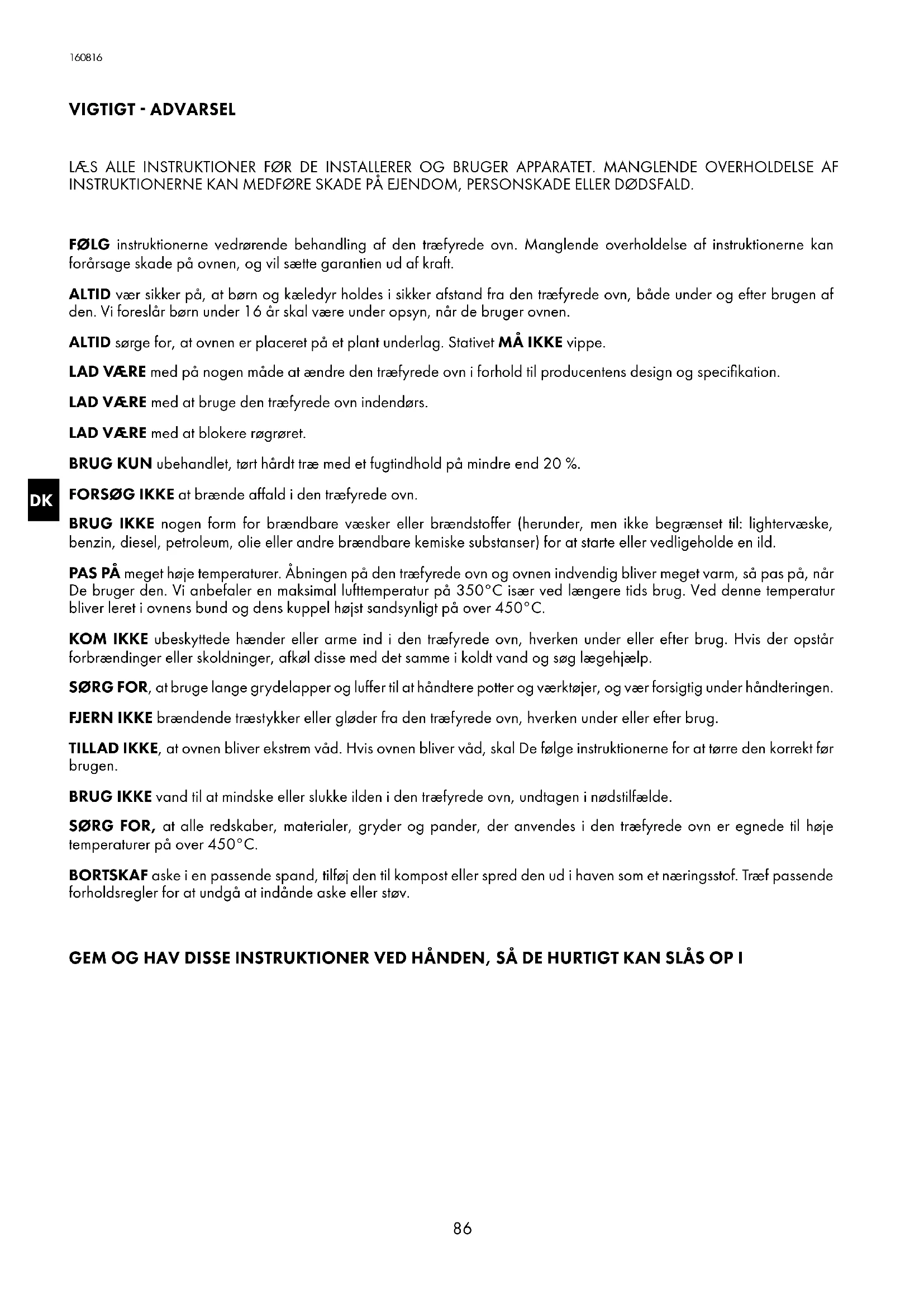 LÆS ALLE INSTRUKTIONER FØR DE INSTALLERER OG BRUGER APPARATET MANGLENDE OVERHOLDELSE AF INSTRUKTIONERNE KAN MEDFØRE SKADE PÅ EJENDOM, PERSONSKADE ELLER DØDSFALD FØLG instruktionerne vedrørende behandling af den træfyrede ovn Manglende overholdelse af instruktionerne kan forårsage skade på ovnen, og vil sætte garantien ud af kraft ALTID vær sikker på, at børn og kæledyr holdes i sikker afstand fra den træfyrede ovn, både under og efter brugen af den Vi foreslår børn under 16 år skal være under opsyn, når de bruger ovnen ALTID sørge for, at ovnen er placeret på et plant underlag Stativet MÅ IKKE vippe LAD VÆRE med på nogen måde at ændre den træfyrede ovn i forhold til producentens design og specifikation LAD VÆRE med at bruge den træfyrede ovn indendørs LAD VÆRE med at blokere røgrøret BRUG KUN ubehandlet, tørt hårdt træ med et fugtindhold på mindre end 20 % FORSØG IKKE at brænde affald i den træfyrede ovn BRUG IKKE nogen form for brændbare væsker eller brændstoffer (herunder, men ikke begrænset til: lightervæske, benzin, diesel, petroleum, olie eller andre brændbare kemiske substanser) for at starte eller vedligeholde en ild PAS PÅ meget høje temperaturer Åbningen på den træfyrede ovn og ovnen indvendig bliver meget varm, så pas på, når De bruger den Vi anbefaler en maksimal lufttemperatur på 350°C især ved længere tids brug Ved denne temperatur bliver leret i ovnens bund og dens kuppel højst sandsynligt på over 450°C KOM IKKE ubeskyttede hænder eller arme ind i den træfyrede ovn, hverken under eller efter brug Hvis der opstår forbrændinger eller skoldninger, afkøl disse med det samme i koldt vand og søg lægehjælp SØRG FOR, at bruge lange grydelapper og luffer til at håndtere potter og værktøjer, og vær forsigtig under håndteringen FJERN IKKE brændende træstykker eller gløder fra den træfyrede ovn, hverken under eller efter brug TILLAD IKKE, at ovnen bliver ekstrem våd Hvis ovnen bliver våd, skal De følge instruktionerne for at tørre den korrekt før brugen BRUG IKKE vand til at mindske eller slukke ilden i den træfyrede ovn, undtagen i nødstilfælde SØRG FOR, at alle redskaber, materialer, gryder og pander, der anvendes i den træfyrede ovn er egnede til høje temperaturer på over 450°C BORTSKAF aske i en passende spand, tilføj den til kompost eller spred den ud i haven som et næringsstof Træf passende forholdsregler for at undgå at indånde aske eller støv GEM OG HAV DISSE INSTRUKTIONER VED HÅNDEN, SÅ DE HURTIGT KAN SLÅS OP I