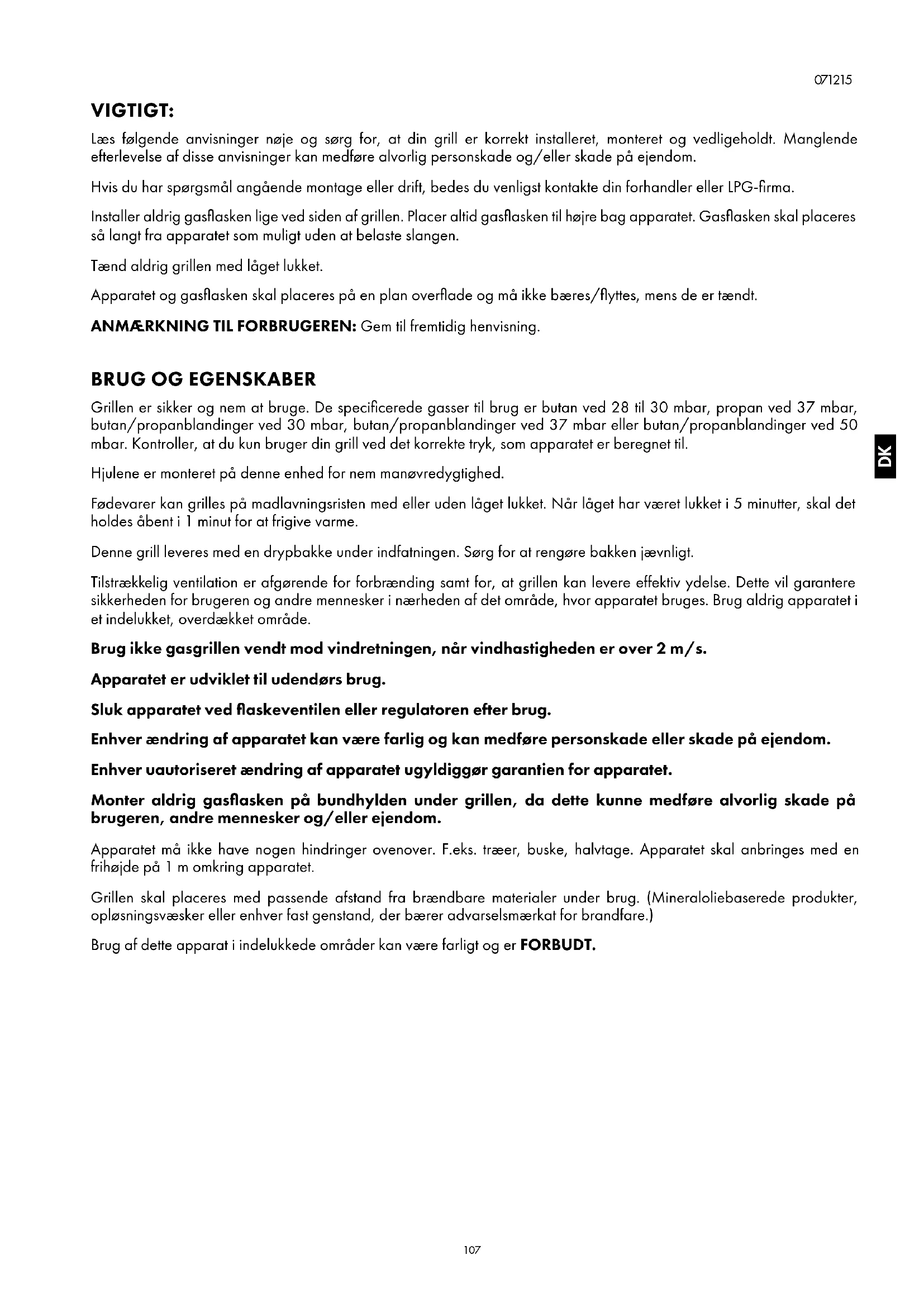 VIGTIGT: Læs følgende anvisninger nøje og sørg for, at din grill er korrekt installeret, monteret og vedligeholdt. Manglende efterlevelse af disse anvisninger kan medføre alvorlig personskade og/eller skade på ejendom. Hvis du har spørgsmål angående montage eller drift, bedes du venligst kontakte din forhandler eller LPG-firma. Installer aldrig gasflasken lige ved siden af grillen. Placer altid gasflasken til højre bag apparatet. Gasflasken skal placeres så langt fra apparatet som muligt uden at belaste slangen. Tænd aldrig grillen med låget lukket. Apparatet og gasflasken skal placeres på en plan overflade og må ikke bæres/flyttes, mens de er tændt. ANMÆRKNING TIL FORBRUGEREN: Gem til fremtidig henvisning.