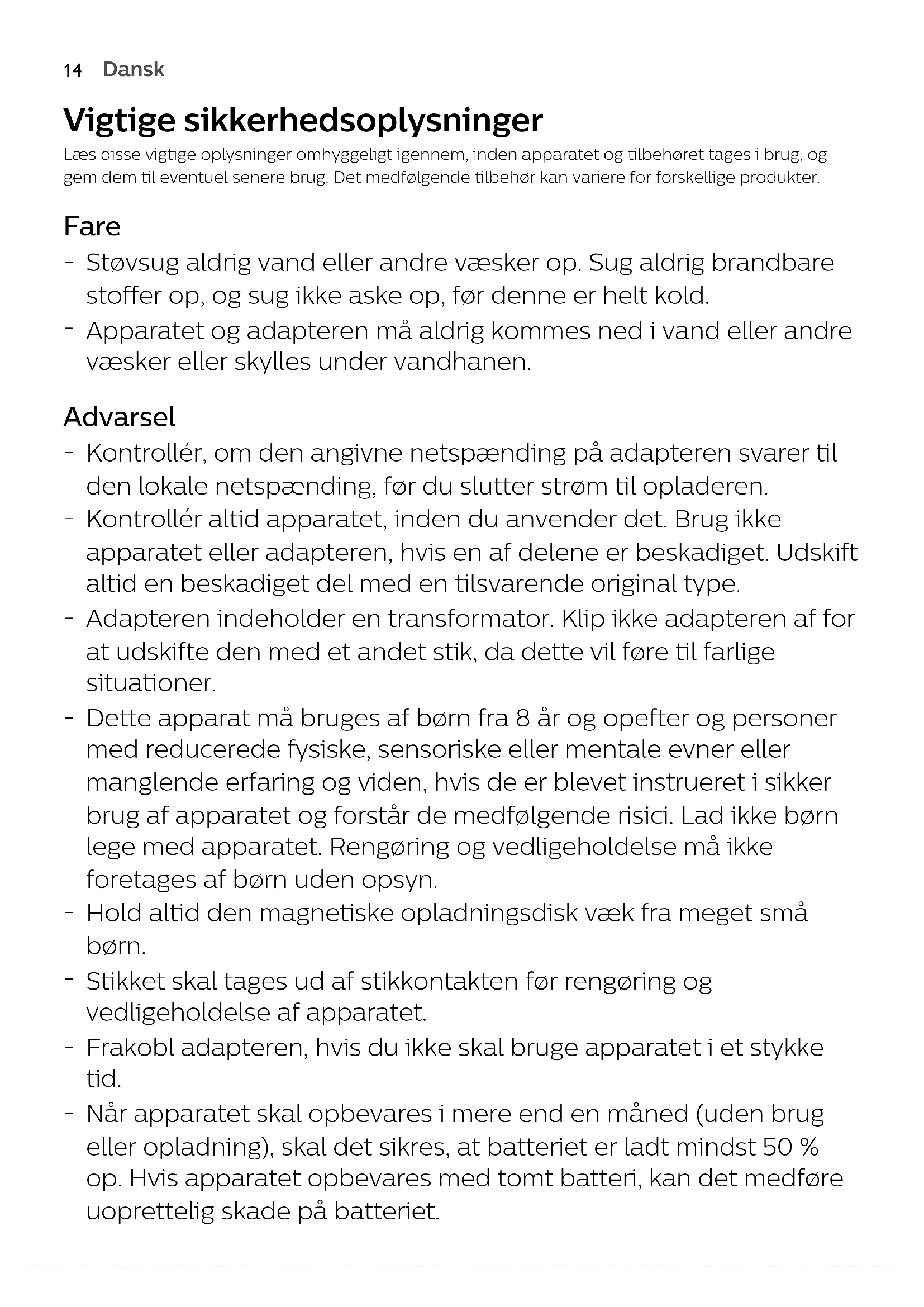 EnglishDansk Vigtige sikkerhedsoplysninger Læs disse vigtige oplysninger omhyggeligt igennem, inden apparatet og tilbehøret tages i brug, oggem dem til eventuel senere brug. Det medfølgende tilbehør kan variere for forskellige produkter. Fare
