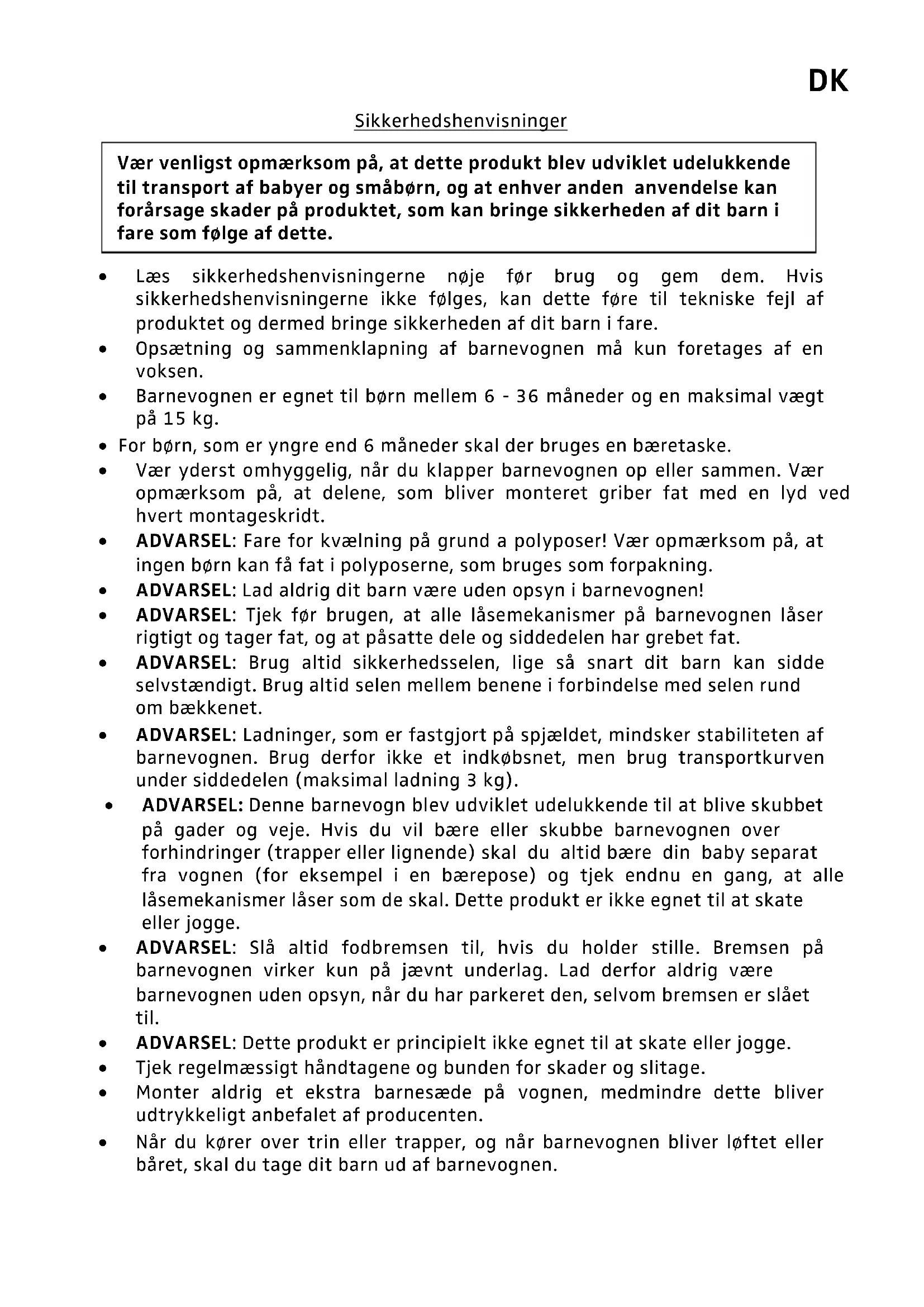 Læs sikkerhedshenvisningerne nøje før brug og gem dem. Hvis sikkerhedshenvisningerne ikke følges, kan dette føre til tekniske fejl af produktet og dermed bringe sikkerheden af dit barn i fare. Opsætning og sammenklapning af barnevognen må kun foretages af en voksen. Barnevognen er egnet til børn mellem 6 - 36 måneder og en maksimal vægt på 15 kg. For børn, som er yngre end 6 måneder skal der bruges en bæretaske. Vær yderst omhyggelig, når du klapper barnevognen op eller sammen. Vær opmærksom på, at delene, som bliver monteret griber fat med en lyd ved hvert montageskridt. ADVARSEL: Fare for kvælning på grund a polyposer! Vær opmærksom på, at ingen børn kan få fat i polyposerne, som bruges som forpakning. ADVARSEL: Lad aldrig dit barn være uden opsyn i barnevognen! ADVARSEL: Tjek før brugen, at alle låsemekanismer på barnevognen låser rigtigt og tager fat, og at påsatte dele og siddedelen har grebet fat. ADVARSEL: Brug altid sikkerhedsselen, lige så snart dit barn kan sidde selvstændigt. Brug altid selen mellem benene i forbindelse med selen rund om bækkenet. ADVARSEL: Ladninger, som er fastgjort på spjældet, mindsker stabiliteten af barnevognen. Brug derfor ikke et indkøbsnet, men brug transportkurven under siddedelen (maksimal ladning 3 kg). ADVARSEL: Denne barnevogn blev udviklet udelukkende til at blive skubbet på gader og veje. Hvis du vil bære eller skubbe barnevognen over forhindringer (trapper eller lignende) skal du altid bære din baby separat fra vognen (for eksempel i en bærepose) og tjek endnu en gang, at alle låsemekanismer låser som de skal. Dette produkt er ikke egnet til at skate eller jogge. ADVARSEL: Slå altid fodbremsen til, hvis du holder stille. Bremsen på barnevognen virker kun på jævnt underlag. Lad derfor aldrig være barnevognen uden opsyn, når du har parkeret den, selvom bremsen er slået til. ADVARSEL: Dette produkt er principielt ikke egnet til at skate eller jogge. Tjek regelmæssigt håndtagene og bunden for skader og slitage. Monter aldrig et ekstra barnesæde på vognen, medmindre dette bliver udtrykkeligt anbefalet af producenten. Når du kører over trin eller trapper, og når barnevognen bliver løftet eller båret, skal du tage dit barn ud af barnevognen. Vær venligst opmærksom på, at dette produkt blev udviklet udelukkende til transport af babyer og småbørn, og at enhver anden anvendelse kan forårsage skader på produktet, som kan bringe sikkerheden af dit barn i fare som følge af dette. DK Følg altid henvisningerne af producenten eller spørg hos din forhandler angående den tilladte ladning af barnevognen. Gem brugsanvisningen i al den tid, du bruger barnevognen, og skulle du videregive barnevognen til andre personer, så vedlæg venligst brugsanvisningen. Brug altid kun originale reservedele og tilbehør, som bliver anbefalet udtrykkeligt af producenten. Har din barnevogn yderligere en forhalingsbremse, så skal denne indstilles således, at det bremsende hjul ikke kan blokeres. Hvis din barnevogn er udstyret med lufthjul, tjek da lufttrykket regelmæssigt! (OBS: ved et let tryk med tommelfingeren). Det anbefalede maksimale lufttryk bliver angivet på hjulene. OBS: Lufthjul kan efterlade pletter, som ikke kan fjernes, på laminat-, parket- og plastikgulve! Pleje og service af din barnevogn: Følg altid plejeanvisningen for tekstiler, som er udvist som aftagelige og vaskbare fra producentens side. Denne er syet fast på produktet. Brug aldrig skrappe eller skurende rengøringsmidler til rengøringen af tekstilbetrækket, men kun mildt sæbevand eller et specielt tekstilrengøringsmiddel. Plastikdelene og stellet skal også gøres rene med sæbevand. Efter brug af barnevognen i regn eller våde omgivelser skal stellet tørres og gøres rent. Hvis stofbetrækket af barnevognen er blevet vådt skal barnevognen stilles til tørre i opklappet og opspændt tilstand. Tag hjulene af regelmæssigt og smør aksen og andre forbindelser samt affjedringen med en syrefri olie (olie til symaskiner, WD40 eller fedtfri vaseline). Ved at gøre dette opnår du, at din barnevogn løber let og stille, og du modvirkes slitage før tid. Ved at give din barnevogn den rette pleje er du derudover opmærksom på, at der ikke opstår smitsom rust, da dette ikke er en reklamationsgrund. OBS: De anvendte tekstiler er for det meste polyester- eller bomuldsblandinger, som opfylder alle lovmæssige krav. Ved stor belastning over et længere tidsrum (for eksempel igennem intens solindstråling) kan især naturtekstiler falme; dette er dog ikke en reklamationsgrund. OBS: Egnet til et barn med en maksimal vægt på ca.15 kg Læs og gem brugsanvisningen! Gem kassebonen! Der kan forekomme ændringer i henhold til leveringsomfang, tekniske ændringer samt kundespecifikke ændringer! Farverne og udstyret af produktet kan afvige fra farverne og udstyret, som er vist på billederne. Ifølge EN-1888 / 01.05.2012 Af 10.12.2012 DKOpklapning: Åben sikkerhedslåsen (billede 1a). Træk skydegrebet helt op, således at barnevognen klappes helt op (billede 1b). Påsætning / Aftagning af den bagerste aksel: Påsætning: Stik den bagerste aksel på stellet (billede 2a). Aftagning: Tryk på begge metalstifter på indersiden (billede 2b) og træk akslen fra stellet. Påsætning / Aftagning af baghjulene: Påsætning af baghjulene: Tryk hjulene på akslen (billede 3a). Aftagning af baghjulene: Tryk på låseknappen (billede 3b) i midten af hjulet og træk det fra akslen. Påsætning / Aftagning af forhjulene: Påsætning af forhjulene: Tryk forhjulet på hjulophænget på stellet (billede 4a). Aftagning af forhjulene: Tryk på begge sikringsknapper på undersiden af hjulophænget (billede 4b) og træk hjulet af. Drejehjulsfunktionen: Løsne hjulene: Drej det sorte håndtag af forhjulsophængningen mod indersiden (billede 5a). Stil hjulene fast: Drej det sorte håndtag til ydersiden (billede 5b) Ændring af siddepositionen: For at tage siddedelen 
