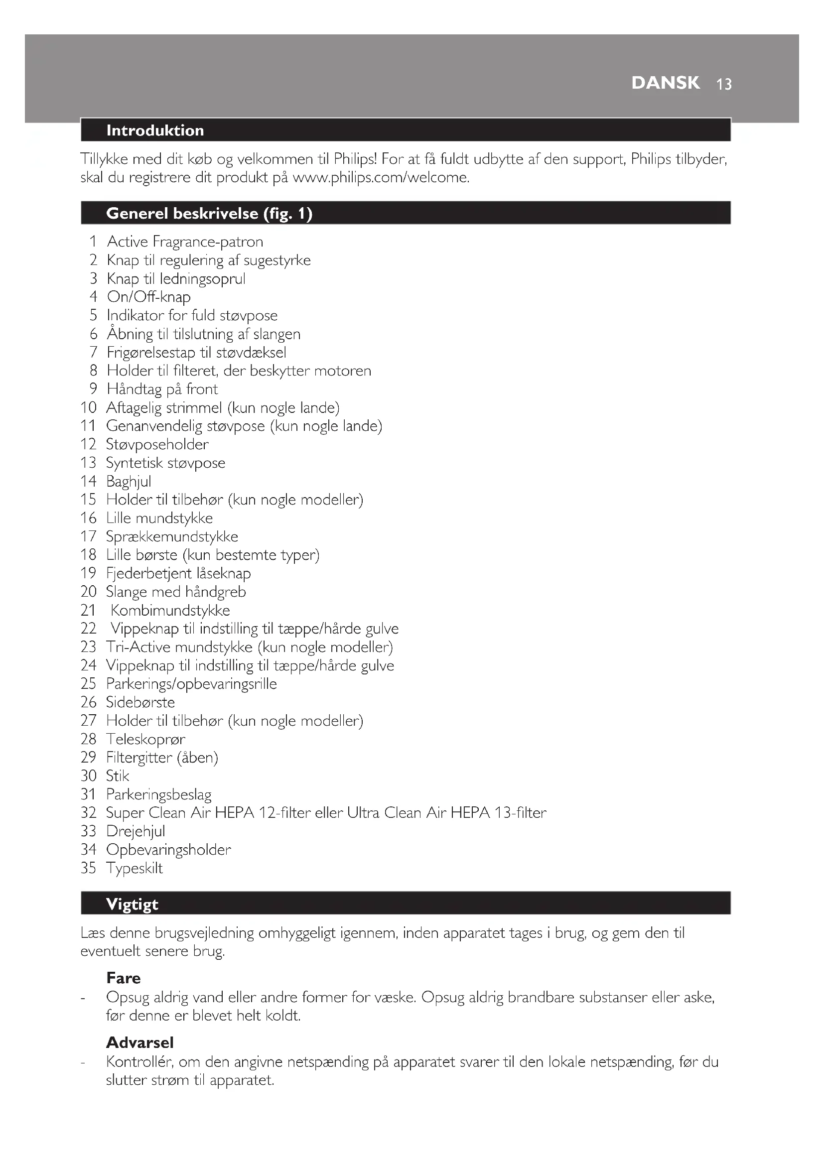 ENGLISH1213 Introduktion Tillykke med dit køb og velkommen til Philips! For at få fuldt udbytte af den support, Philips tilbyder, skal du registrere dit produkt på www.philips.com/welcome. Generel beskrivelse (g. 1) 1 Active Fragrance-patron 2 Knap til regulering af sugestyrke 3 Knap til ledningsoprul 4 On/Off-knap 5 Indikator for fuld støvpose 6 Åbning til tilslutning af slangen 7 Frigørelsestap til støvdæksel 8 Holder til lteret, der beskytter motoren 9 Håndtag på front 10 Aftagelig strimmel (kun nogle lande) 11 Genanvendelig støvpose (kun nogle lande) 12 Støvposeholder 13 Syntetisk støvpose 14 Baghjul 15 Holder til tilbehør (kun nogle modeller) 16 Lille mundstykke 17 Sprækkemundstykke 18 Lille børste (kun bestemte typer) 19 Fjederbetjent låseknap 20 Slange med håndgreb 21 Kombimundstykke 22 Vippeknap til indstilling til tæppe/hårde gulve 23 Tri-Active mundstykke (kun nogle modeller) 24 Vippeknap til indstilling til tæppe/hårde gulve 25 Parkerings/opbevaringsrille 26 Sidebørste 27 Holder til tilbehør (kun nogle modeller) 28 Teleskoprør 29 Filtergitter (åben) 30 Stik 31 Parkeringsbeslag 32 Super Clean Air HEPA 12-lter eller Ultra Clean Air HEPA 13-lter 33 Drejehjul 34 Opbevaringsholder 35 Typeskilt Vigtigt Læs denne brugsvejledning omhyggeligt igennem, inden apparatet tages i brug, og gem den til eventuelt senere brug. Fare Opsug aldrig vand eller andre former for væske. Opsug aldrig brandbare substanser eller aske, før denne er blevet helt koldt. Advarsel Kontrollér, om den angivne netspænding på apparatet svarer til den lokale netspænding, før du slutter strøm til apparatet.
