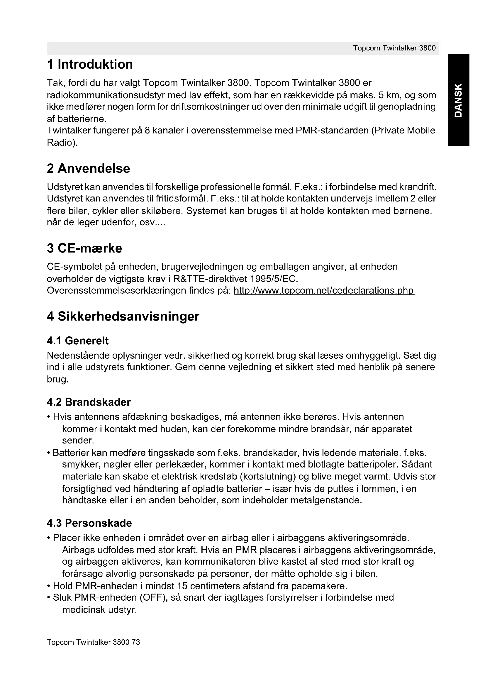 - Sluk PMR-enheden (OFF), så snart der iagttages forstyrrelser i forbindelse med medicinsk udstyr.74 Topcom Twintalker 3800 Topcom Twintalker 3800