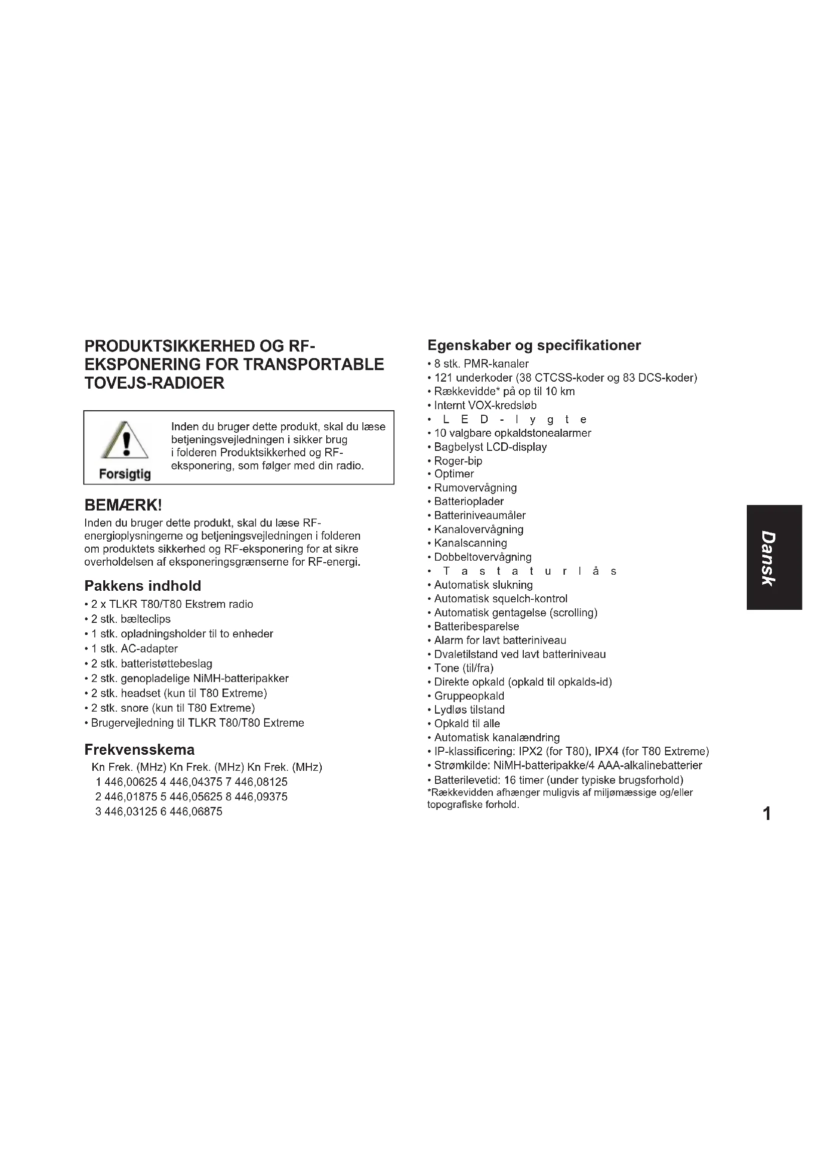 - Brugervejledning til TLKR T80/T80 Extreme Frekvensskema Egenskaber og specifikationer
