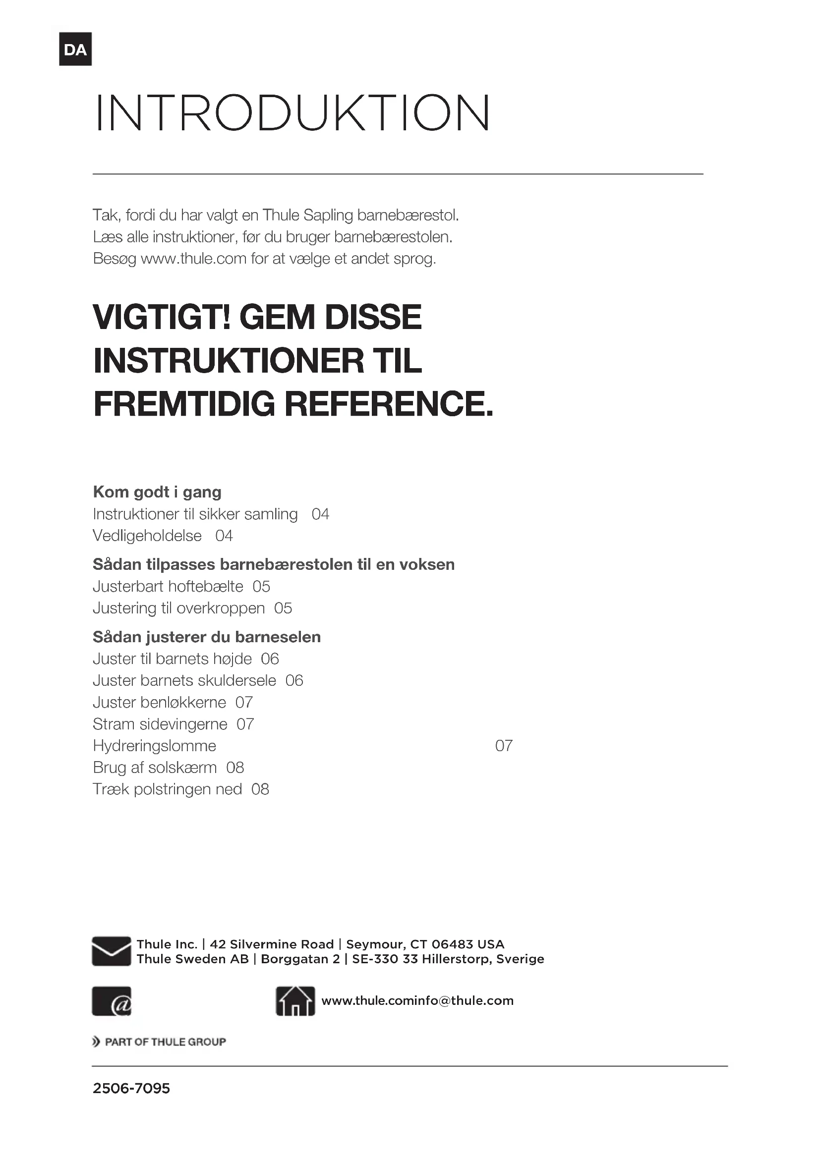 ADVARSEL! Fare for fald eller kvælning. Af sikkerhedsmæssige hensyn skal barnet kunne sidde opret uden hjælp ogveje mindst 7,3 kg. Efterlad ikke barnet uovervåget i barnebærestolen. Placer ikke barnebærestolen på køkkenborde, borde eller andre forhøjede overflader. Når barnet sidder i barnebærestolen, kan det sidde højere end den voksne. Paspå fareelementer som f.eks. grene, dørkarme osv. Sørg for, at alle spænder, stropper og justeringer er justeret iht. instruktionerne før hver brug. Undgå, at barnet kommer alvorligt til skade ved at falde eller glide ud, ved altid at bruge barneselesystemet og sikre, at det er justeret og fastgjort iht. instruktioner før hver brug. Vær opmærksom på følgende, når du bruger barnebærestolen: - Balancen kan påvirkes negativt pga. barnets eller den voksnes bevægelser. - Vær meget forsigtig, når du bøjer dig, læner dig fremover eller laver pludselige bevægelser. - Barnebærestolen er passende til brug ved fritidsaktiviteter, men IKKE tilsportsaktiviteter. - Vær forsigtig, når du tager barnebærestolen på eller af. For alle spænder skal du kontrollere, at der lyder et klik, når du sætter dem i, ogdu skal også trække i spændet for at sikre, at det er lukket korrekt. Maks. vægt: 22 kg (samlet vægt af barn og udstyr) Når barnet sidder i barnebærestolen, kan det blive træt. Det anbefales, atduholder hyppige pauser. Vær opmærksom på, at barnet i barnebærestolen kan lide under vejr- ogtemperaturbetingelserne, før du gør. Pas på, at du ikke beskadiger barnets fødder, når barnebærestolen er tæt påjorden/gulvet. Ekstra dele eller reservedele skal altid fås hos Thule Inc/Sweden AB.DA 4 506-7095