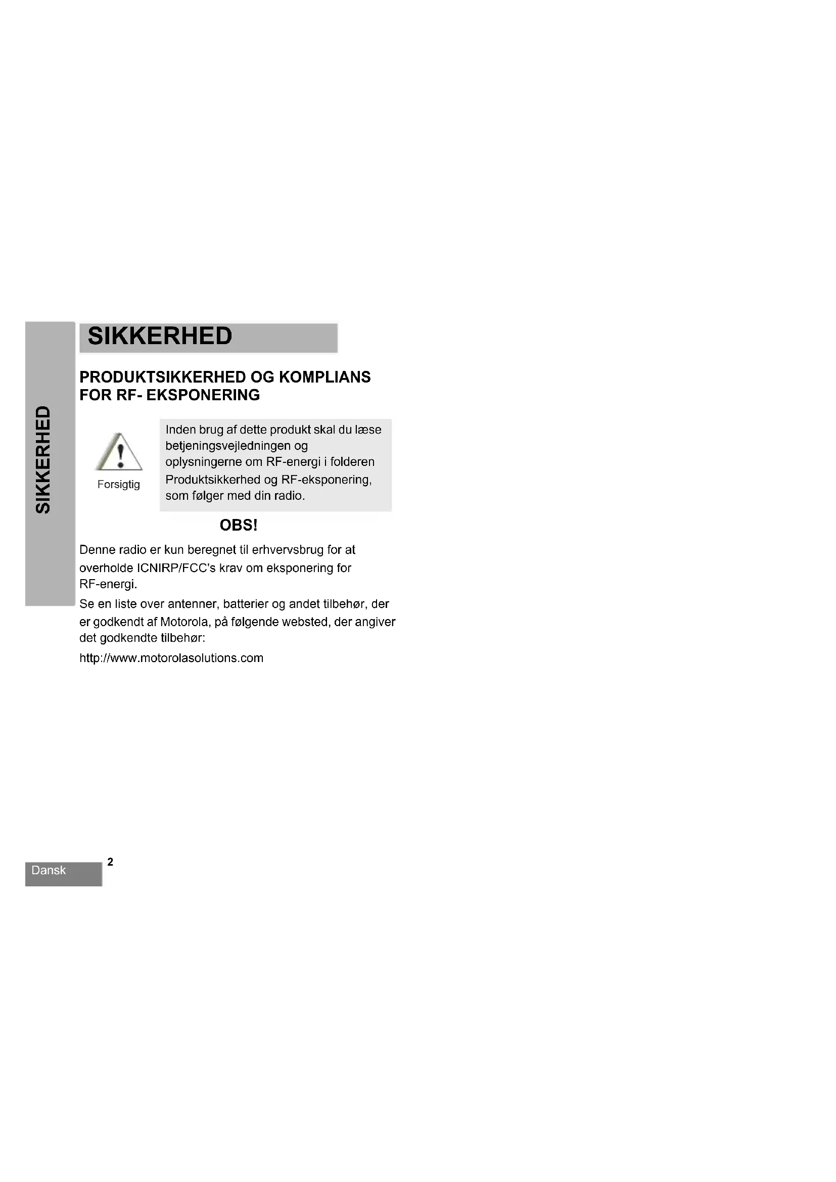 OBS! Denne radio er kun beregnet til erhvervsbrug for at overholde ICNIRP/FCC's krav om eksponering for RF-energi. Se en liste over antenner, batterier og andet tilbehør, der er godkendt af Motorola, på følgende websted, der angiver det godkendte tilbehør: http://www.motorolasolutions.com Inden brug af dette produkt skal du læse betjeningsvejledningen og oplysningerne om RF-energi i folderen Produktsikkerhed og RF-eksponering, som følger med din radio. ForsigtigDansk