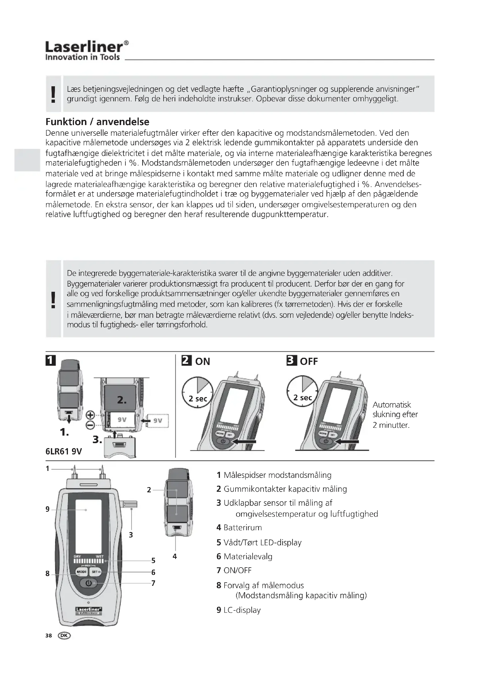 Funktion / anvendelse Denne universelle materialefugtmåler virker efter den kapacitive og modstandsmålemetoden. Ved den kapacitive målemetode undersøges via 2 elektrisk ledende gummikontakter på apparatets underside den fugtafhængige dielektricitet i det målte materiale, og via interne materialeafhængige karakteristika beregnes materialefugtigheden i %. Modstandsmålemetoden undersøger den fugtafhængige ledeevne i det målte materiale ved at bringe målespidserne i kontakt med samme målte materiale og udligner denne med de lagrede materialeafhængige karakteristika og beregner den relative materialefugtighed i %. Anvendelses- formålet er at undersøge materialefugtindholdet i træ og byggematerialer ved hjælp af den pågældende målemetode. En ekstra sensor, der kan klappes ud til siden, undersøger omgivelsestemperaturen og den relative luftfugtighed og beregner den heraf resulterende dugpunkttemperatur. Læs betjeningsvejledningen og det vedlagte hæfte „Garantioplysninger og supplerende anvisninger“ grundigt igennem. Følg de heri indeholdte instrukser. Opbevar disse dokumenter omhyggeligt.
