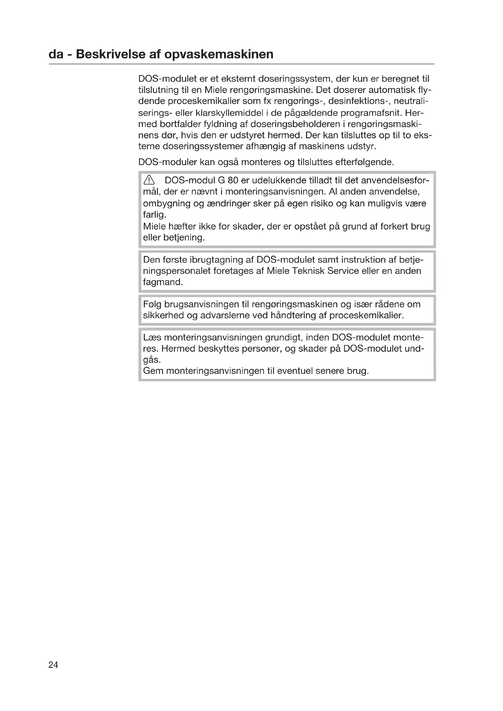 DOS-modulet er et eksternt doseringssystem, der kun er beregnet til tilslutning til en Miele rengøringsmaskine. Det doserer automatisk fly- dende proceskemikalier som fx rengørings-, desinfektions-, neutrali- serings- eller klarskyllemiddel i de pågældende programafsnit. Her- med bortfalder fyldning af doseringsbeholderen i rengøringsmaski- nens dør, hvis den er udstyret hermed. Der kan tilsluttes op til to eks- terne doseringssystemer afhængig af maskinens udstyr. DOS-moduler kan også monteres og tilsluttes efterfølgende. DOS-modul G 80 er udelukkende tilladt til det anvendelsesfor- mål, der er nævnt i monteringsanvisningen. Al anden anvendelse, ombygning og ændringer sker på egen risiko og kan muligvis være farlig. Miele hæfter ikke for skader, der er opstået på grund af forkert brug eller betjening. Den første ibrugtagning af DOS-modulet samt instruktion af betje- ningspersonalet foretages af Miele Teknisk Service eller en anden fagmand. Følg brugsanvisningen til rengøringsmaskinen og især rådene om sikkerhed og advarslerne ved håndtering af proceskemikalier. Læs monteringsanvisningen grundigt, inden DOS-modulet monte- res. Hermed beskyttes personer, og skader på DOS-modulet und- gås. Gem monteringsanvisningen til eventuel senere brug.da - Beskrivelse af opvaskemaskinen