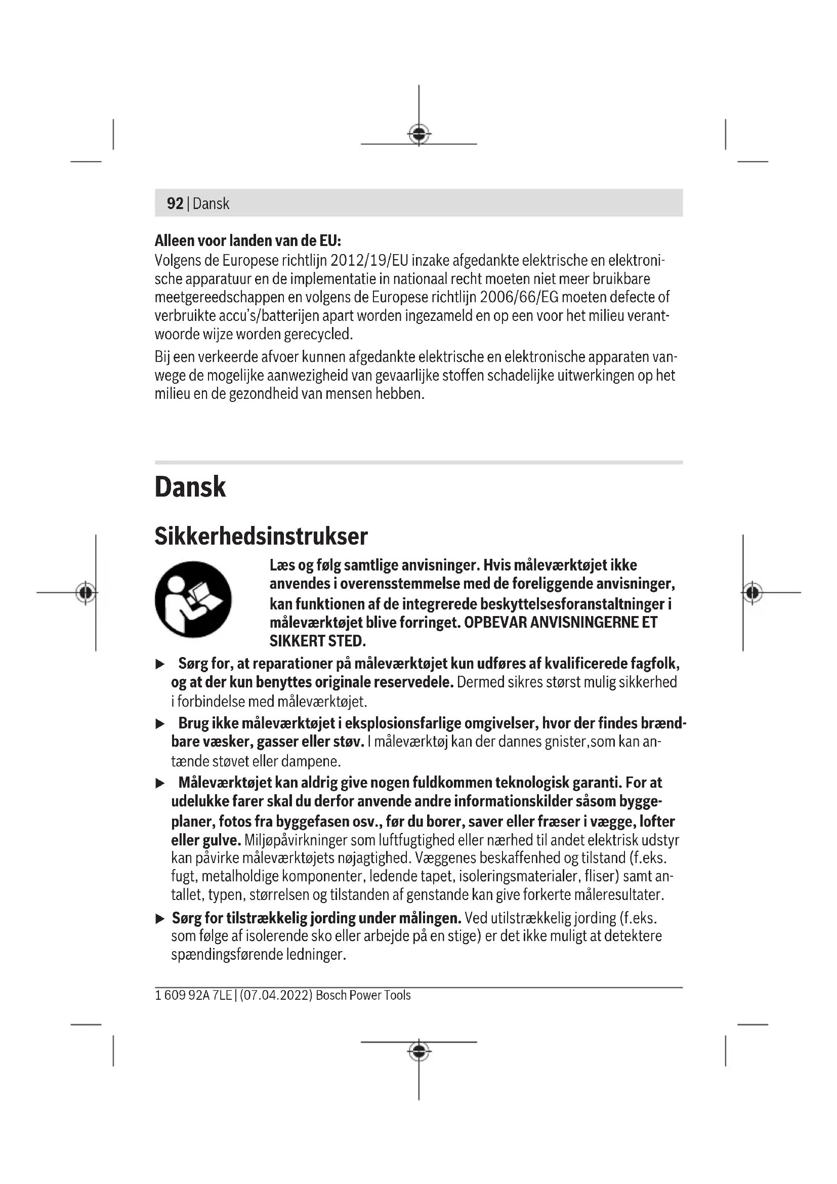 Batteri 1×9V6LR61 Driftstid ca. 5h Vægt iht. EPTA-Procedure01:2014 0,27kg Tæthedsgrad IP54 (støv- og stænkvands- beskyttet) A) afhængigt af genstandenes driftsform, materiale og størrelse samt undergrundens materiale og tilstand B) Lavere detekteringsdybde ved ikke-spændingsførende ledninger C) Der forekommer kun en ikke-ledende tilsmudsning, idet der dog lejlighedsvis må forventes en midlertidig ledeevne forårsaget af tildugning. Serienummeret(14) på typeskiltet bruges til entydig identifikation af måleværktøjet. u Hvis underlaget er af dårlig beskaffenhed, kan det påvirke måleresultatets præ- cision og detekteringsdybden negativt. Montering Isætning/udskiftning af batteri Det anbefales at bruge alkaliske manganbatterier til måleværktøjet. Hvis du vil åbne batterirummet(15), skal du trykke låsen(16) i pilens retning og tage batteridækslet af. Sæt batteriet i. Sørg i den forbindelse for, at polerne vender rigtigt som vist på indersiden af batterirum- met. Bosch Power Tools 1 609 92A 7LE | (07.04.2022)96 | Dansk u Tag batteriet ud af måleværktøjet, hvis du ikke skal anvende det i længere tid. Batteriet kan korrodere og aflade sig selv, hvis det sidder i måleværktøjet i længere tid. Batteri-visning Batterivisningen(h) på displayet angiver altid den aktuelle batteristatus: Visning Kapacitet 60–100% 30–60% 5–30% 0–5% Brug u Beskyt måleværktøjet mod fugt og direkte sollys. u Udsæt ikke måleværktøjet for ekstreme temperaturer eller temperatursvingnin- ger. Ved større temperatursvingninger skal måleværktøjets temperatur tilpasse sig, før det tages i brug. Ekstreme temperaturer eller temperatursvingninger kan på- virke måleværktøjets præcision og visningen på displayet. u Udsæt ikke måleværktøjet for voldsomme stød eller fald. Efter kraftige ydre på- virkninger og ved unormal funktion bør du lade en autoriseret Bosch-kundeservice kontrollere måleværktøjet. u Måleresultaterne kan principielt påvirkes under bestemte omgivelsesbetingel- ser. Dette gælder bl.a. afstanden til andre enheder, som udsender kraftige elek- triske, magnetiske eller elektromagnetiske felter, fugt, metalholdige byggema- terialer, folielaminerede isoleringsmaterialer samt ledende tapeter eller fliser. Vær derfor også opmærksom på andre informationskilder (f.eks. bygningstegninger), før du borer, saver eller fræser i vægge, lofter eller gulve. u Hold kun måleværktøjet i grebsfladerne (8), så du ikke påvirker målingen. u I sensorområdet(13) bag på måleværktøjet må der ikke placeres mærkater eller plader. Især metalplader påvirker måleresultaterne. Bær ikke handsker under målingen, og sørg for tilstrækkelig jor- ding. Ved utilstrækkelig jordtilslutning kan registreringen af spæn- dingsførende ledninger påvirkes. 1 609 92A 7LE | (07.04.2022) Bosch Power ToolsDansk | 97 Sørg for, at der ikke befinder sig apparater, der udsender stærke elektriske, magnetiske eller elektromagnetiske felter, i nærhe- den, når du måler. Deaktiver de pågældende funktioner på appara- ter, hvis stråling kan påvirke målingen, eller sluk apparaterne helt. Ibrugtagning Tænd/sluk u Før måleværktøjet tændes skal man sikre sig, at sensorområdet(13) ikke er fug- tigt. Tør om nødvendigt måleværktøjet med en klud. u Hvis måleværktøjet udsættes for store temperaturudsving, skal måleværktøjets temperatur tilpasse sig, før det tages i brug. Når du vil tænde måleværktøjet, skal du trykke på tænd/sluk-knappen(5). Når du vil slukke for måleværktøjet, skal du trykke på tænd/sluk-knappen(5) igen. Hvis du ikke trykker på nogen knap på måleværktøjet i ca.5min, og der ikke søges efter nogen objekter, slukker måleværktøjet automatisk, så batteriet skånes. Tænd/sluk af displaybelysning Med knappen til displaybelysning(6) kan du tænde og slukke for displaybelysningen. Signaltone til/fra Med knappen signaltone(7) kan du slå signaltonen til og fra. Når signaltonen er slået fra, ses visningen for signaltone(a) på displayet. Funktionsmåde (sebilledeB) Med måleværktøjet kontrolleres underlaget i sensorområdet(13) i måleretningA indtil den maksimale registreringsdybde. Der registreres objekter, som adskiller sig fra væg- materialet. Bevæge måleværktøjet i en lige linje over væggen i retningen B. Bevæg hele tiden måleværktøjet med et let tryk over overfladen uden at løfte det eller ændre tryk. Under målingen skal glideren(12) hele tiden have kontakt med overfladen. Måleprocedure Sæt måleværktøjet på den overflade, du vil undersøge, og bevæg det i retningen B. – Når måleværktøjet nærmer sig et objekt, bliver udslaget på målevisningen(i) kraftige- re, og lysringen(1) lyser gult. – Når måleværktøjet fjernes fra objektet, bliver udslaget svagere. Bosch Power Tools 1 609 92A 7LE | (07.04.2022)98 | Dansk – Over midten af objektet viser målevisningen det maksimal udslag, lysringen(1) lyser rødt, og der lyder en signaltone. Ved små og dybtliggende objekter kan lysringen(1) stadig lyse gult og signaltonen ude- blive. u Bredere objekter vises ikke i hele bredden via lysringen eller signaltonen. For at lokalisere objektet præcist skal du bevæge måleværktøjet flere gange (3×) frem og tilbage over objektet. I alle driftstilstande aktiveres finskalaen(j) automatisk. Finskalaen viser fuldt udslag, når objektet ligger under midten af sensoren, eller det maksimale ud- slag på målevisningen(i) nås. Desuden lyser visningen af objektmidtenCENTER(k) sta- dig i driftstilstandene "Elementbyggeri" og "Metal". Bredere objekter bag overfladen ses med et konstant højt udslag i målevisningen(i) og på finskalen(j). Lysringen(1) lyser gult. Det konstant høje udslag svarer cirka til bredden af objektet. Hvis der søges efter meget små og dybtliggende objekter, og målevisningen(i) kun giver et lavt udslag, skal du bevæge måleværktøjet flere gange vandret og lodret over objektet. Vær