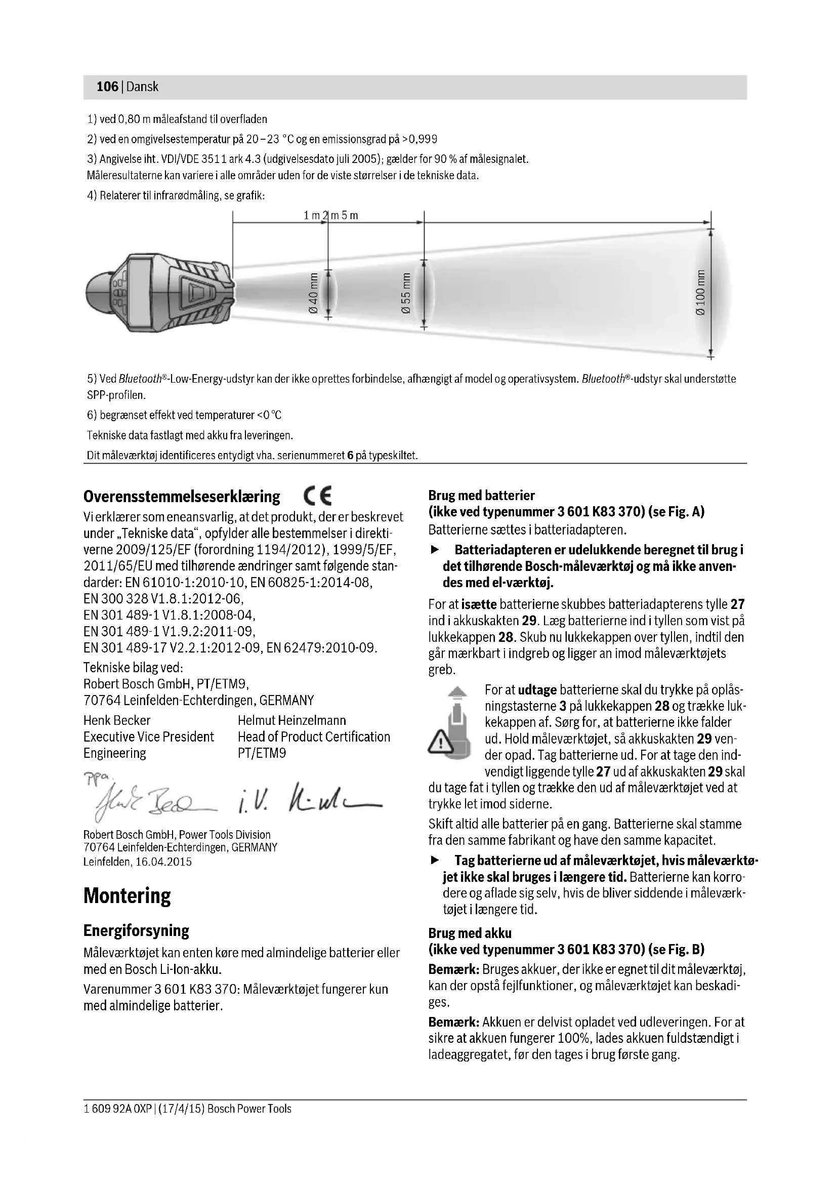 –10...+50 °C –20...+70 °C Anbefalede batterier GBA 10,8V ... – Anbefalede ladere AL 11.. CV – OBJ_BUCH-2270-002.book Page 105 Friday, April 17, 2015 9:48 AM106 | Dansk 1 609 92A 0XP | (17/4/15) Bosch Power Tools Overensstemmelseserklæring Vi erklærer som eneansvarlig, at det produkt, der er beskrevet under „Tekniske data“, opfylder alle bestemmelser i direkti- verne 2009/125/EF (forordning 1194/2012), 1999/5/EF, 2011/65/EU med tilhørende ændringer samt følgende stan- darder: EN 61010-1:2010-10, EN 60825-1:2014-08, EN 300 328 V1.8.1:2012-06, EN 301 489-1 V1.8.1:2008-04, EN 301 489-1 V1.9.2:2011-09, EN 301 489-17 V2.2.1:2012-09, EN 62479:2010-09. Tekniske bilag ved: Robert Bosch GmbH, PT/ETM9, 70764 Leinfelden-Echterdingen, GERMANY Robert Bosch GmbH, Power Tools Division70764 Leinfelden-Echterdingen, GERMANYLeinfelden, 16.04.2015 Montering Energiforsyning Måleværktøjet kan enten køre med almindelige batterier eller med en Bosch Li-Ion-akku. Varenummer 3 601 K83 370: Måleværktøjet fungerer kun med almindelige batterier. Brug med batterier (ikke ved typenummer 3 601 K83 370) (se Fig. A) Batterierne sættes i batteriadapteren. Batteriadapteren er udelukkende beregnet til brug i det tilhørende Bosch-måleværktøj og må ikke anven- des med el-værktøj. For at isætte batterierne skubbes batteriadapterens tylle 27 ind i akkuskakten 29. Læg batterierne ind i tyllen som vist på lukkekappen 28. Skub nu lukkekappen over tyllen, indtil den går mærkbart i indgreb og ligger an imod måleværktøjets greb. For at udtage batterierne skal du trykke på oplås- ningstasterne 3 på lukkekappen 28 og trække luk- kekappen af. Sørg for, at batterierne ikke falder ud. Hold måleværktøjet, så akkuskakten 29 ven- der opad. Tag batterierne ud. For at tage den ind- vendigt liggende tylle 27 ud af akkuskakten 29 skal du tage fat i tyllen og trække den ud af måleværktøjet ved at trykke let imod siderne. Skift altid alle batterier på en gang. Batterierne skal stamme fra den samme fabrikant og have den samme kapacitet. Tag batterierne ud af måleværktøjet, hvis måleværktø- jet ikke skal bruges i længere tid. Batterierne kan korro- dere og aflade sig selv, hvis de bliver siddende i måleværk- tøjet i længere tid. Brug med akku (ikke ved typenummer 3 601 K83 370) (se Fig. B) Bemærk: Bruges akkuer, der ikke er egnet til dit måleværktøj, kan der opstå fejlfunktioner, og måleværktøjet kan beskadi- ges. Bemærk: Akkuen er delvist opladet ved udleveringen. For at sikre at akkuen fungerer 100%, lades akkuen fuldstændigt i ladeaggregatet, før den tages i brug første gang.