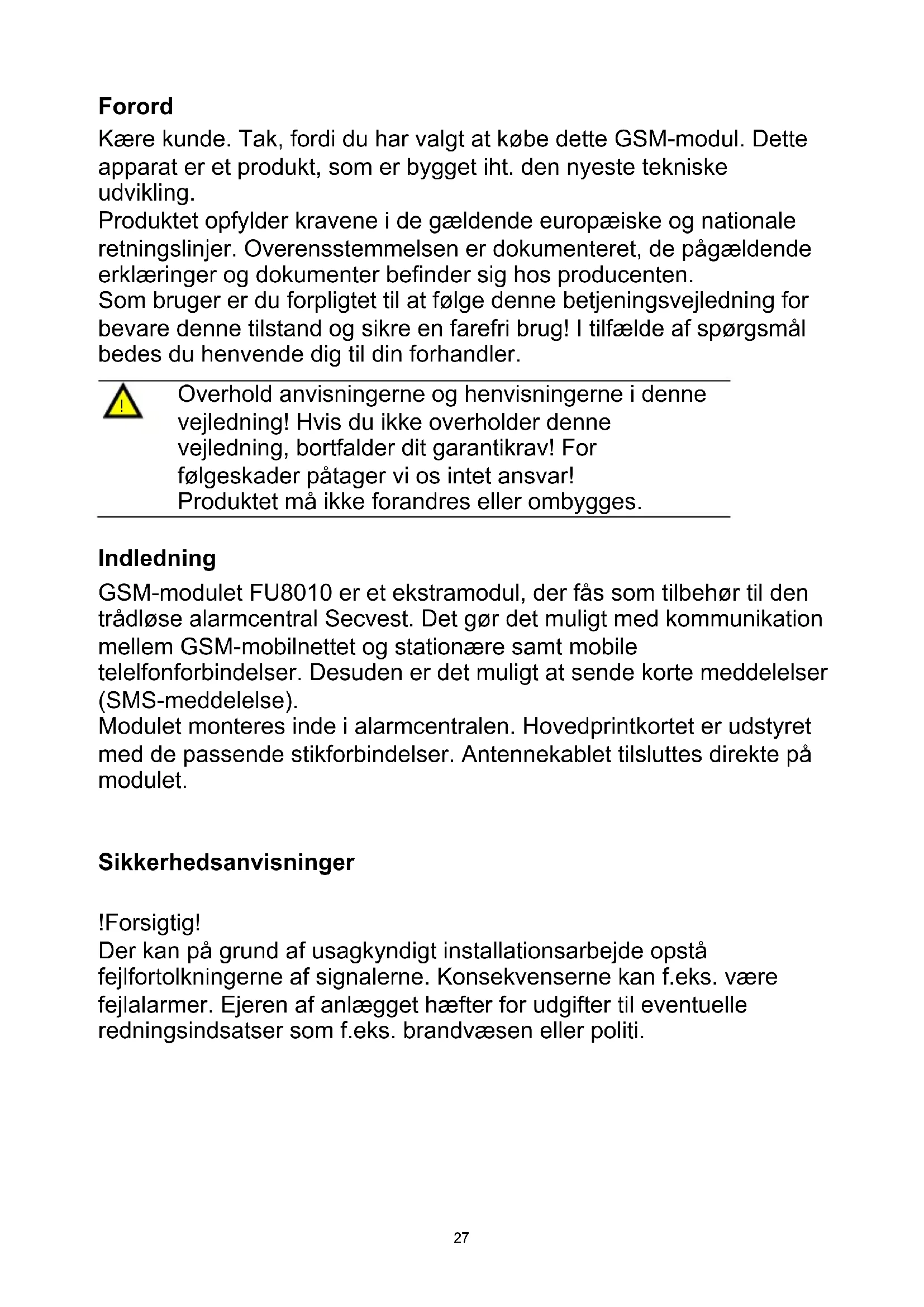 Overhold anvisningerne og henvisningerne i denne vejledning! Hvis du ikke overholder denne vejledning, bortfalder dit garantikrav! For følgeskader påtager vi os intet ansvar! Produktet må ikke forandres eller ombygges. Indledning GSM-modulet FU8010 er et ekstramodul, der fås som tilbehør til den trådløse alarmcentral Secvest. Det gør det muligt med kommunikation mellem GSM-mobilnettet og stationære samt mobile telelfonforbindelser. Desuden er det muligt at sende korte meddelelser (SMS-meddelelse). Modulet monteres inde i alarmcentralen. Hovedprintkortet er udstyret med de passende stikforbindelser. Antennekablet tilsluttes direkte på modulet. Sikkerhedsanvisninger !Forsigtig! Der kan på grund af usagkyndigt installationsarbejde opstå fejlfortolkningerne af signalerne. Konsekvenserne kan f.eks. være fejlalarmer. Ejeren af anlægget hæfter for udgifter til eventuelle redningsindsatser som f.eks. brandvæsen eller politi.