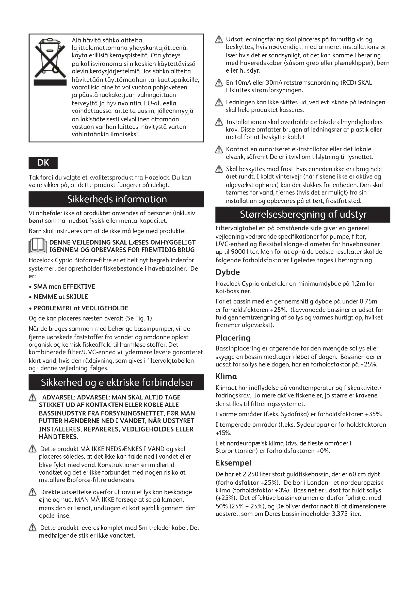 HÅNDTERES. Dette produkt MÅ IKKE NEDSÆNKES I VAND og skal placeres således, at det ikke kan falde ned i vandet eller blive fyldt med vand. Konstruktionen er imidlertid vandtæt og det er ikke forbundet med nogen risiko at installere Bioforce-filtre udendørs. Direkte udsættelse overfor ultraviolet lys kan beskadige øjne og hud. MAN MÅ IKKE forsøge at se på lampen, mens den er tændt, undtagen et kort øjeblik gennem den opale linse. Dette produkt leveres komplet med 5m treleder kabel. Det medfølgende stik er ikke vandtæt. Udsat ledningsføring skal placeres på fornuftig vis og beskyttes, hvis nødvendigt, med armeret installationsrør, især hvis det er sandsynligt, at det kan komme i berøring med haveredskaber (såsom greb eller plæneklipper), børn eller husdyr. En 10mA eller 30mA retstrømsanordning (RCD) SKAL tilsluttes strømforsyningen. Ledningen kan ikke skiftes ud, ved evt. skade på ledningen skal hele produktet kasseres. Installationen skal overholde de lokale elmyndigheders krav. Disse omfatter brugen af ledningsrør af plastik eller metal for at beskytte kablet. Kontakt en autoriseret el-installatør eller det lokale elværk, såfremt De er i tvivl om tilslytning til lysnettet. Skal beskyttes mod frost, hvis enheden ikke er i brug hele året rundt. I koldt vintervejr (når fiskene ikke er aktive og algevækst ophører) kan der slukkes for enheden. Den skal tømmes for vand, fjernes (hvis det er muligt) fra sin installation og opbevares på et tørt, frostfrit sted. Størrelsesberegning af udstyr Filtervalgtabellen på omstående side giver en generel vejledning vedrørende specifikationer for pumpe, filter, UVC-enhed og fleksibel slange-diameter for havebassiner up til 9000 liter. Men for at opnå de bedste resultater skal de følgende forholdsfaktorer ligeledes tages i betragtning. Dybde Hozelock Cyprio anbefaler en minimumdybde på 1,2m for Koi-bassiner. For et bassin med en gennemsnitlig dybde på under 0,75m er forholdsfaktoren +25%. (Lavvandede bassiner er udsat for fuld gennemtrængning af sollys og varmes hurtigt op, hvilket fremmer algevækst). Placering Bassinplacering er afgørende for den mængde sollys eller skygge en bassin modtager i løbet af dagen. Bassiner, der er udsat for sollys hele dagen, har en forholdsfaktor på +25%. Klima Klimaet har indflydelse på vandtemperatur og fiskeaktivitet/ fodringskrav. Jo mere aktive fiskene er, jo større er kravene der stilles til filtreringssystemet. I varme områder (f.eks. Sydafrika) er forholdsfaktoren +35%. I temperede områder (f.eks. Sydeuropa) er forholdsfaktoren +15%. I et nordeuropæisk klima (dvs. de fleste områder i Storbrittanien) er forholdsfaktoren +0%. Eksempel De har et 2.250 liter stort guldfiskebassin, der er 60 cm dybt (forholdsfaktor +25%). De bor i London - et nordeuropæisk klima (forholdsfaktor +0%). Bassinet er udsat for fuldt sollys (+25%). Det effektive bassinvolumen er derfor forhøjet med 50% (25% + 25%), og De bliver derfor nødt til at dimensionere udstyret, som om Deres bassin indeholder 3.375 liter.Installation