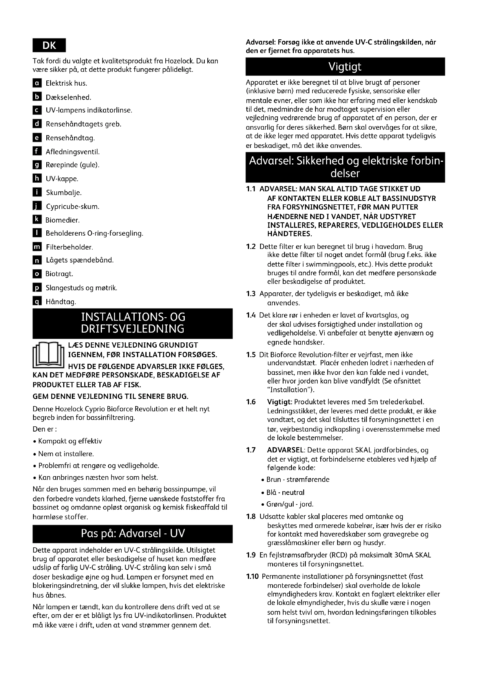 - Kan anbringes næsten hvor som helst. Når den bruges sammen med en behørig bassinpumpe, vil den forbedre vandets klarhed, fjerne uønskede faststoffer fra bassinet og omdanne opløst organisk og kemisk fiskeaffald til harmløse stoffer. Pas på: Advarsel - UV Dette apparat indeholder en UV-C strålingskilde. Utilsigtet brug af apparatet eller beskadigelse af huset kan medføre udslip af farlig UV-C stråling. UV-C stråling kan selv i små doser beskadige øjne og hud. Lampen er forsynet med en blokeringsindretning, der vil slukke lampen, hvis det elektriske hus åbnes. Når lampen er tændt, kan du kontrollere dens drift ved at se efter, om der er et blåligt lys fra UV-indikatorlinsen. Produktet må ikke være i drift, uden at vand strømmer gennem det. Advarsel: Forsøg ikke at anvende UV-C strålingskilden, når den er fjernet fra apparatets hus. Vigtigt Apparatet er ikke beregnet til at blive brugt af personer (inklusive børn) med reducerede fysiske, sensoriske eller mentale evner, eller som ikke har erfaring med eller kendskab til det, medmindre de har modtaget supervision eller vejledning vedrørende brug af apparatet af en person, der er ansvarlig for deres sikkerhed. Børn skal overvåges for at sikre, at de ikke leger med apparatet. Hvis dette apparat tydeligvis er beskadiget, må det ikke anvendes. Advarsel: Sikkerhed og elektriske forbin- delser