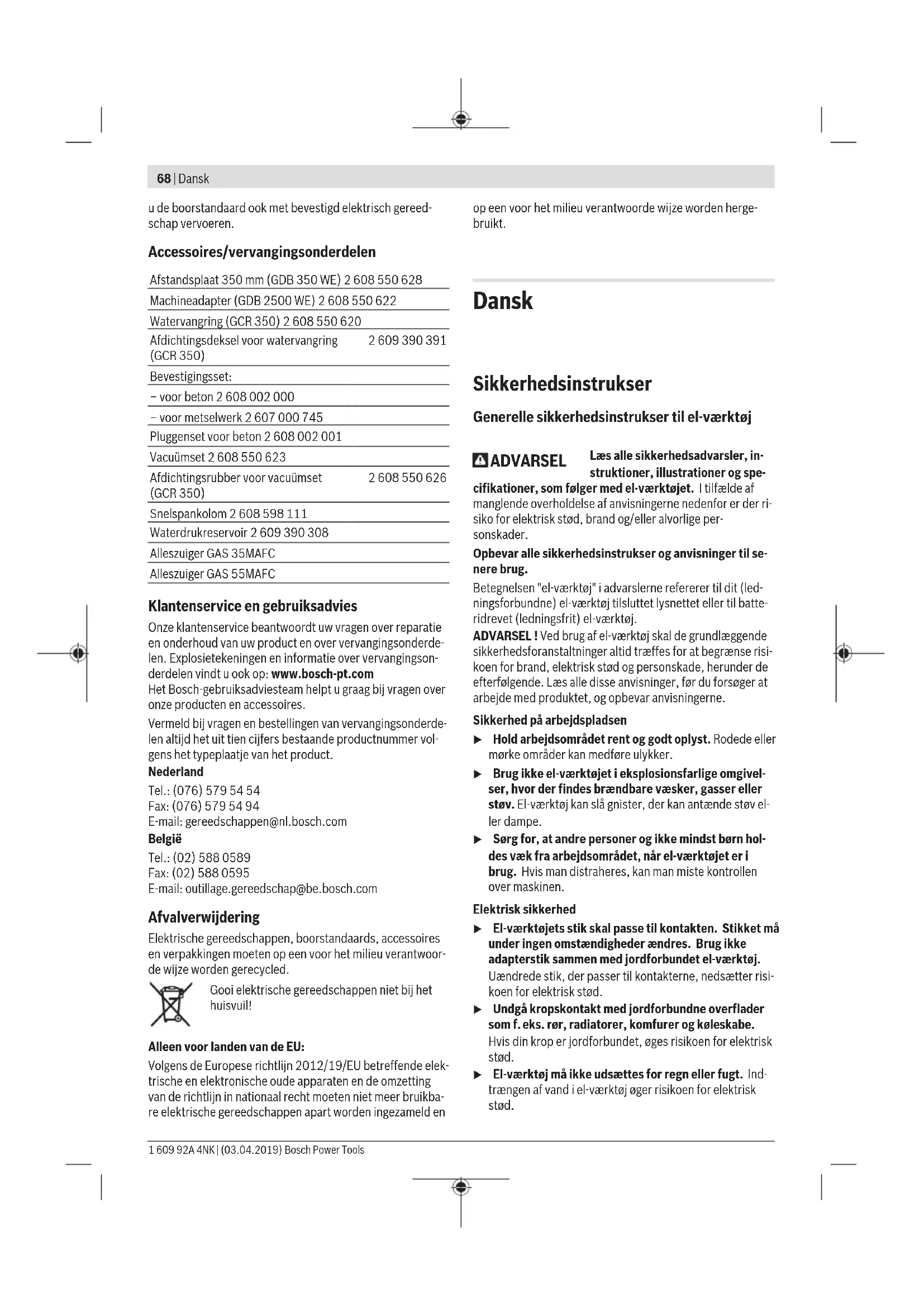 Snelspankolom 2 608 598 111 Waterdrukreservoir 2 609 390 308 Alleszuiger GAS 35MAFC Alleszuiger GAS 55MAFC Klantenservice en gebruiksadvies Onze klantenservice beantwoordt uw vragen over reparatie en onderhoud van uw product en over vervangingsonderde- len. Explosietekeningen en informatie over vervangingson- derdelen vindt u ook op: www.bosch-pt.com Het Bosch-gebruiksadviesteam helpt u graag bij vragen over onze producten en accessoires. Vermeld bij vragen en bestellingen van vervangingsonderde- len altijd het uit tien cijfers bestaande productnummer vol- gens het typeplaatje van het product. Nederland Tel.: (076) 579 54 54 Fax: (076) 579 54 94 E-mail: gereedschappen@nl.bosch.com België Tel.: (02) 588 0589 Fax: (02) 588 0595 E-mail: outillage.gereedschap@be.bosch.com Afvalverwijdering Elektrische gereedschappen, boorstandaards, accessoires en verpakkingen moeten op een voor het milieu verantwoor- de wijze worden gerecycled. Gooi elektrische gereedschappen niet bij het huisvuil! Alleen voor landen van de EU: Volgens de Europese richtlijn 2012/19/EU betreffende elek- trische en elektronische oude apparaten en de omzetting van de richtlijn in nationaal recht moeten niet meer bruikba- re elektrische gereedschappen apart worden ingezameld en op een voor het milieu verantwoorde wijze worden herge- bruikt. Dansk Sikkerhedsinstrukser Generelle sikkerhedsinstrukser til el‑værktøj ADVARSEL Læs alle sikkerhedsadvarsler, in- struktioner, illustrationer og spe- cifikationer, som følger med el-værktøjet. I tilfælde af manglende overholdelse af anvisningerne nedenfor er der ri- siko for elektrisk stød, brand og/eller alvorlige per- sonskader. Opbevar alle sikkerhedsinstrukser og anvisninger til se- nere brug. Betegnelsen "el-værktøj" i advarslerne refererer til dit (led- ningsforbundne) el-værktøj tilsluttet lysnettet eller til batte- ridrevet (ledningsfrit) el-værktøj. ADVARSEL ! Ved brug af el-værktøj skal de grundlæggende sikkerhedsforanstaltninger altid træffes for at begrænse risi- koen for brand, elektrisk stød og personskade, herunder de efterfølgende. Læs alle disse anvisninger, før du forsøger at arbejde med produktet, og opbevar anvisningerne. Sikkerhed på arbejdspladsen u Hold arbejdsområdet rent og godt oplyst. Rodede eller mørke områder kan medføre ulykker. u Brug ikke el‑værktøjet i eksplosionsfarlige omgivel- ser, hvor der findes brændbare væsker, gasser eller støv. El‑værktøj kan slå gnister, der kan antænde støv el- ler dampe. u Sørg for, at andre personer og ikke mindst børn hol- des væk fra arbejdsområdet, når el-værktøjet er i brug. Hvis man distraheres, kan man miste kontrollen over maskinen. Elektrisk sikkerhed u El‑værktøjets stik skal passe til kontakten. Stikket må under ingen omstændigheder ændres. Brug ikke adapterstik sammen med jordforbundet el‑værktøj. Uændrede stik, der passer til kontakterne, nedsætter risi- koen for elektrisk stød. u Undgå kropskontakt med jordforbundne overflader som f. eks. rør, radiatorer, komfurer og køleskabe. Hvis din krop er jordforbundet, øges risikoen for elektrisk stød. u El-værktøj må ikke udsættes for regn eller fugt. Ind- trængen af vand i el‑værktøj øger risikoen for elektrisk stød. 1 609 92A 4NK | (03.04.2019) Bosch Power ToolsDansk | 69 u Brug ikke ledningen til formål, den ikke er beregnet til. Du må aldrig bære el‑værktøjet i ledningen, hænge el‑værktøjet op i ledningen eller rykke i ledningen for at trække stikket ud af kontakten. Beskyt ledningen mod varme, olie, skarpe kanter eller maskindele, der er i bevægelse. Beskadigede eller indviklede ledninger øger risikoen for elektrisk stød. u Hvis el‑værktøjet benyttes i det fri, må der kun benyt- tes en forlængerledning, der er egnet til udendørs brug. Brug af forlængerledning til udendørs brug ned- sætter risikoen for elektrisk stød. u Hvis det ikke kan undgås at bruge el‑værktøjet i fugti- ge omgivelser, skal der bruges et HFI‑relæ. Brug af et HFI‑relæ reducerer risikoen for at få elektrisk stød. Personlig sikkerhed u Det er vigtigt at være opmærksom og holde øje med, hvad man laver, og bruge el‑værktøjet fornuftigt. Brug ikke el‑værktøj, hvis du er træt, har indtaget al- kohol eller er påvirket af medikamenter eller euforise- rende stoffer. Få sekunders uopmærksomhed ved brug af el‑værktøjet kan føre til alvorlige personskader. u Brug personligt beskyttelsesudstyr. Brug altid be- skyttelsesbriller. Brug af sikkerhedsudstyr som f. eks. støvmaske, skridsikkert fodtøj, beskyttelseshjelm eller høreværn afhængig af maskintype og anvendelse nedsæt- ter risikoen for personskader. u Undgå utilsigtet igangsætning. Kontrollér, at el‑værk- tøjet er slukket, før du tilslutter det til strømtilførslen og/eller batteriet, løfter eller bærer det. Undgå at bæ- re el‑værktøjet med fingeren på afbryderen og sørg for, at el‑værktøjet ikke er tændt, når det sluttes til nettet, da dette øger risikoen for personskader. u Gør det til en vane altid at fjerne indstillingsværktøj eller skruenøgle, før el‑værktøjet startes. Hvis et styk- ke værktøj eller en nøgle sidder i en roterende maskindel, er der risiko for personskader. u Undgå en unormal legemsposition. Sørg for at stå sik- kert, mens der arbejdes, og kom ikke ud af balance. Dermed har du bedre muligheder for at kontrollere el‑værktøjet, hvis der skulle opstå uventede situationer. u Brug egnet arbejdstøj. Undgå løse beklædningsgen- stande eller smykker. Hold hår og tøj væk fra dele, der bevæger sig. Dele, der er i bevægelse, kan gribe fat i løstsiddende tøj, smykker eller langt hår. u Hvis støvudsugnings- og opsamlingsudstyr kan mon- teres, er det vigtigt, at dette tilsluttes og benyttes korrekt. Brug af en støvopsugning kan reducere støv- mængden og dermed den fare, der er forbundet med støv. u Selvom du kender værktøjet godt og er vant til 