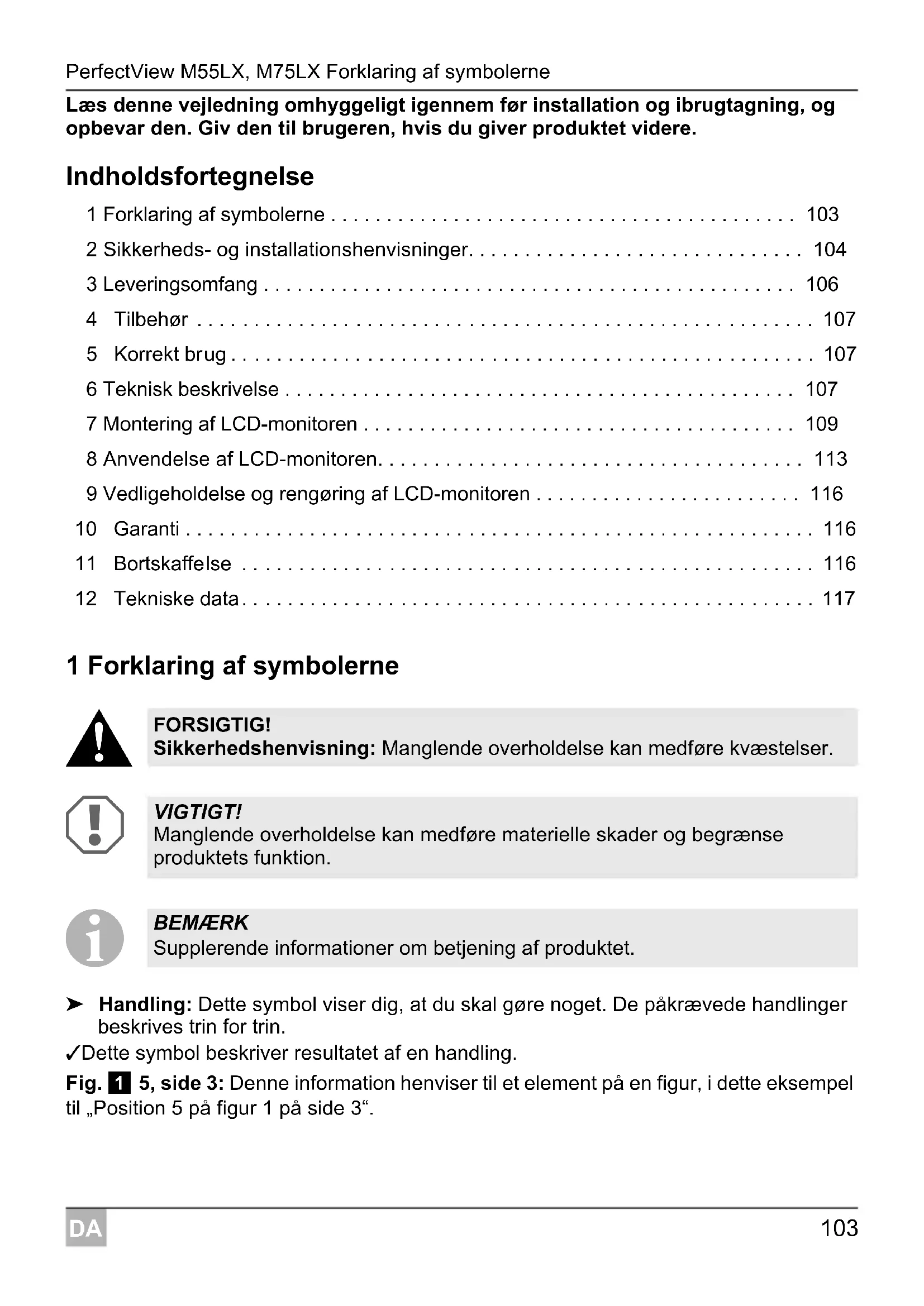 ➤ Handling: Dette symbol viser dig, at du skal gøre noget. De påkrævede handlinger beskrives trin for trin. ✓ Dette symbol beskriver resultatet af en handling. Fig. 1 5, side 3: Denne information henviser til et element på en figur, i dette eksempel til „Position 5 på figur 1 på side 3“. FORSIGTIG! Sikkerhedshenvisning: Manglende overholdelse kan medføre kvæstelser. VIGTIGT! Manglende overholdelse kan medføre materielle skader og begrænse produktets funktion. BEMÆRK Supplerende informationer om betjening af produktet.Sikkerheds- og installationshenvisninger PerfectView M55LX, M75LX