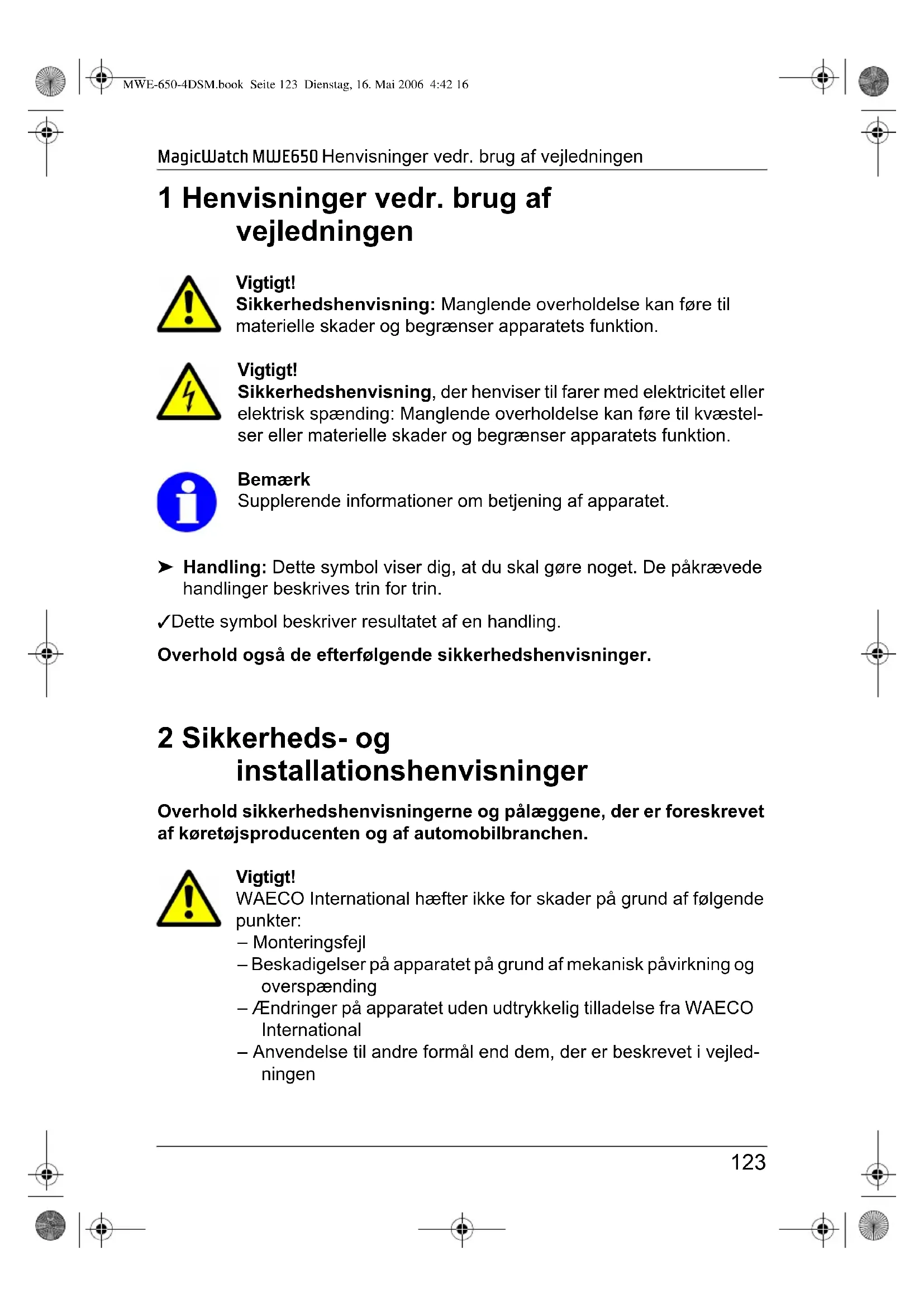 1 Henvisninger vedr. brug af vejledningen Vigtigt! Sikkerhedshenvisning: Manglende overholdelse kan føre til materielle skader og begrænser apparatets funktion. Vigtigt! Sikkerhedshenvisning, der henviser til farer med elektricitet eller elektrisk spænding: Manglende overholdelse kan føre til kvæstel- ser eller materielle skader og begrænser apparatets funktion. Bemærk Supplerende informationer om betjening af apparatet. ➤ Handling: Dette symbol viser dig, at du skal gøre noget. De påkrævede handlinger beskrives trin for trin. ✓ Dette symbol beskriver resultatet af en handling. Overhold også de efterfølgende sikkerhedshenvisninger. 2 Sikkerheds- og installationshenvisninger Overhold sikkerhedshenvisningerne og pålæggene, der er foreskrevet af køretøjsproducenten og af automobilbranchen. Vigtigt! WAECO International hæfter ikke for skader på grund af følgende punkter: – Monteringsfejl – Beskadigelser på apparatet på grund af mekanisk påvirkning og overspænding – Ændringer på apparatet uden udtrykkelig tilladelse fra WAECO International – Anvendelse til andre formål end dem, der er beskrevet i vejled- ningen MWE-650-4DSM.book Seite 123 Dienstag, 16. Mai 2006 4:42 16Sikkerheds- og installationshenvisninger MagicWatch MWE650