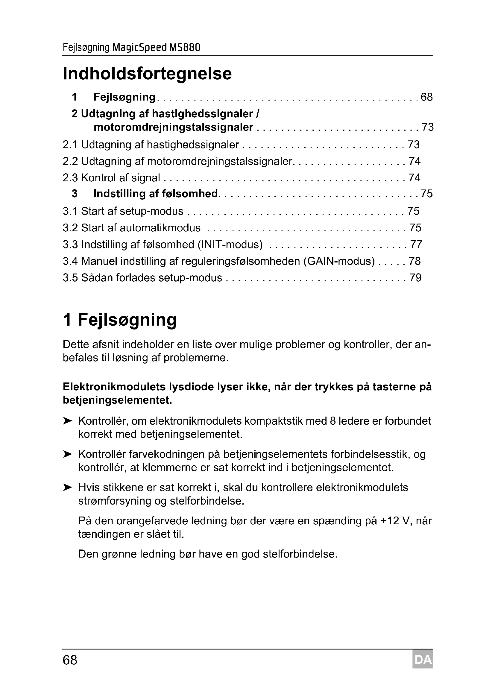 1 Fejlsøgning Dette afsnit indeholder en liste over mulige problemer og kontroller, der an- befales til løsning af problemerne. Elektronikmodulets lysdiode lyser ikke, når der trykkes på tasterne på betjeningselementet. ➤ Kontrollér, om elektronikmodulets kompaktstik med 8 ledere er forbundet korrekt med betjeningselementet. ➤ Kontrollér farvekodningen på betjeningselementets forbindelsesstik, og kontrollér, at klemmerne er sat korrekt ind i betjeningselementet. ➤ Hvis stikkene er sat korrekt i, skal du kontrollere elektronikmodulets strømforsyning og stelforbindelse. På den orangefarvede ledning bør der være en spænding på +12 V, når tændingen er slået til. Den grønne ledning bør have en god stelforbindelse. _Diag_MS880.book Seite 68 Donnerstag, 26. April 2012 7:32 19DA MagicSpeed MS880 Fejlsøgning