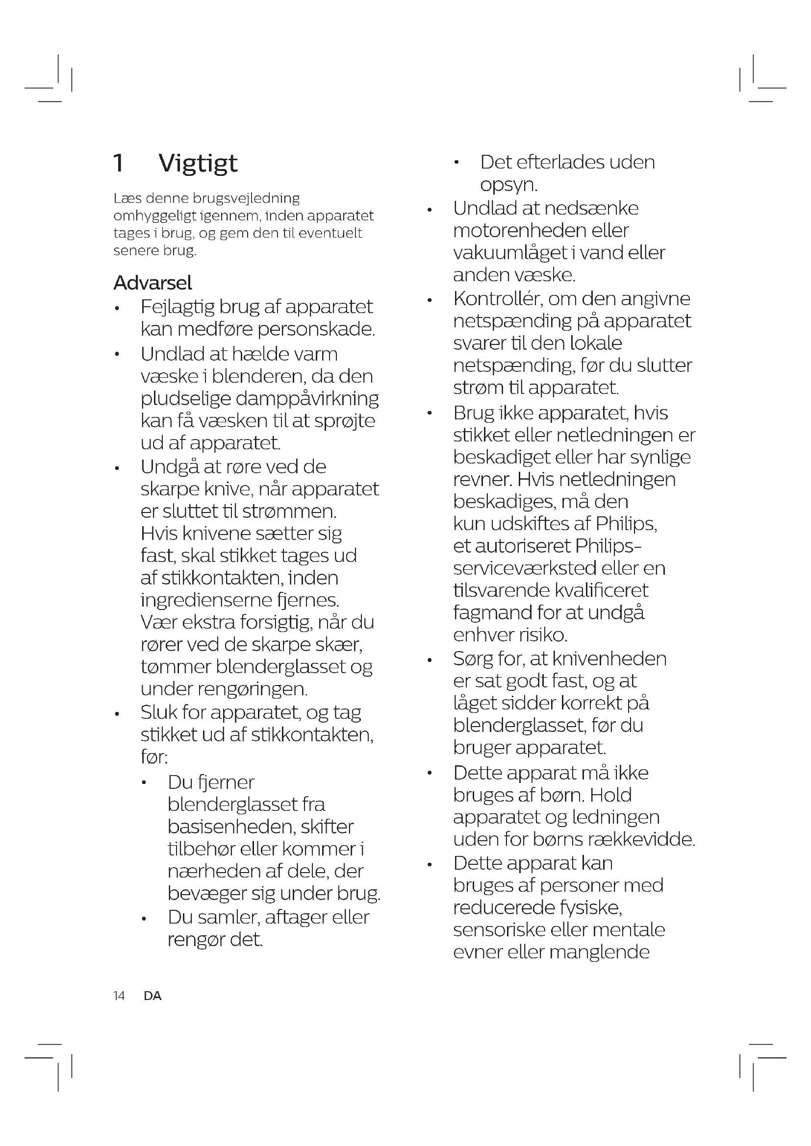 Brug ikke apparatet, hvis stikket eller netledningen er beskadiget eller har synlige revner. Hvis netledningen beskadiges, må den kun udskiftes af Philips, et autoriseret Philips- serviceværksted eller en tilsvarende kvaliceret fagmand for at undgå enhver risiko.