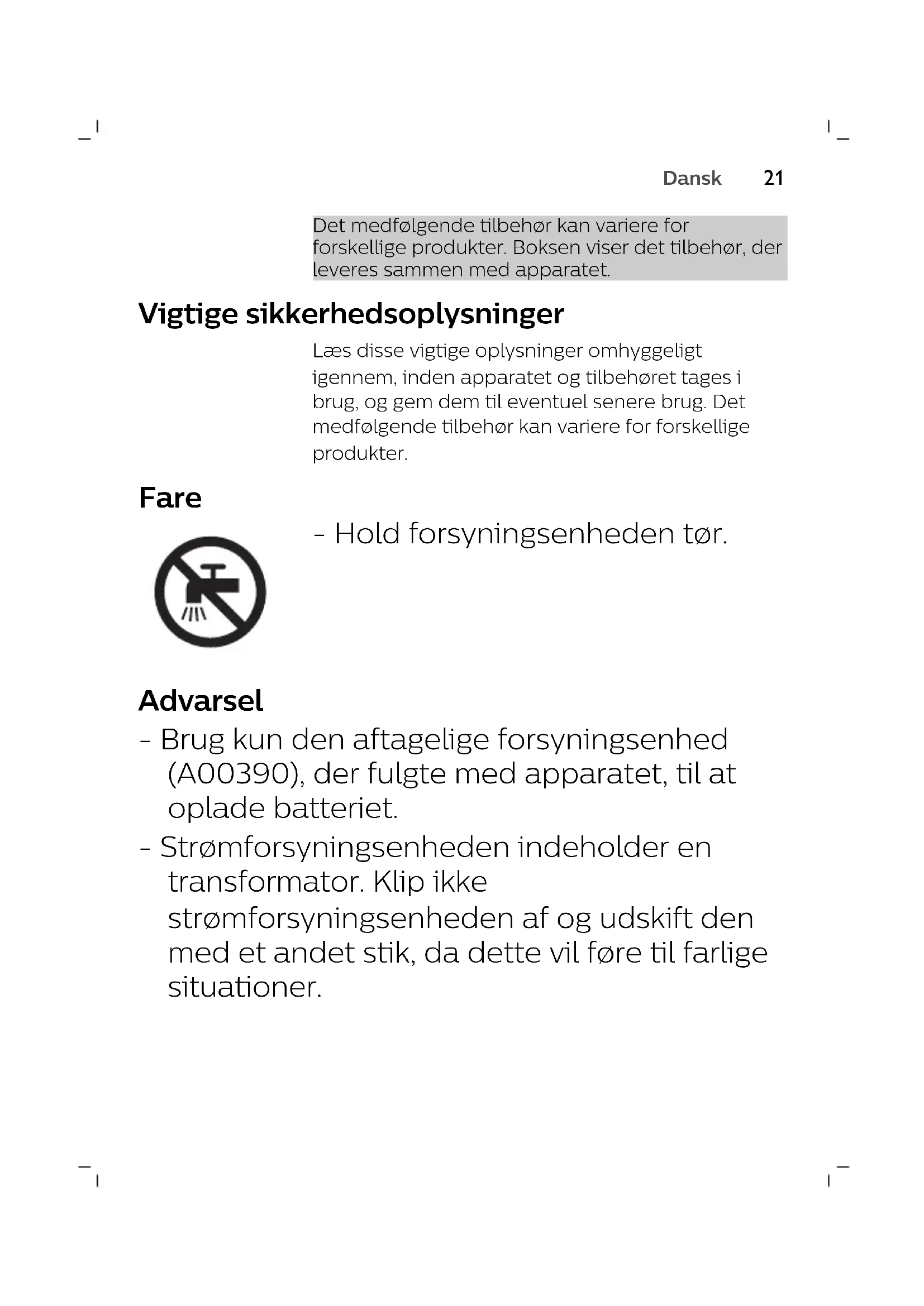 DanskDet medfølgende tilbehør kan variere for forskellige produkter. Boksen viser det tilbehør, der leveres sammen med apparatet. Vigtige sikkerhedsoplysninger Læs disse vigtige oplysninger omhyggeligt igennem, inden apparatet og tilbehøret tages i brug, og gem dem til eventuel senere brug. Det medfølgende tilbehør kan variere for forskellige produkter. Fare - Hold forsyningsenheden tør. Advarsel - Brug kun den aftagelige forsyningsenhed (A00390), der fulgte med apparatet, til at oplade batteriet. - Strømforsyningsenheden indeholder en transformator. Klip ikke strømforsyningsenheden af og udskift den med et andet stik, da dette vil føre til farlige situationer.