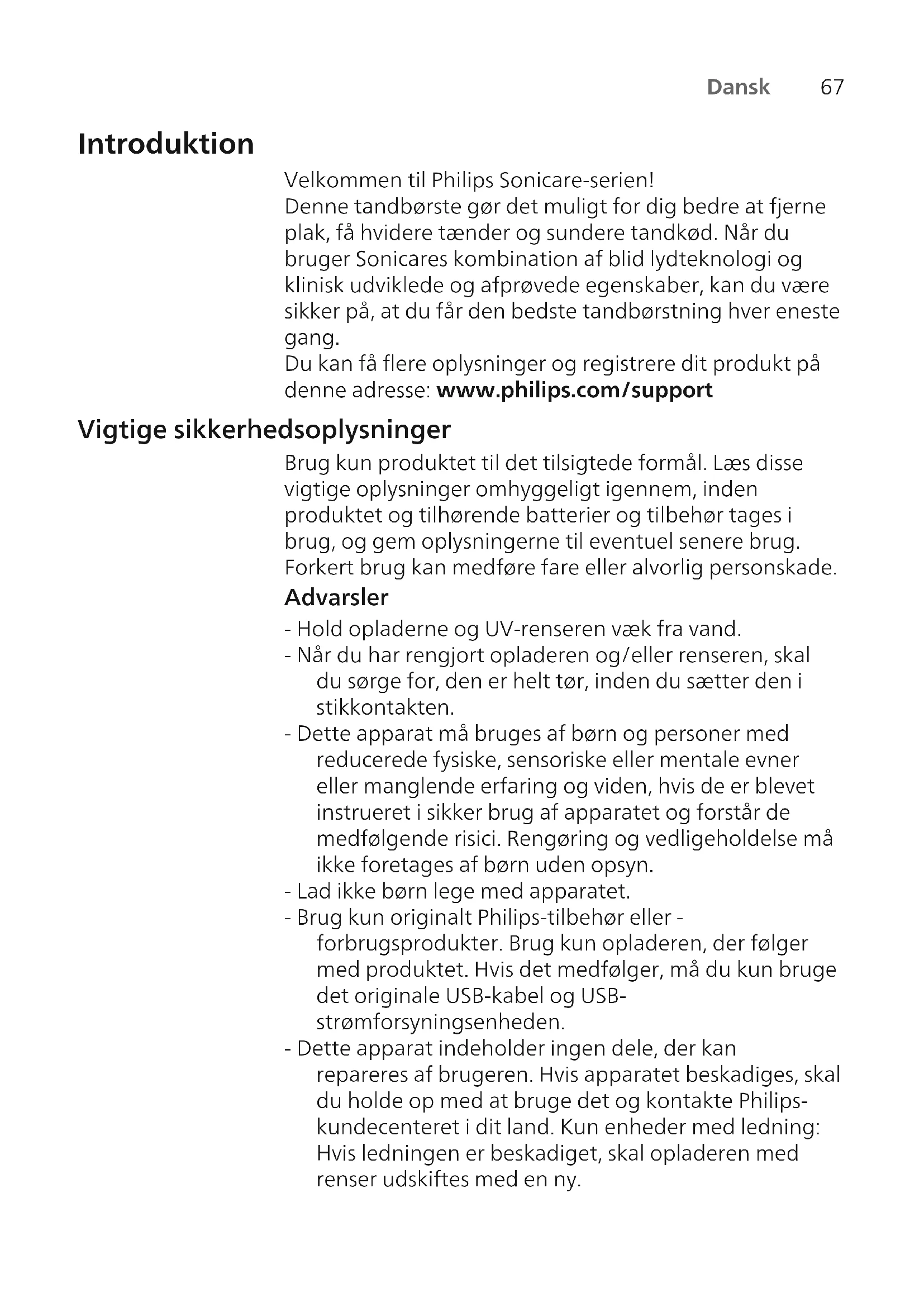 Dansk Introduktion Velkommen til Philips Sonicare-serien! Denne tandbørste gør det muligt for dig bedre at fjerne plak, få hvidere tænder og sundere tandkød. Når du bruger Sonicares kombination af blid lydteknologi og klinisk udviklede og afprøvede egenskaber, kan du være sikker på, at du får den bedste tandbørstning hver eneste gang. Du kan få flere oplysninger og registrere dit produkt på denne adresse: www.philips.com/support Vigtige sikkerhedsoplysninger Brug kun produktet til det tilsigtede formål. Læs disse vigtige oplysninger omhyggeligt igennem, inden produktet og tilhørende batterier og tilbehør tages i brug, og gem oplysningerne til eventuel senere brug. Forkert brug kan medføre fare eller alvorlig personskade. Advarsler - Hold opladerne og UV-renseren væk fra vand. - Når du har rengjort opladeren og/eller renseren, skal du sørge for, den er helt tør, inden du sætter den i stikkontakten. - Dette apparat må bruges af børn og personer med reducerede fysiske, sensoriske eller mentale evner eller manglende erfaring og viden, hvis de er blevet instrueret i sikker brug af apparatet og forstår de medfølgende risici. Rengøring og vedligeholdelse må ikke foretages af børn uden opsyn. - Lad ikke børn lege med apparatet. - Brug kun originalt Philips-tilbehør eller - forbrugsprodukter. Brug kun opladeren, der følger med produktet. Hvis det medfølger, må du kun bruge det originale USB-kabel og USB- strømforsyningsenheden. - Dette apparat indeholder ingen dele, der kan repareres af brugeren. Hvis apparatet beskadiges, skal du holde op med at bruge det og kontakte Philips- kundecenteret i dit land. Kun enheder med ledning: Hvis ledningen er beskadiget, skal opladeren med renser udskiftes med en ny.68 Dansk - Opladeren og/eller renseren må ikke bruges udendørs eller tæt på varme overflader. - Hverken dele eller tilbehør til produktet må kommes i opvaskemaskinen. - Apparatet er kun beregnet til renholdelse af tænder, tandkød og tunge. - Hold altid renseren uden for børns rækkevidde. - Stop med at bruge renseren, hvis det ultraviolette lys forbliver tændt, når lågen åbnes. Ultraviolet lys kan være skadeligt for øjne og hud. - Betjen kun renseren med beskyttelsesskærmen på plads. - Rør ikke ved UV-renserens ultraviolette pære, når den er varm. - Stop med at bruge et børstehoved, der har ødelagte eller bøjede børstehår. Udskift børstehovedet hver 3. måned, eller så snart de første tegn på slitage viser sig. - Undgå direkte kontakt med produkter, der indeholder æteriske olier eller kokosolie. Kontakt kan resultere i, at der falder totter af børsten. - Stop med at bruge apparatet, og kontakt din tandlæge/læge, hvis der opstår kraftig blødning efter brug, hvis blødningen fortsætter efter 1 uges brug, eller hvis du oplever ubehag eller smerter. - Hvis du er blevet opereret i mund eller tandkød inden for de seneste 2 måneder, skal du spørge din tandlæge til råds, før du bruger apparatet. - Hvis du har en pacemaker eller andre implantater, skal du kontakte din læge eller producenten af implantatet inden brug. - Hvis du har helbredsproblemer, skal du spørge din læge til råds, før du begynder at bruge dette apparat. - Dette produkt er beregnet til personlig hjemmebrug og ikke til brug af et større antal patienter på tandlægeklinikker eller institutioner. Sikkerhedsinstruktioner for batterier - Dette apparat indeholder batterier, som kun må fjernes af fagfolk69 Dansk - Brug kun produktet til det tilsigtede formål. Læs disse oplysninger omhyggeligt igennem, inden produktet og tilhørende batterier og tilbehør tages i brug, og gem oplysningerne til eventuel senere brug. Forkert brug kan medføre fare eller alvorlig personskade. Det medfølgende tilbehør kan variere for forskellige produkter. - Brug kun originalt Philips-tilbehør og forbrugsprodukter. Brug kun den aftagelige forsyningsenhed TCBxxxx, HX6100, HX6110, HX6160 eller WAAxxxx. - Hold produktet og batterierne væk fra ild, og udsæt dem ikke for direkte sollys eller høje temperaturer. - Hvis produktet bliver unormalt varmt eller lugtende, ændrer farve, eller opladningen tager længere end normalt, skal du ophøre med at bruge og oplade produktet og kontakte Philips. - Du må ikke komme produkter og deres batterier i mikroovne eller placere dem på induktionskogeplader. - For at forhindre, at batterierne overophedes eller afgiver giftstoffer eller farlige substanser, må du ikke åbne, ændre eller slå hul på, beskadige eller skille produktet eller batteriet ad. Batterierne må ikke kortsluttes, overoplades eller udsættes for omvendt elektrisk ladning. - Dette apparat indeholder batterier, der ikke kan udskiftes. Når batteriet har nået enden af sin levetid, skal apparatet bortskaffes på korrekt vis. Se afsnittet om genanvendelse. - Hvis batterierne er ødelagt eller lækker, skal du undgå kontakt med hud og øjne. Hvis dette sker, skal du straks skylle grundigt med vand og søge lægehjælp. - Når du håndterer batterier, skal du sørge for, at dine hænder, produktet og batterierne er tørre. - For at undgå en utilsigtet kortslutning af batterierne efter fjernelse, må du ikke lade batteripolerne komme i kontakt med metalgenstande (f.eks. mønter, hårnåle, ringe). Batterierne må ikke pakkes ind i aluminiumsfolie. Sæt tape på batteripolerne, eller læg batterierne i en plastikpose, før du kasserer dem.70 Dansk - Oplad, brug og opbevar produktet ved en temperatur mellem 0 °C og 40 °C (32 °F og 104 °F). Opbevarings- og transportbetingelser Temperatur -10°C til 60°C. Elektromagnetiske felter (EMF) Dette Philips-apparat overholder alle branchens gældende standarder og regler angående eksponering for elektromagnetiske felter. Direktiv om radioudstyr Hermed erklærer Philips, at elektriske tandbørster med radioudstyrstype (Bluetooth, NFC) er i overensstemmelse med direktiv 2014/53/EU. - Bluetooth-radiogrænsefladen i relevante produkter 